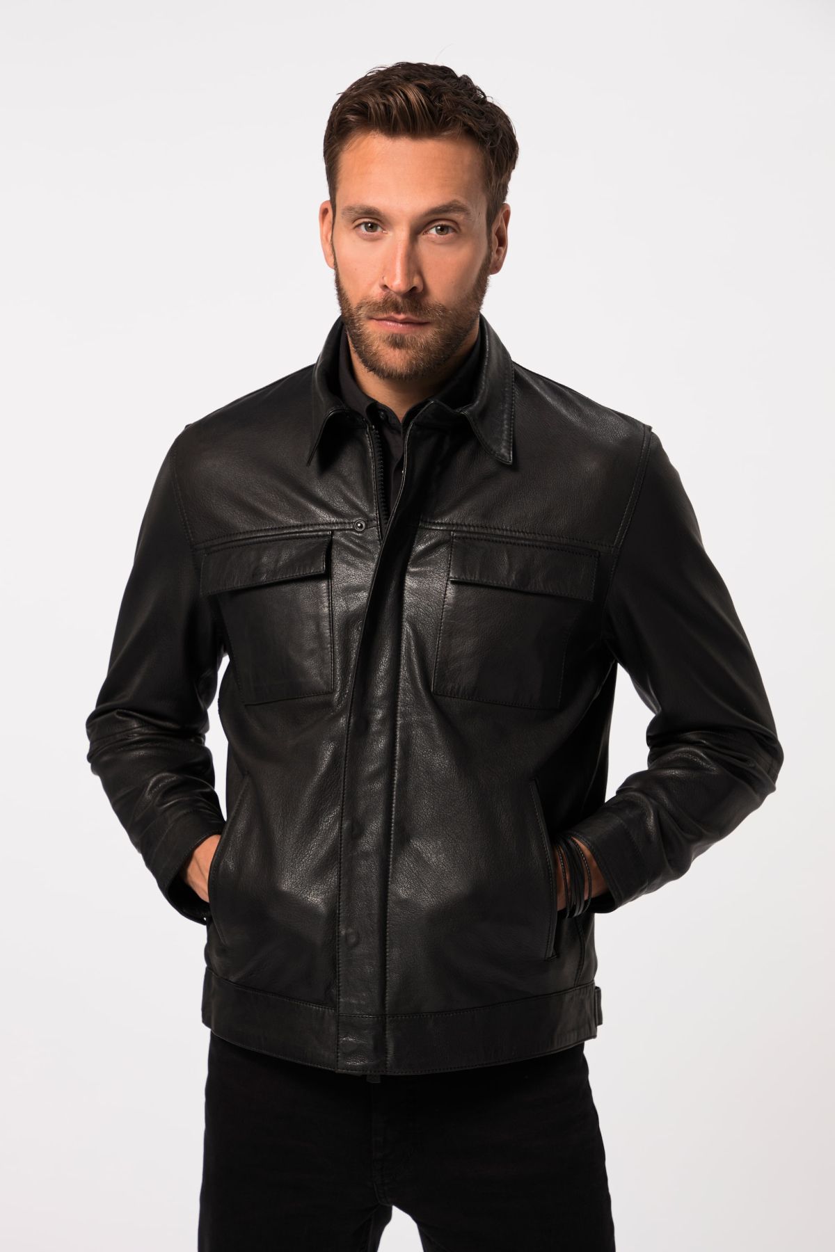 Яке от агнешка кожа с класически силует. С яка и закопчаване с цип. С 2 външни джоба и 2 с капаци. Дълги ръкави с регулиращ маншет. С подплата с 2 джоба и оптимален комфорт за всеки размер.