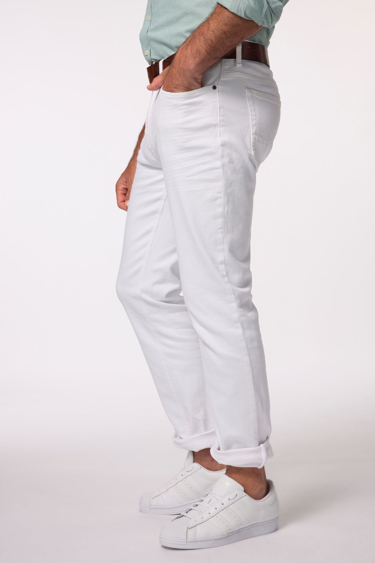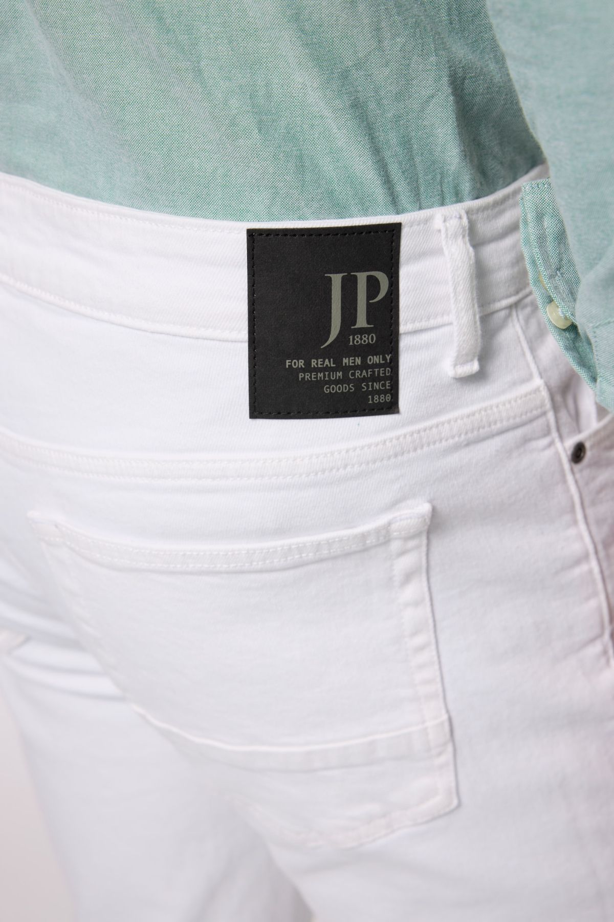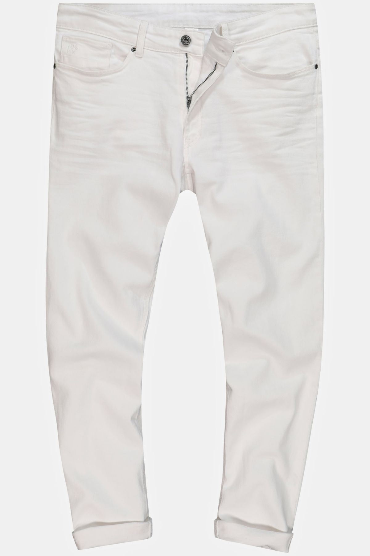 Дънки с изчистен силует. Дизайн с 5 джоба, фиксирана талия с гайки за колан, копче и цип отпред.