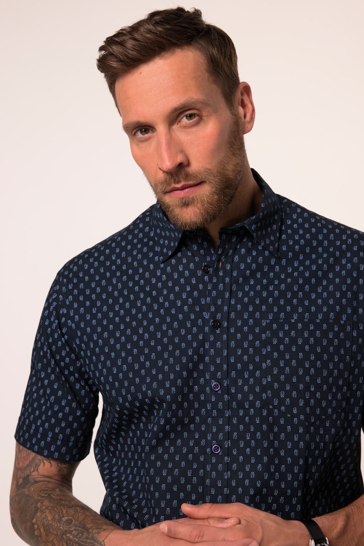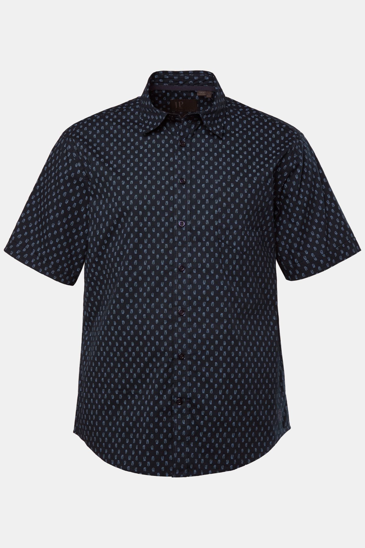 Риза със ситен принт с кент яка, джоб на гърдите и къси ръкави. С модерна кройка и оптимален комфорт за всеки размер постигнат с допълнително копче за по - големите размери.