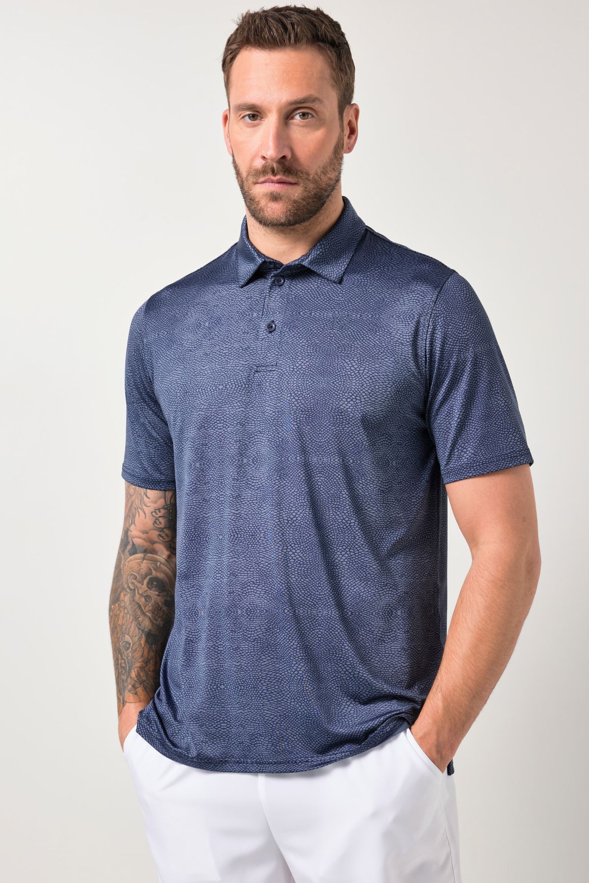 Тениска JAY-PI FLEXNAMIC с яка на риза, частично предно закопчаване с копчета и бродиран надпис. Изработена от бързосъхнеща материя с абстрактен принт и къси ръкави.