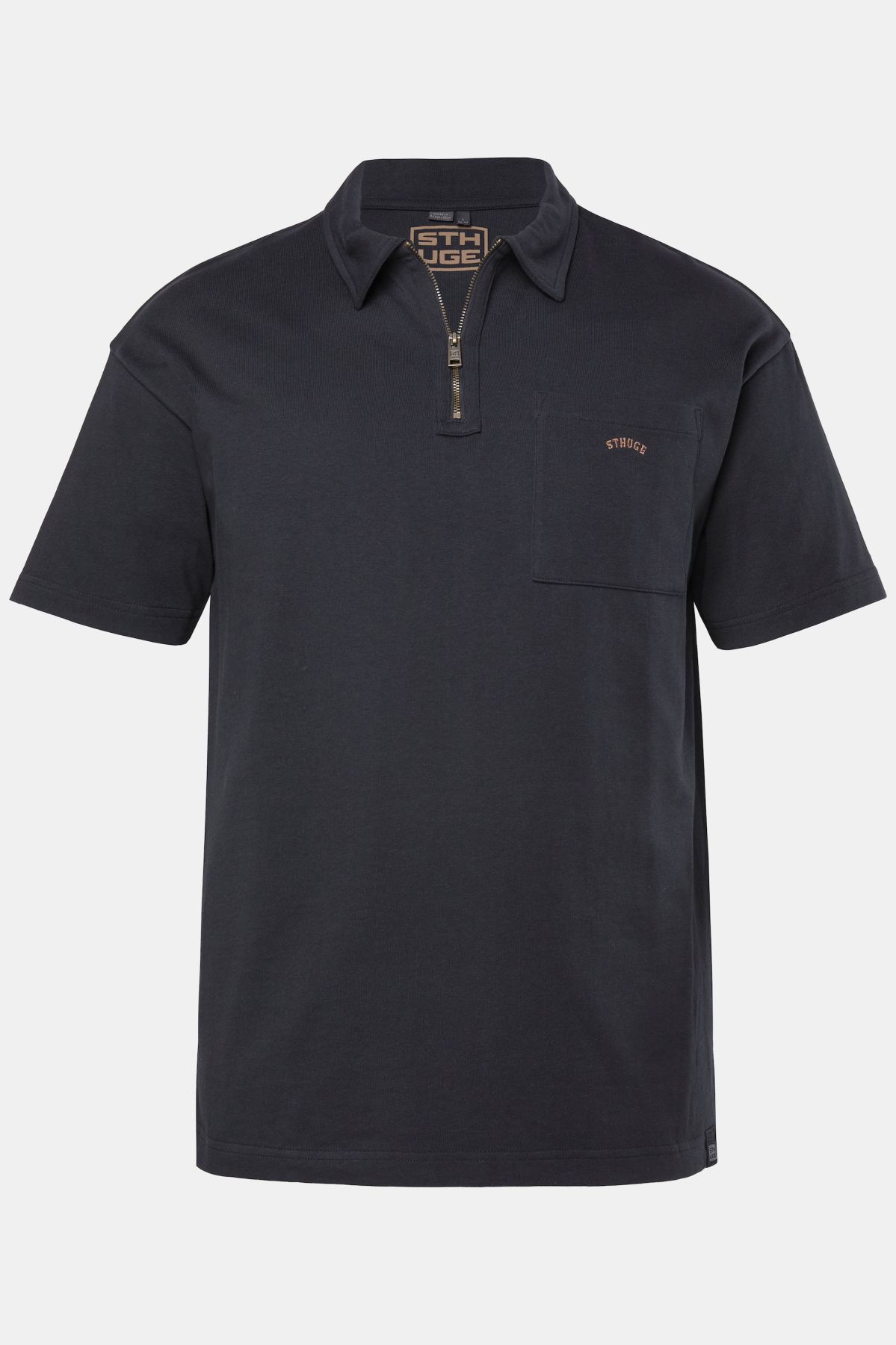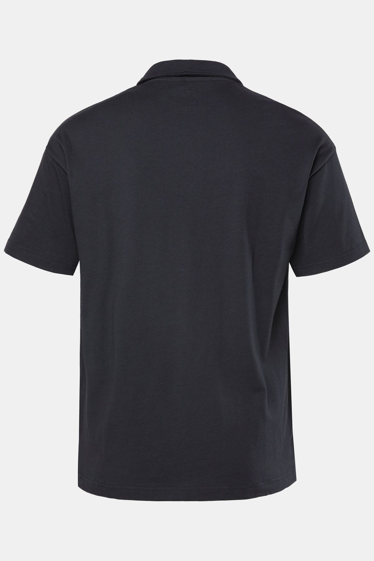 Тениска с много разкроена визия и частично закопчаване с цип. Мека яка тип риза, къси ръкави с маншет, преден джоб с надпис и странични цепки за по-голям комфорт. От меко трико.