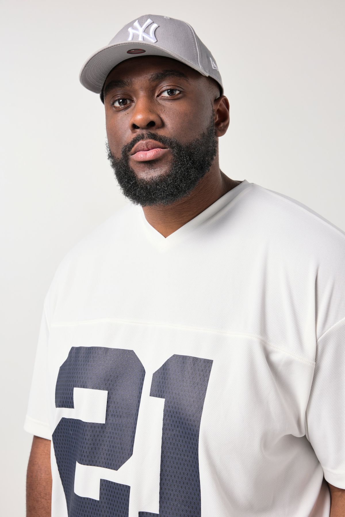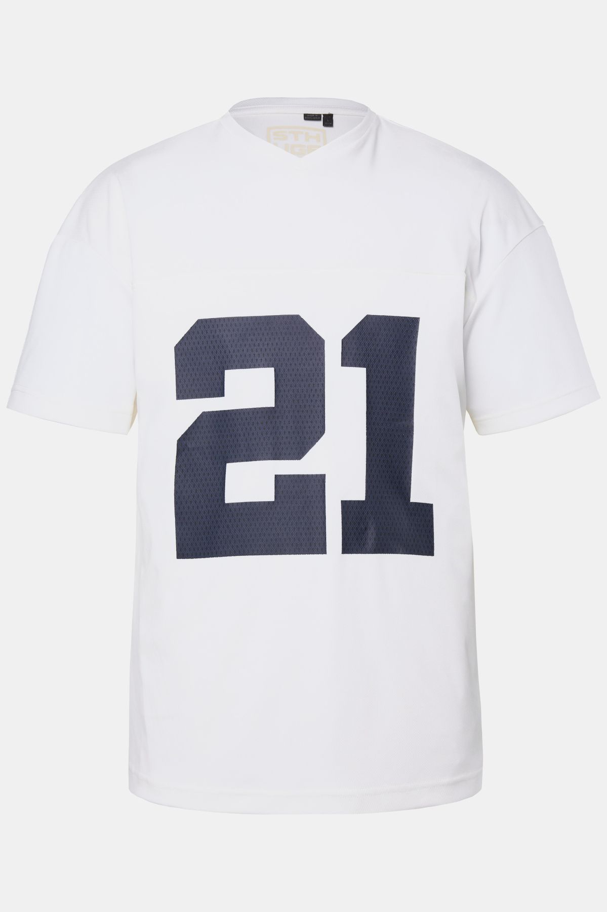 Тениска с овърсайз кройка и V-образно деколте. Къси ръкави, голяма щампа с номер на гърдите. Изработена от мрежеста дишаща материя.