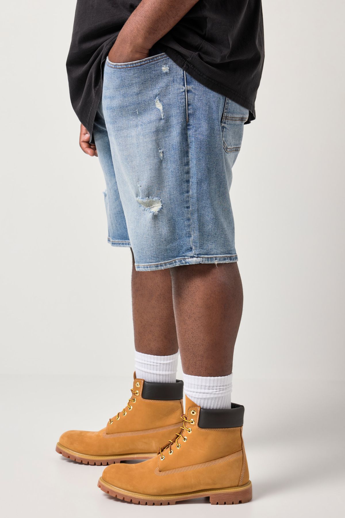 Дънкови бермуди STHUGE с накъсани ефекти. С фиксирана талия с гайки за колан, копче и цип отпред. Дизайн с 5 джоба и комфортна кройка.