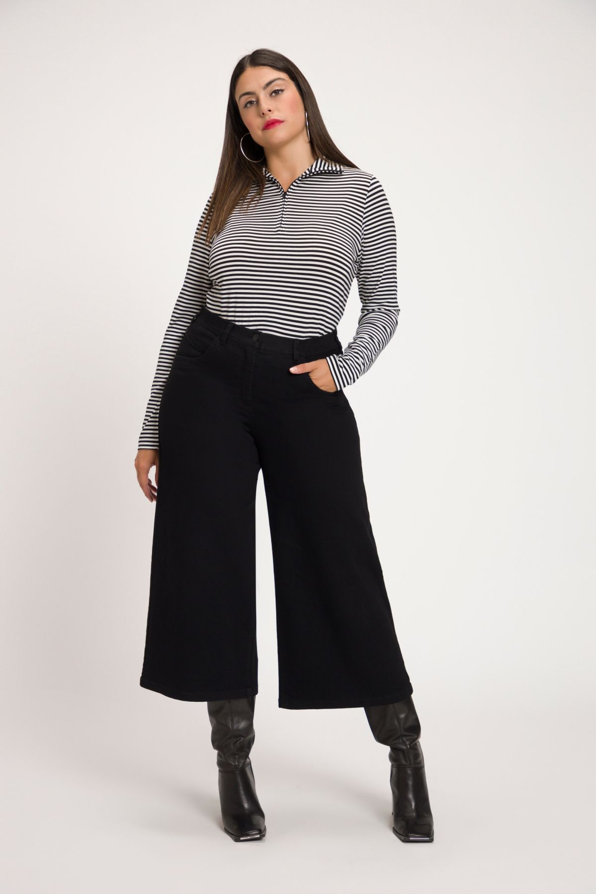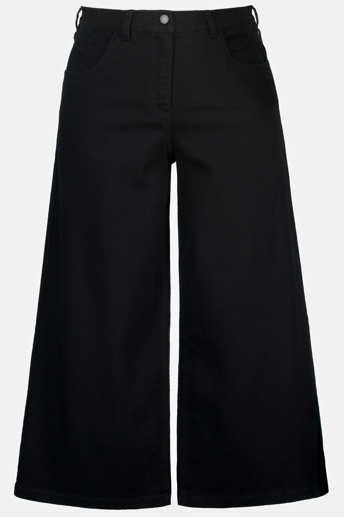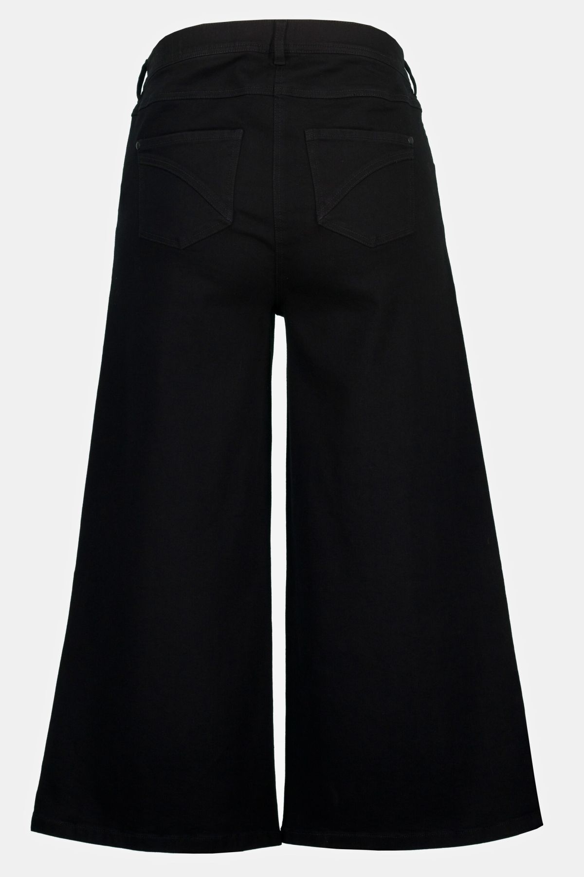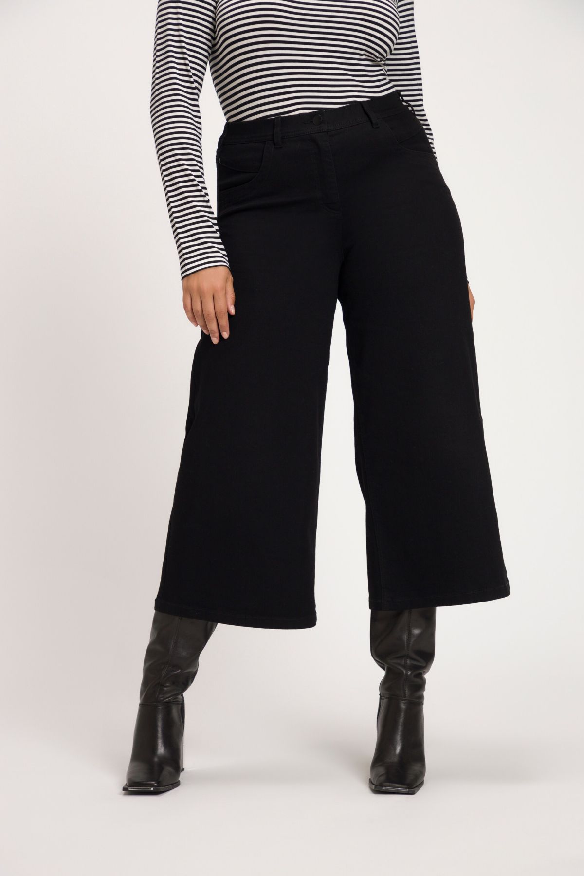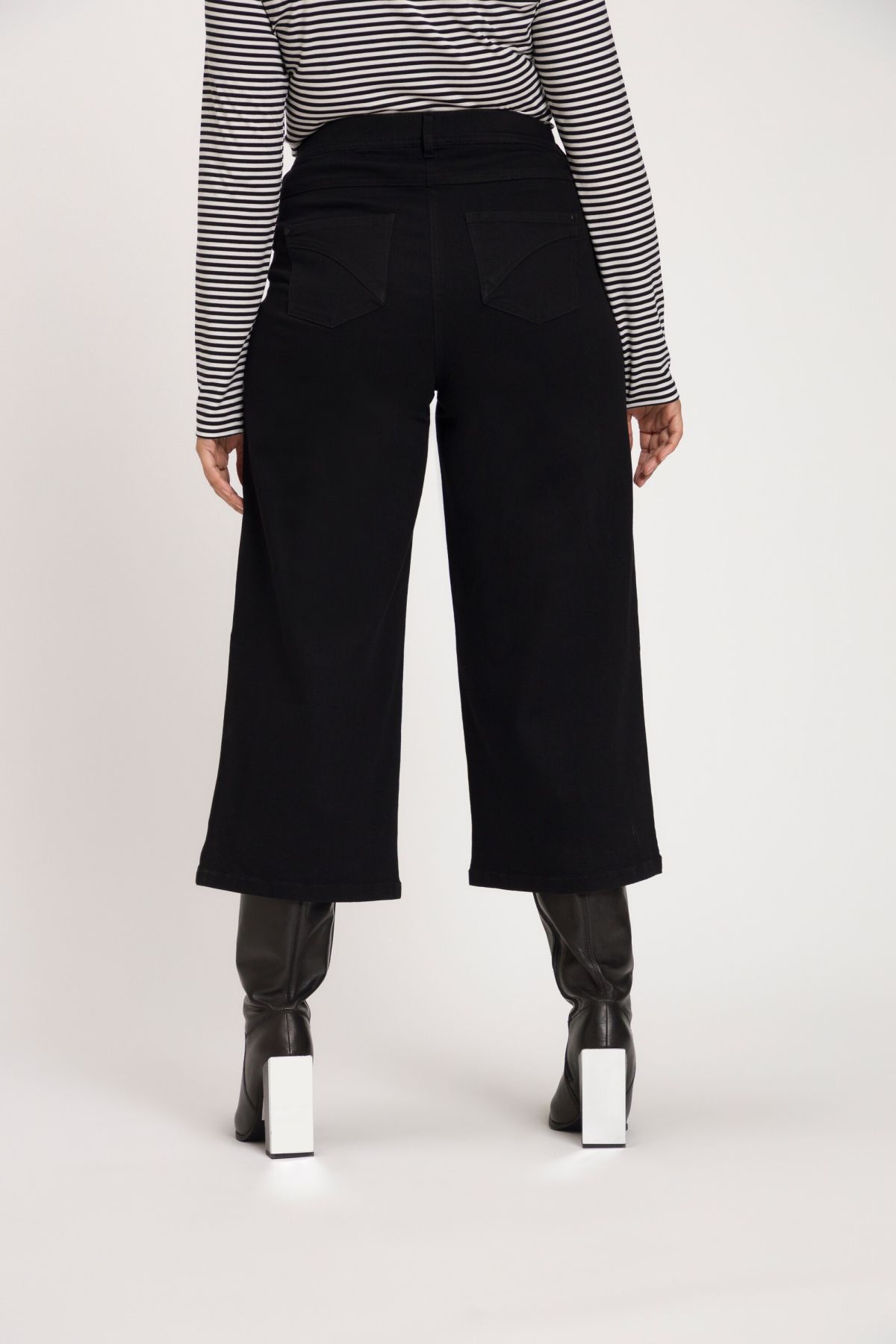 Еластични деним кюлоти – комбинация от удобни широки крачоли и висока талия, която подчертава фигурата – съвършеното модно съчетание. Моделът разполага с комфортен еластичен колан, гайки за колан, закопчаване с копче и цип отпред, предни джобове и външни задни джобове.