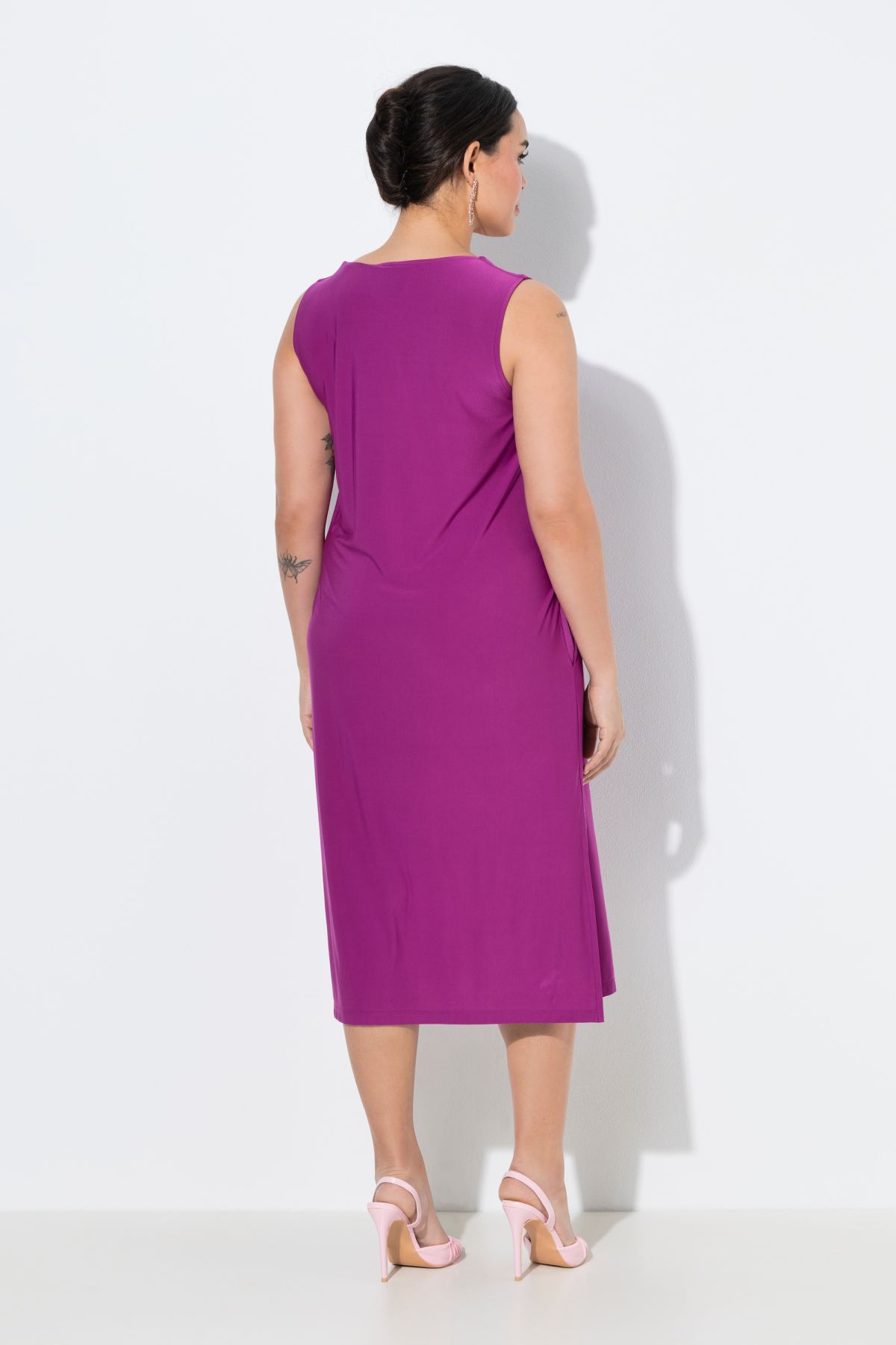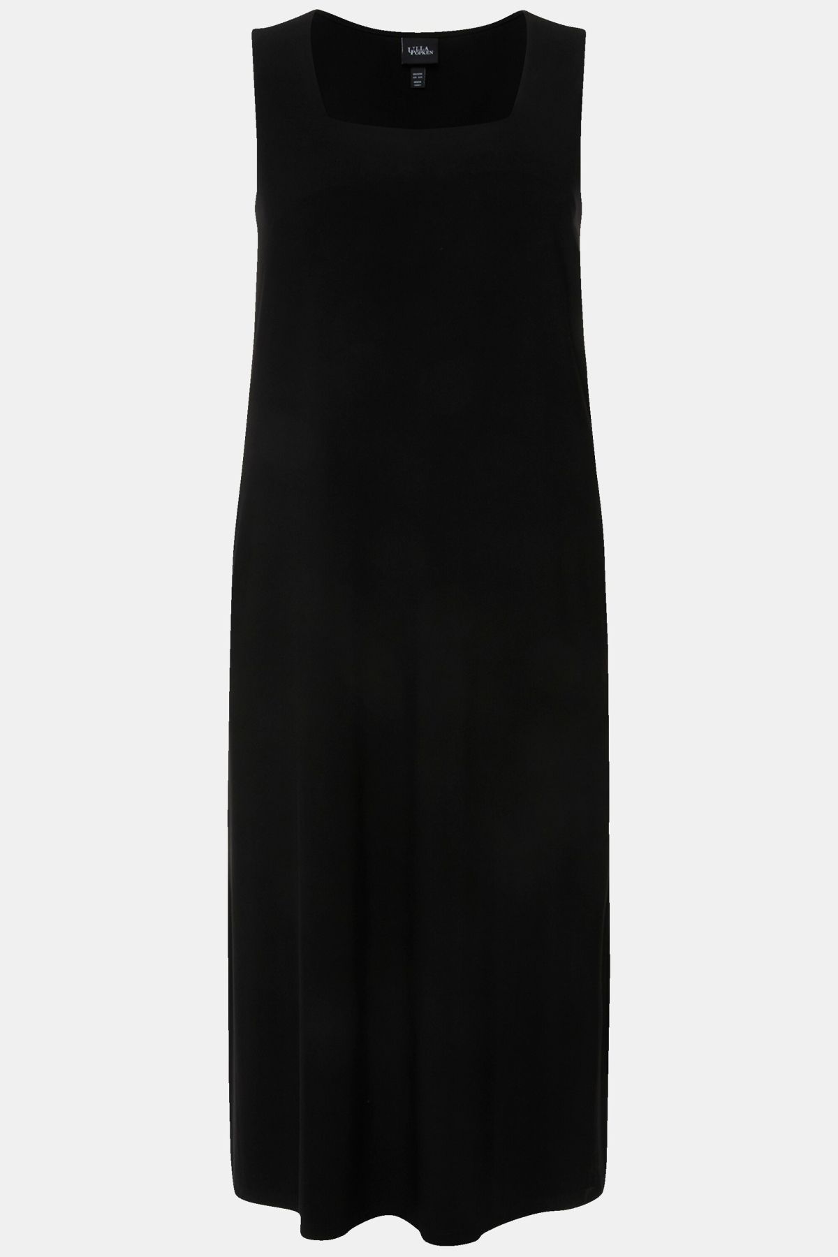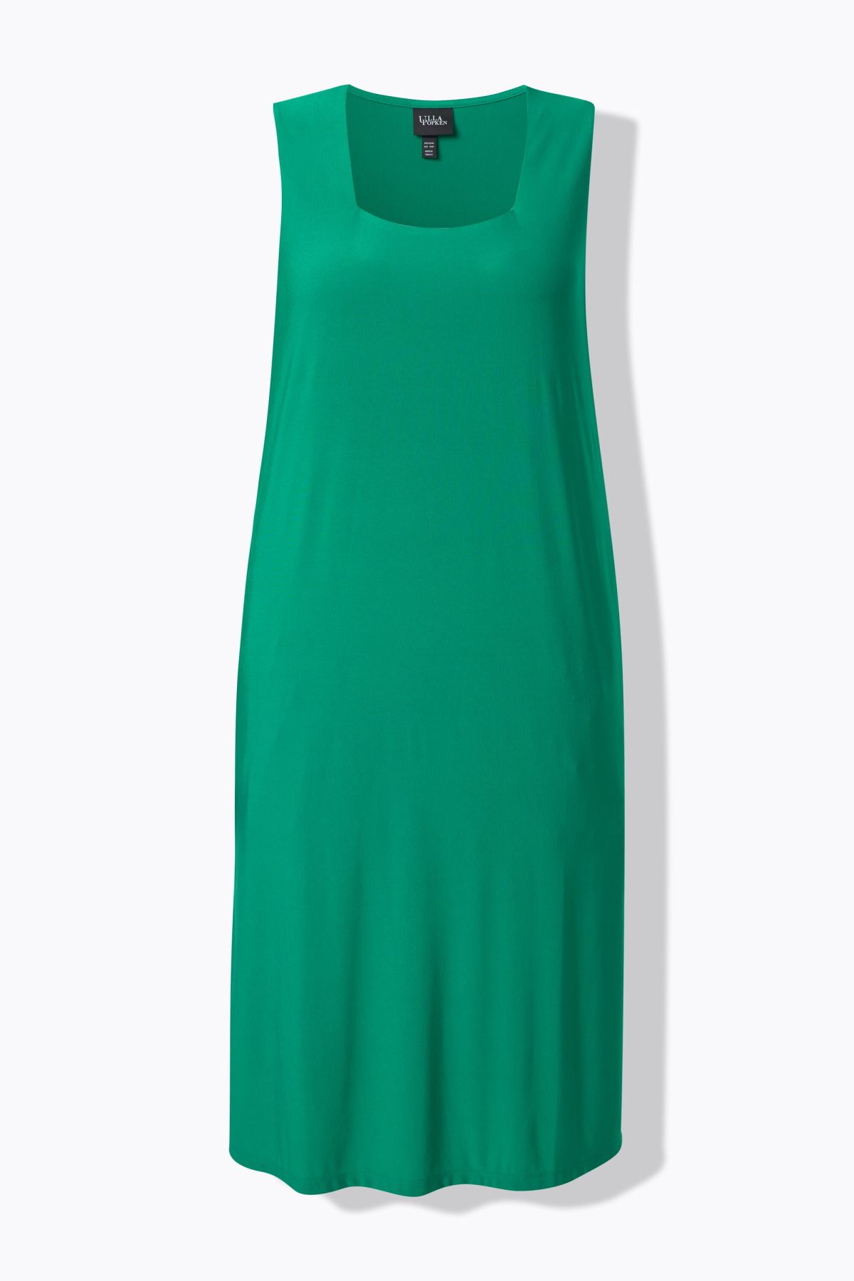 Трикотажна рокля с модерно квадратно деколте. Дизайн с комфортни, широки презрамки без ръкави. С дълбоки странични цепки.