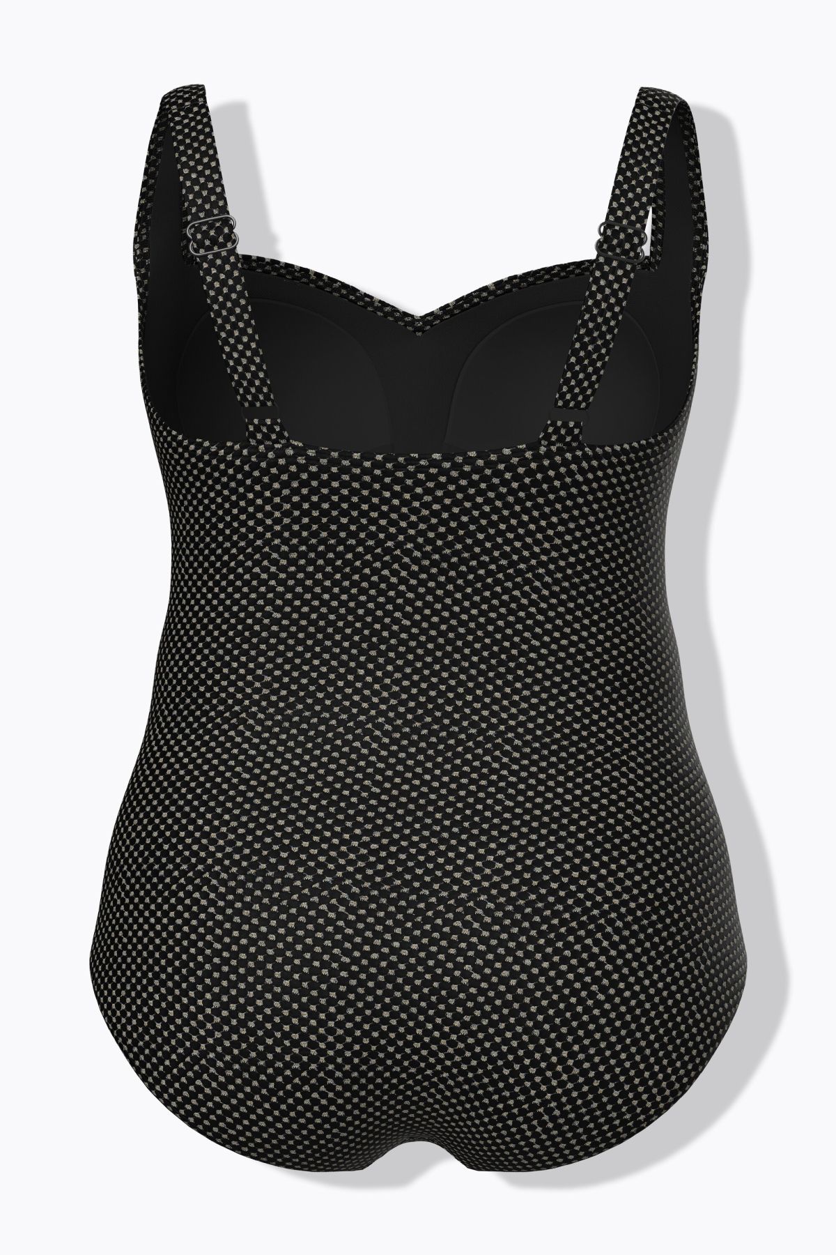 Бански с драпиран акцент на бюста и метални, бляскави акценти. С широки презрамки, оформени чашки, еластична лента под бюста за поддържане и подплата отпред.