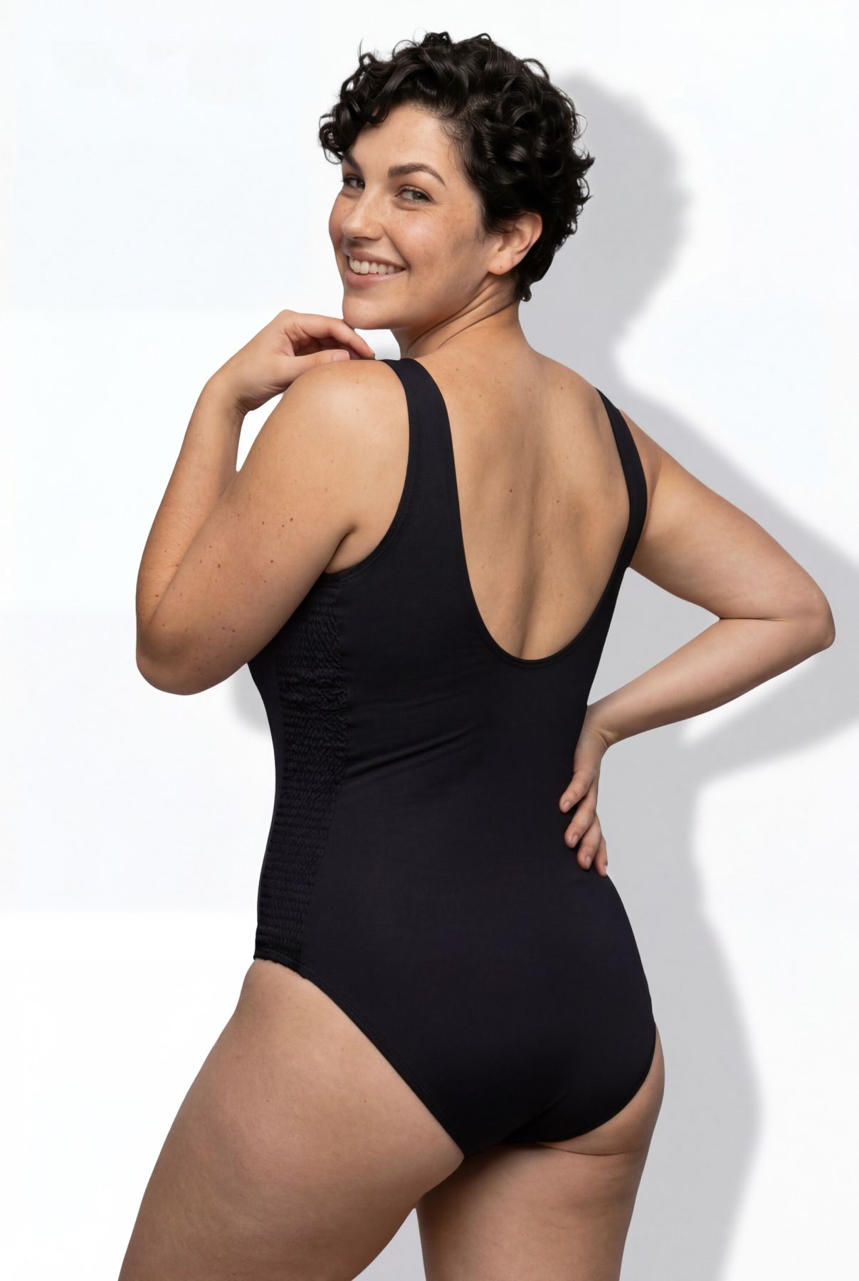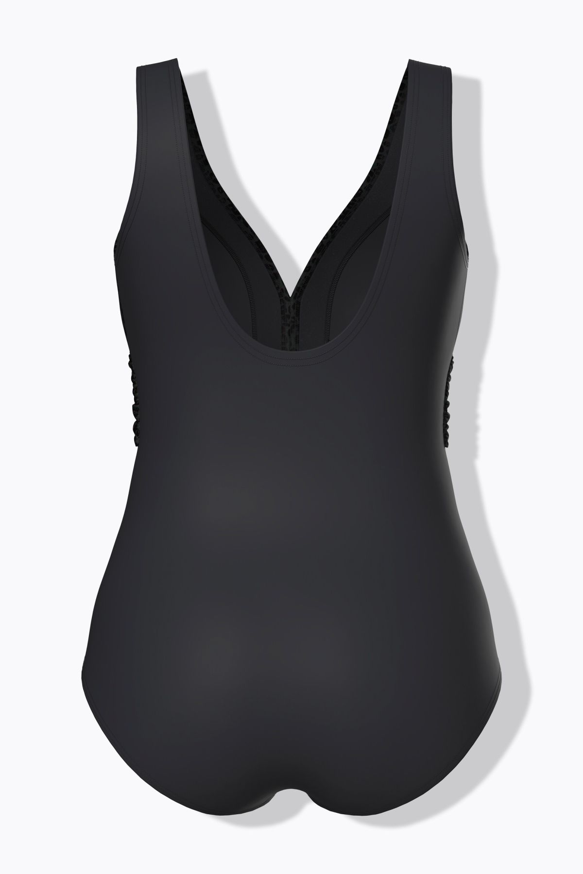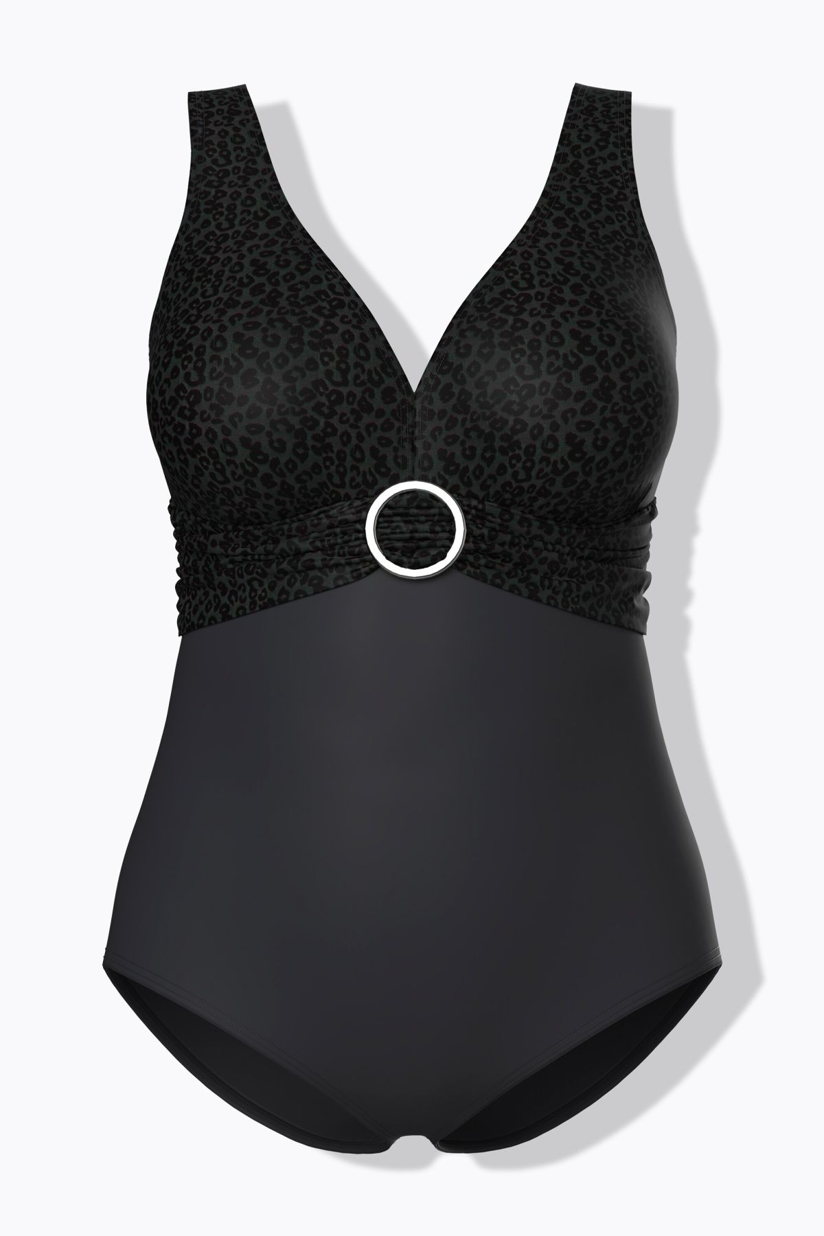 Бански с микс от материи и текстури. С метален О-ринг за акцент. С V - образно деколте и широки презрамки. С оформени чашки, еластична лента под бюста и подплата отпред.