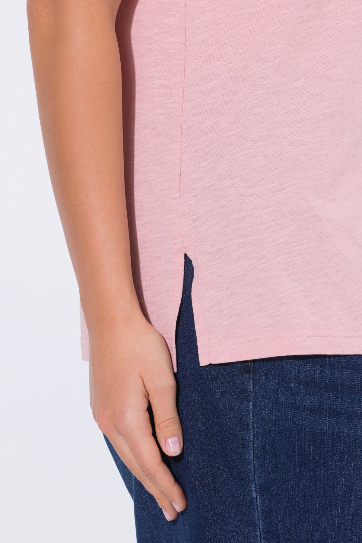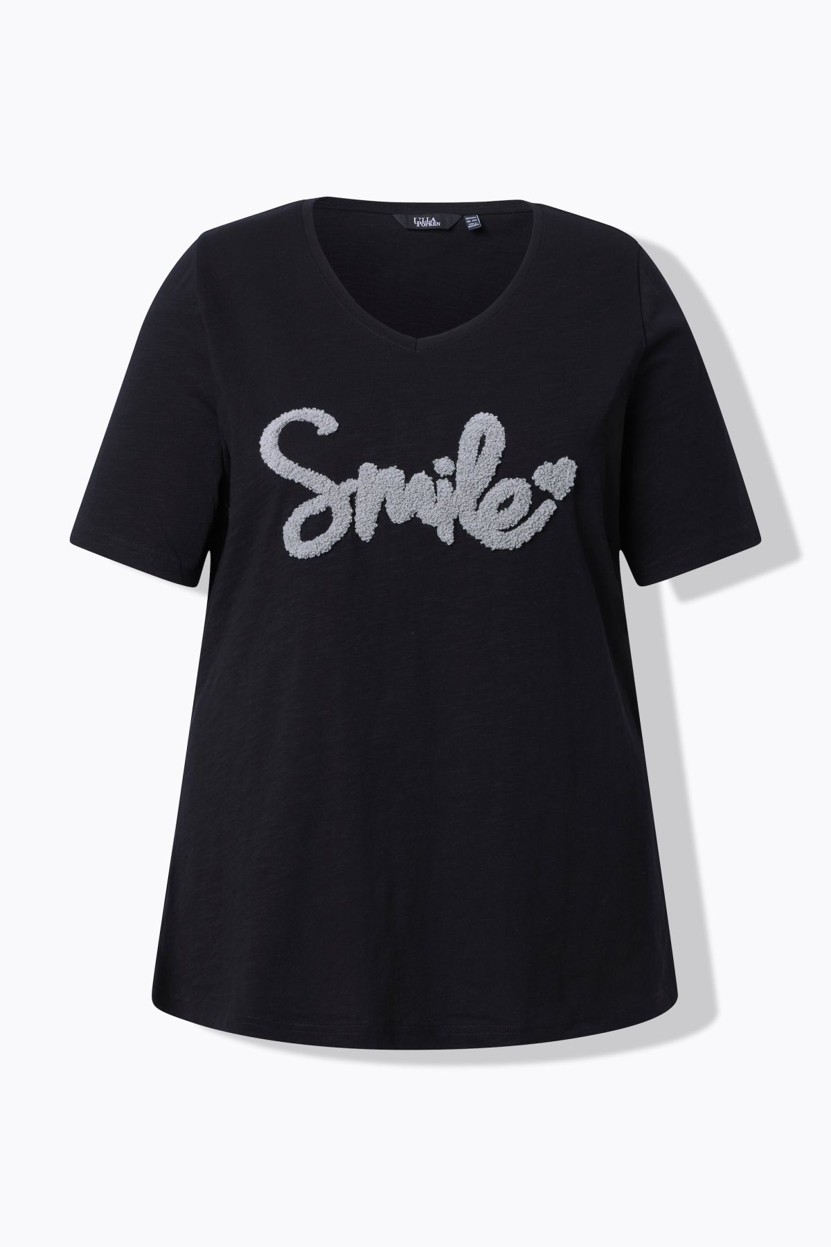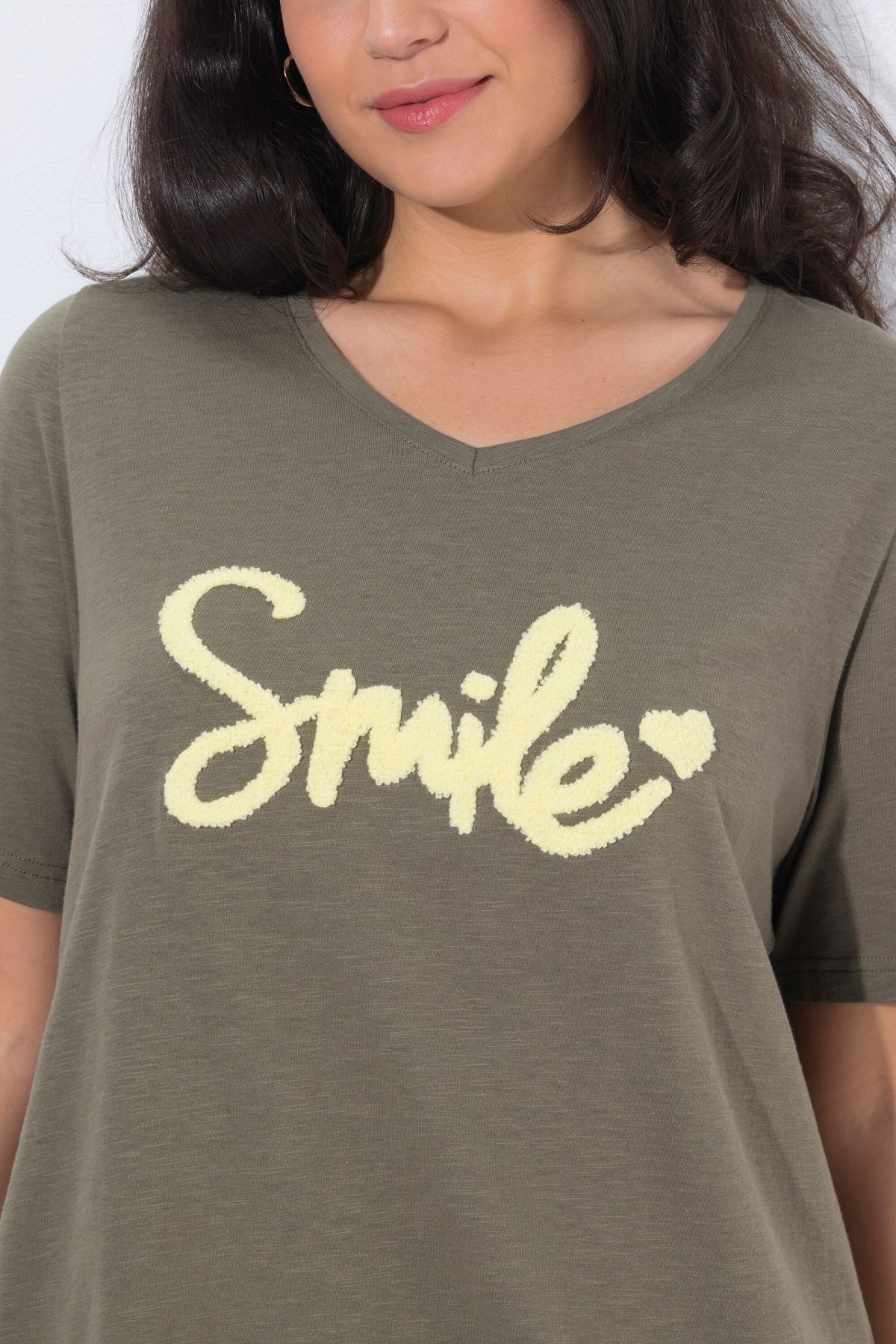 Тениска с графичен надпис Smile - позитивна и свежа. С V - образно деколте и къси ръкави. От мека, памучна материя.