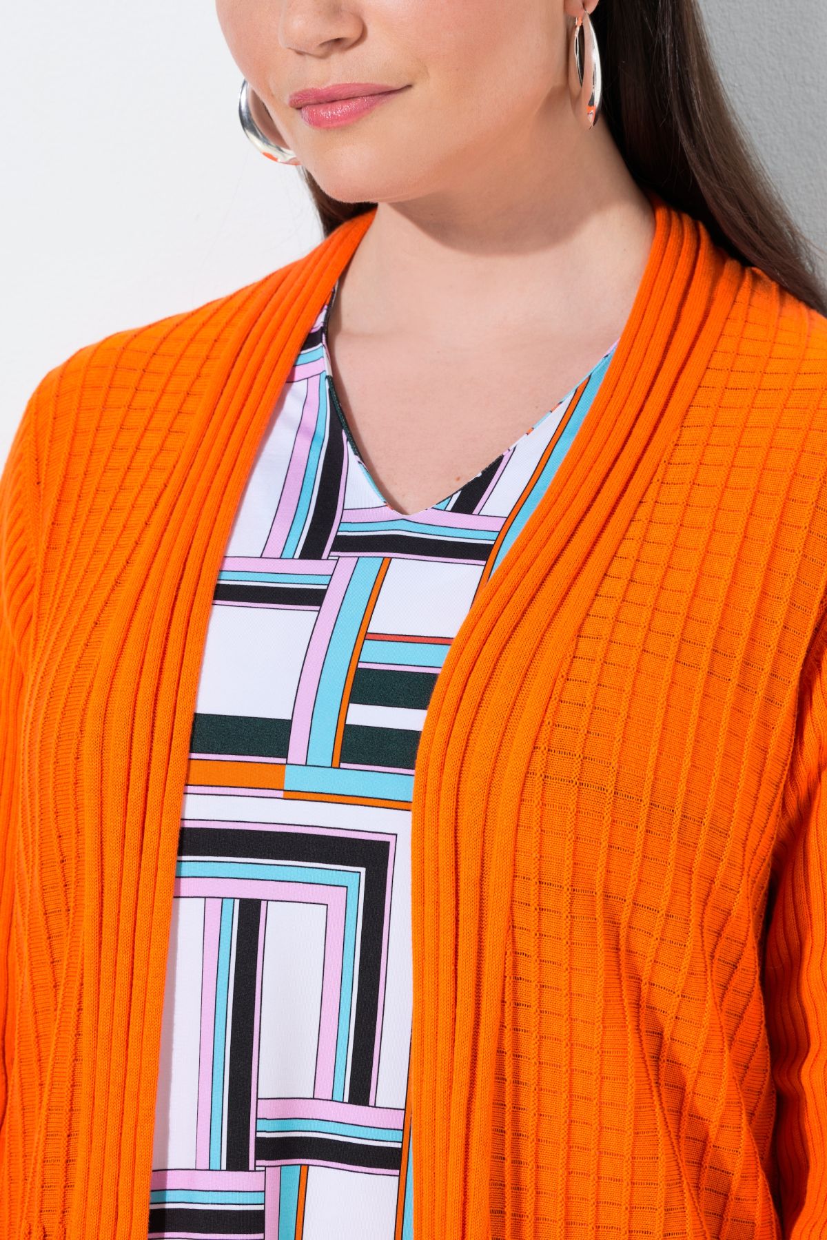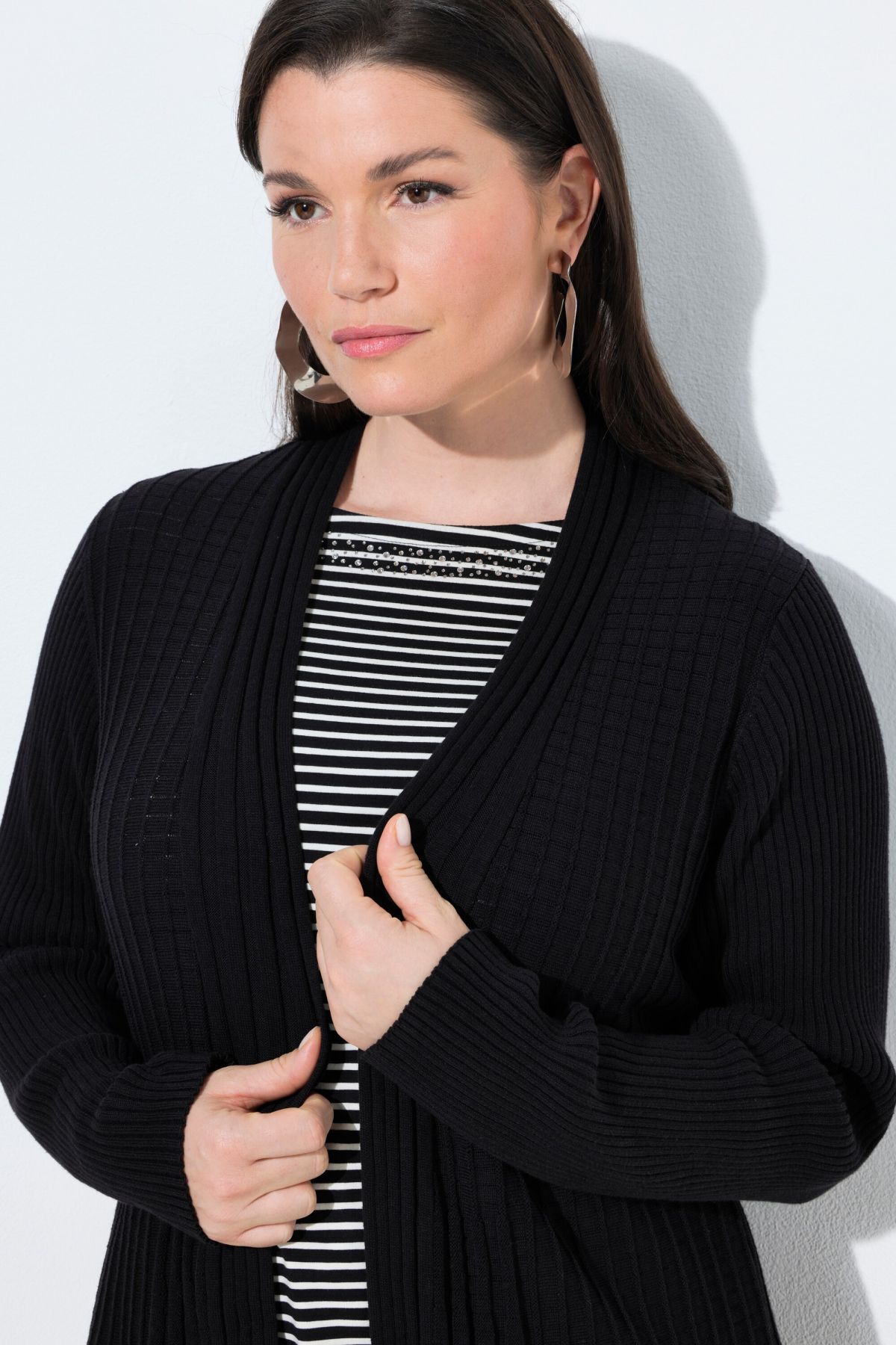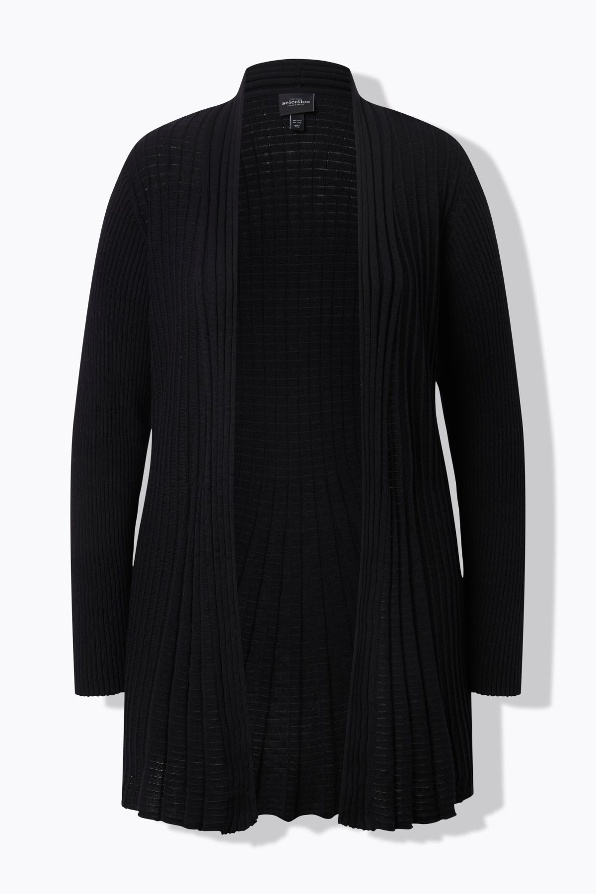 Плисирана жилетка с прозрачен завършек и драпирана падаща яка. С отворена форма с релаксираща ежедневна визия и дълги ръкави.