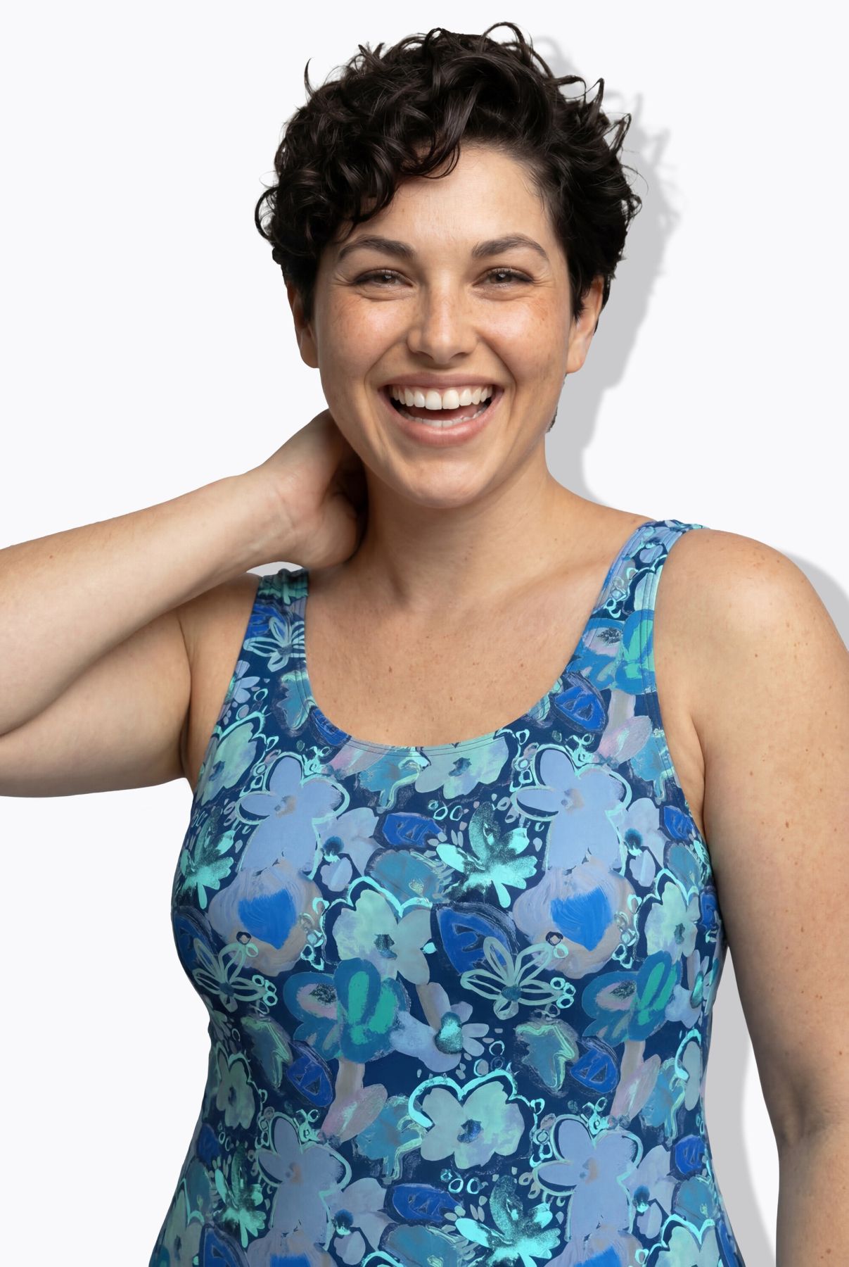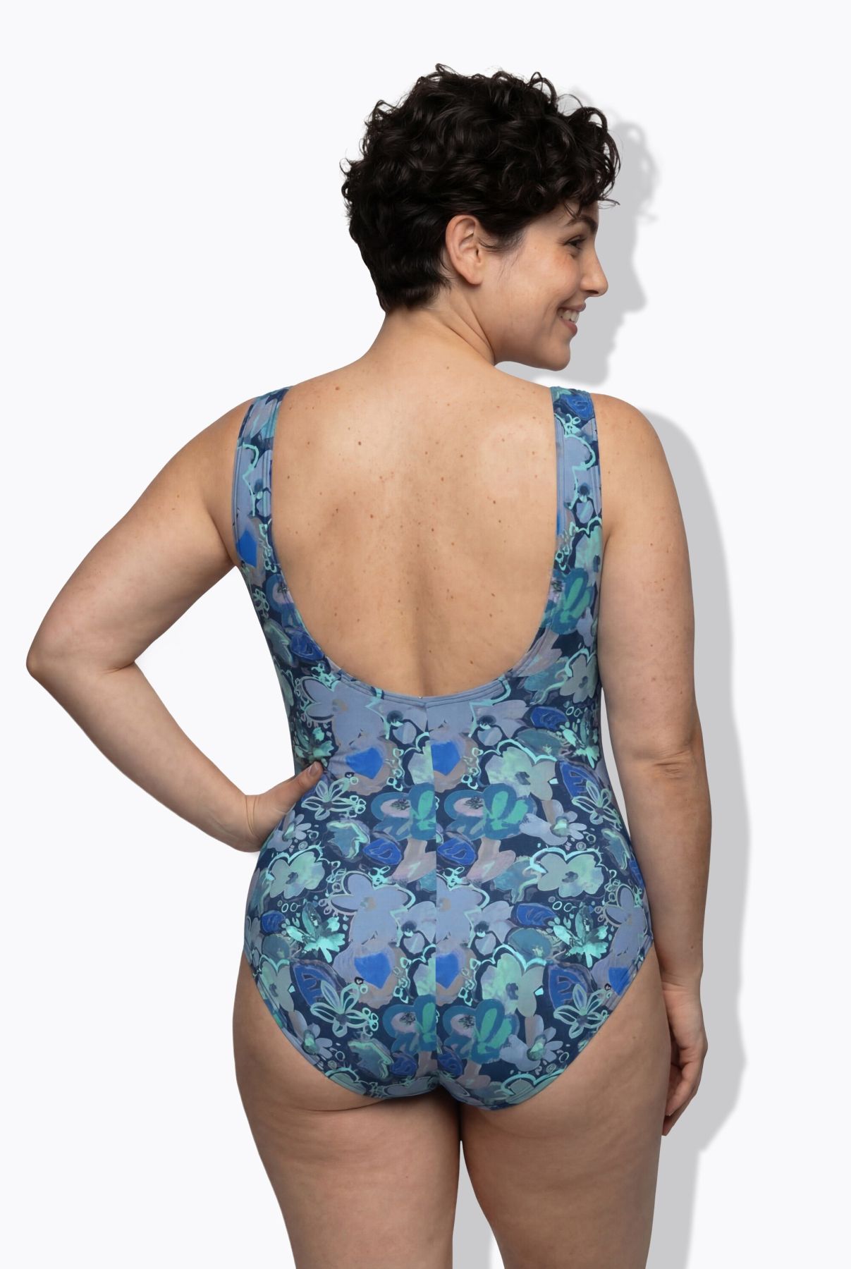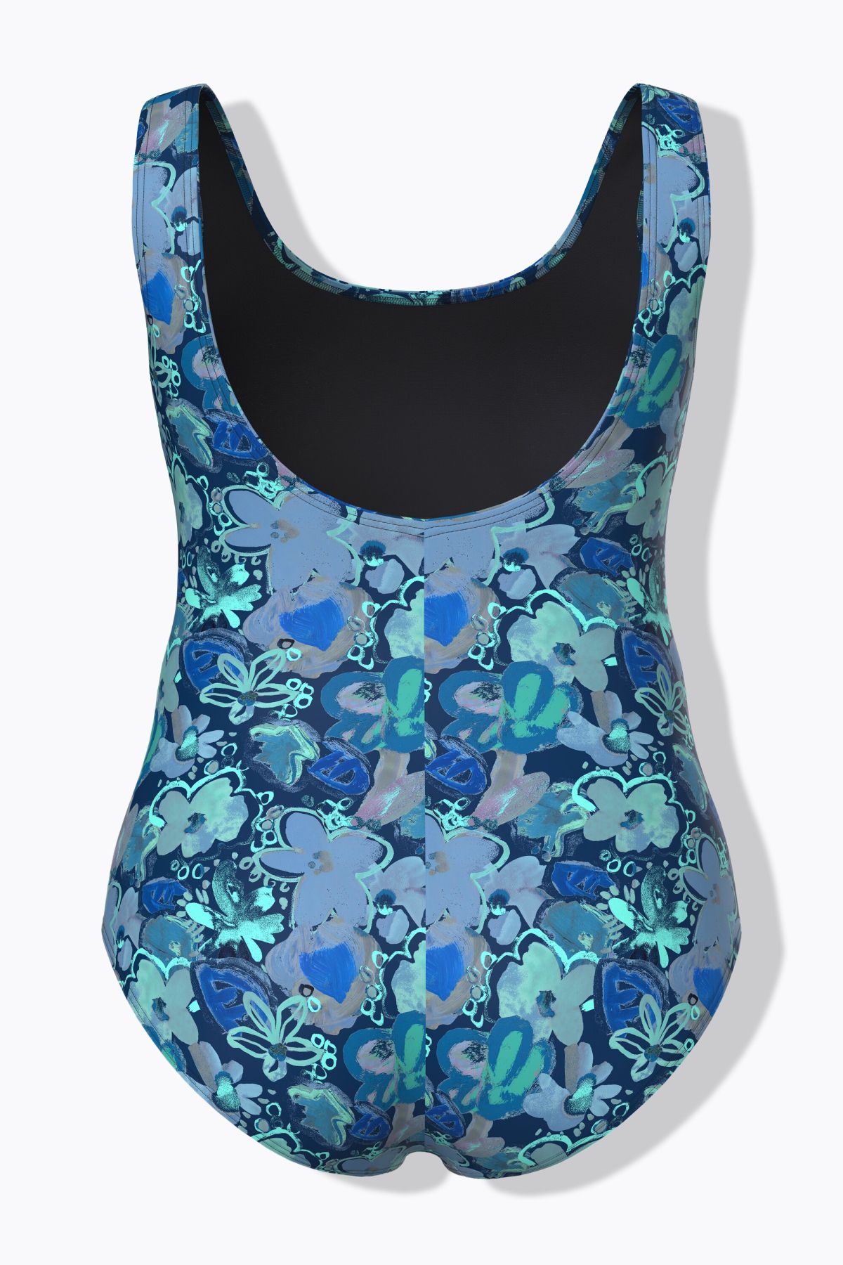 Бански с пастелен флорален принт в спортен силует. Дизайн с кръгло деколте, без оформени чашки, еластична лента под бюста и подплата отпред.