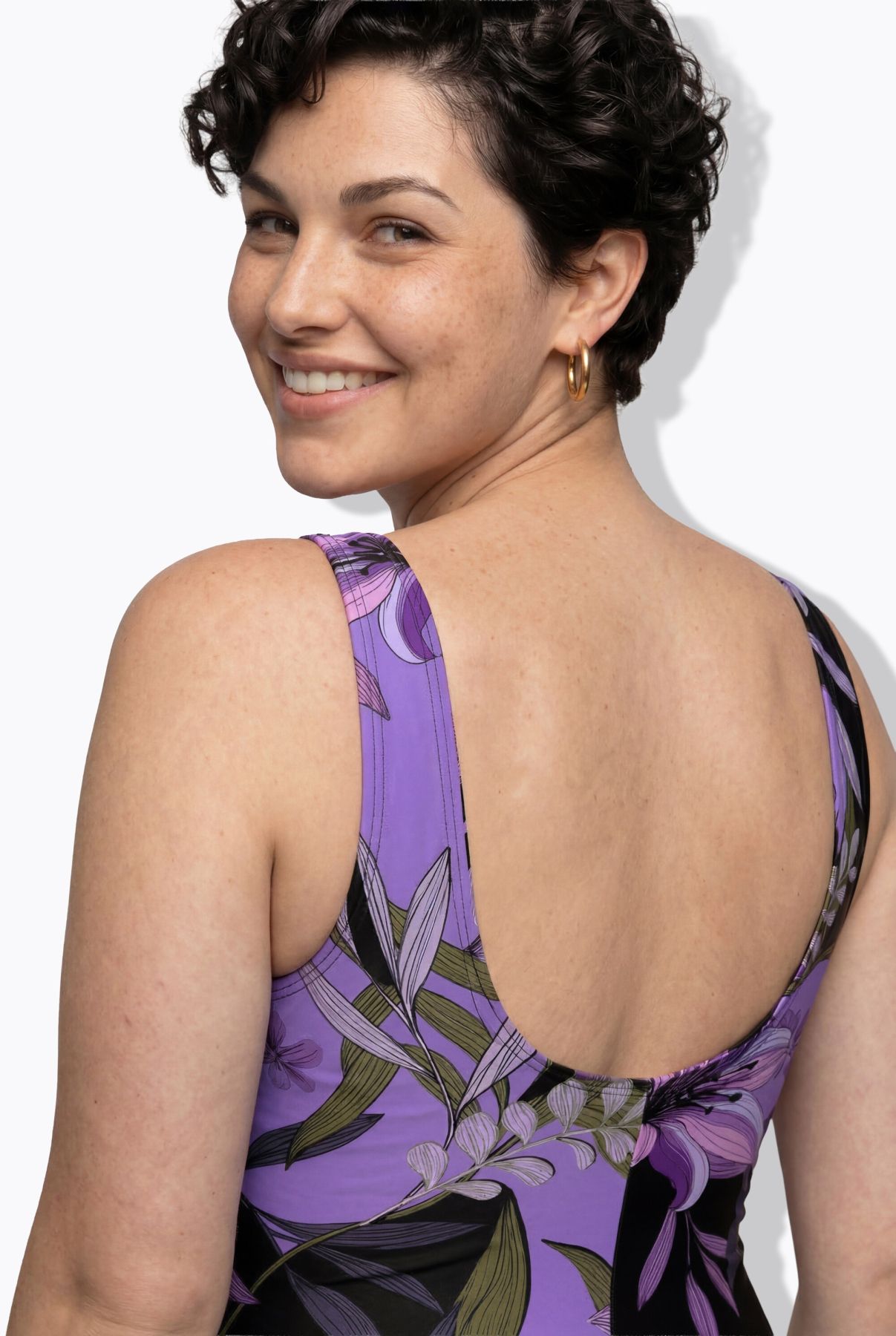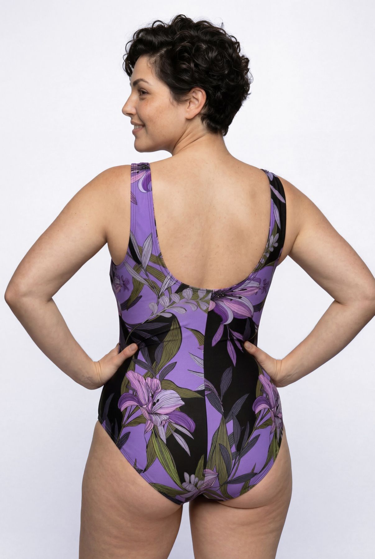 Бански с принт на лилии с широки удобни презрамки. Еластична поддържаща лента под бюста, без оформени чашки, подплата на предната част, кръгло деколте. Подходящ за различни видове спорт.