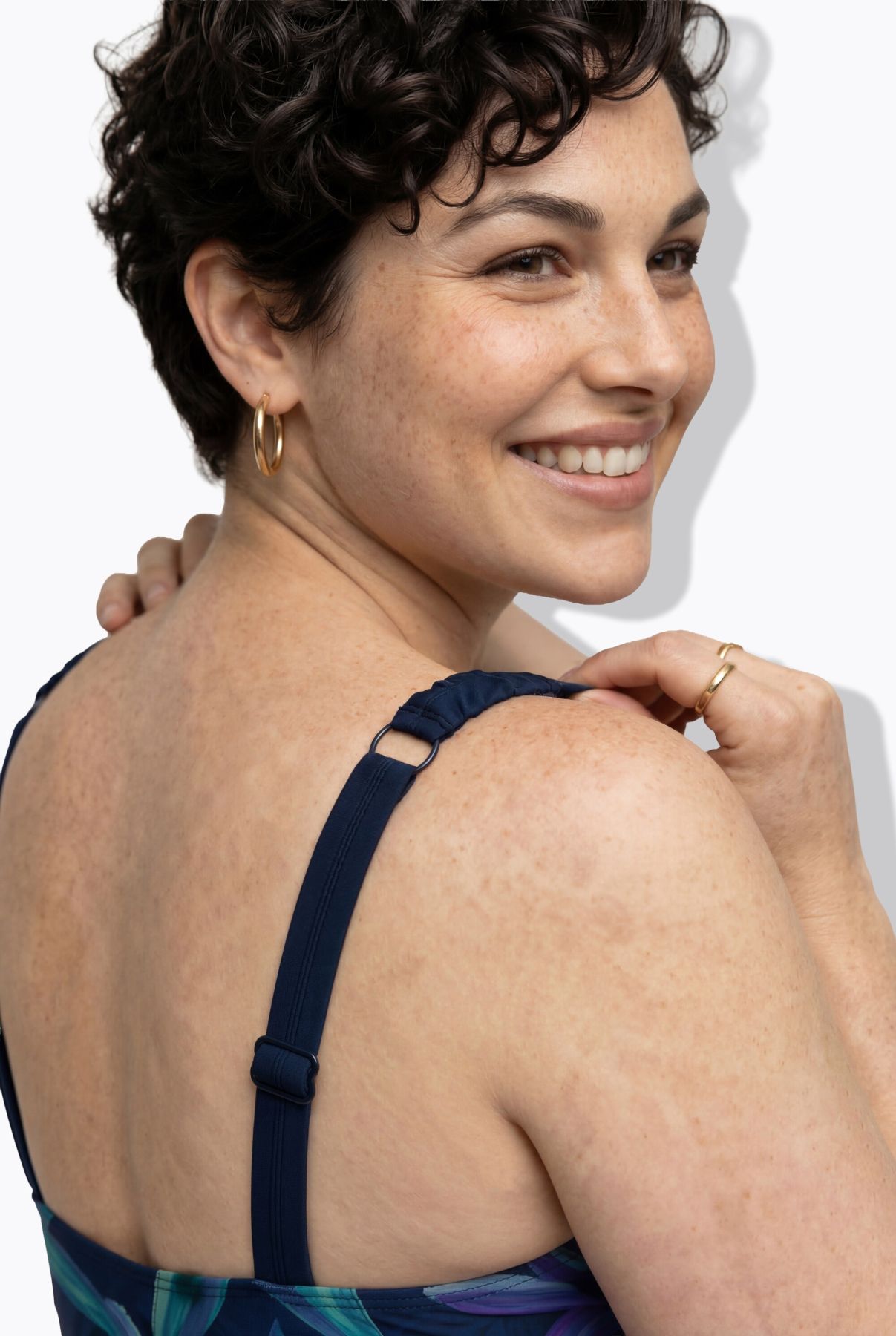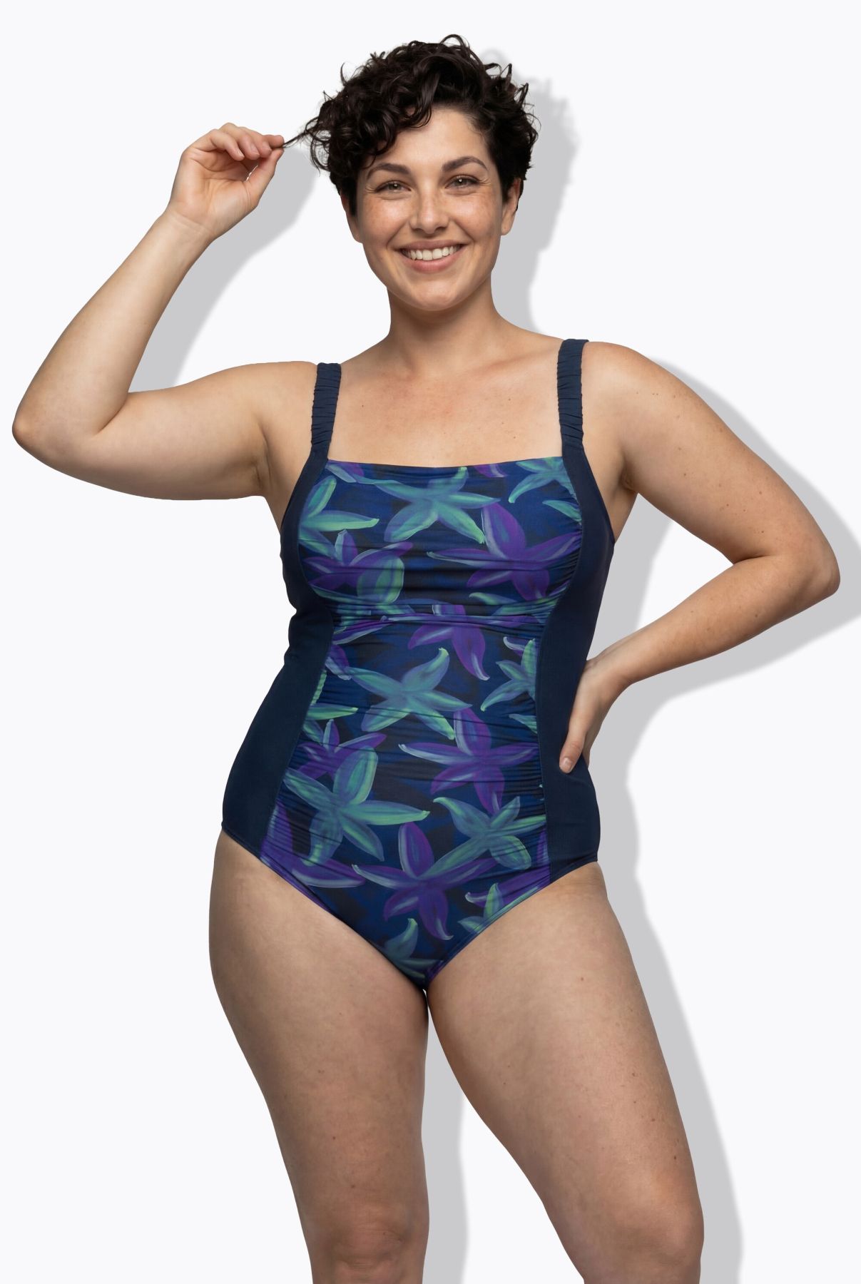 Бански с принт на цветя отпред и едноцветен отстрани. С женствен силует, оформени чашки, еластични презрамки, лента под бюста за поддържаме и подплата отпред. Изработен от рециклиран полиестер.