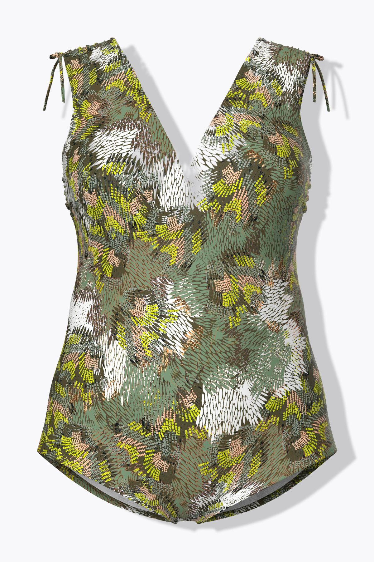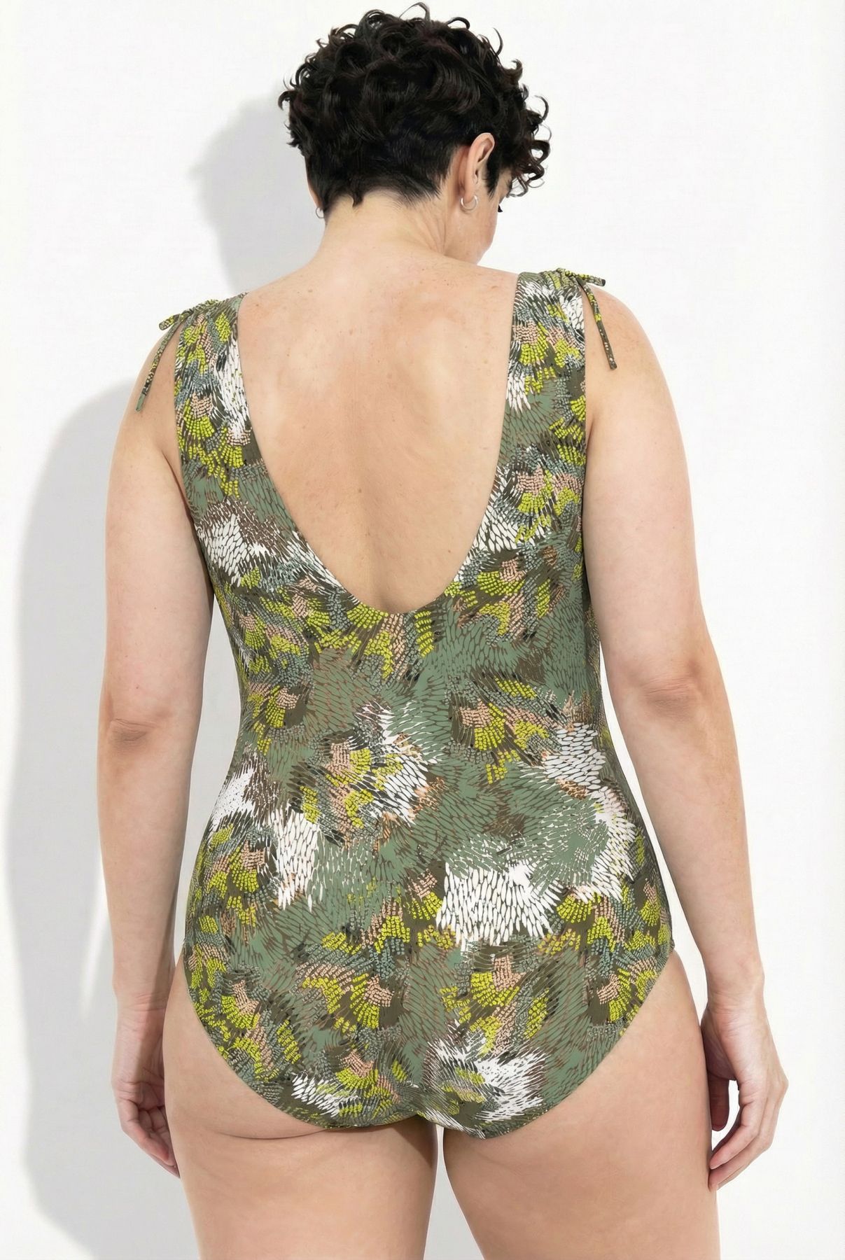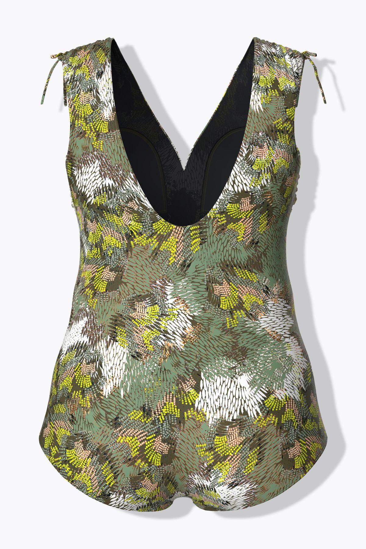 Бански с абстрактен принт на джунгла. С V - образно деколте, оформени чашки, еластична лента под бюста за поддържане и широки презрамки с връзки за акцент. С подлата отпред.