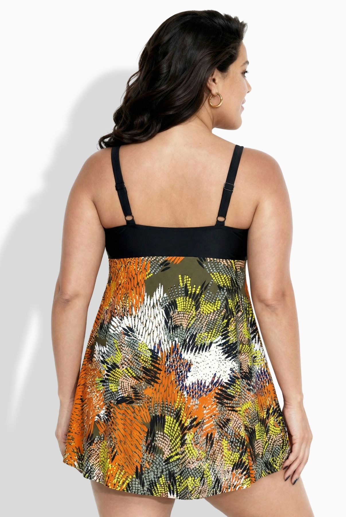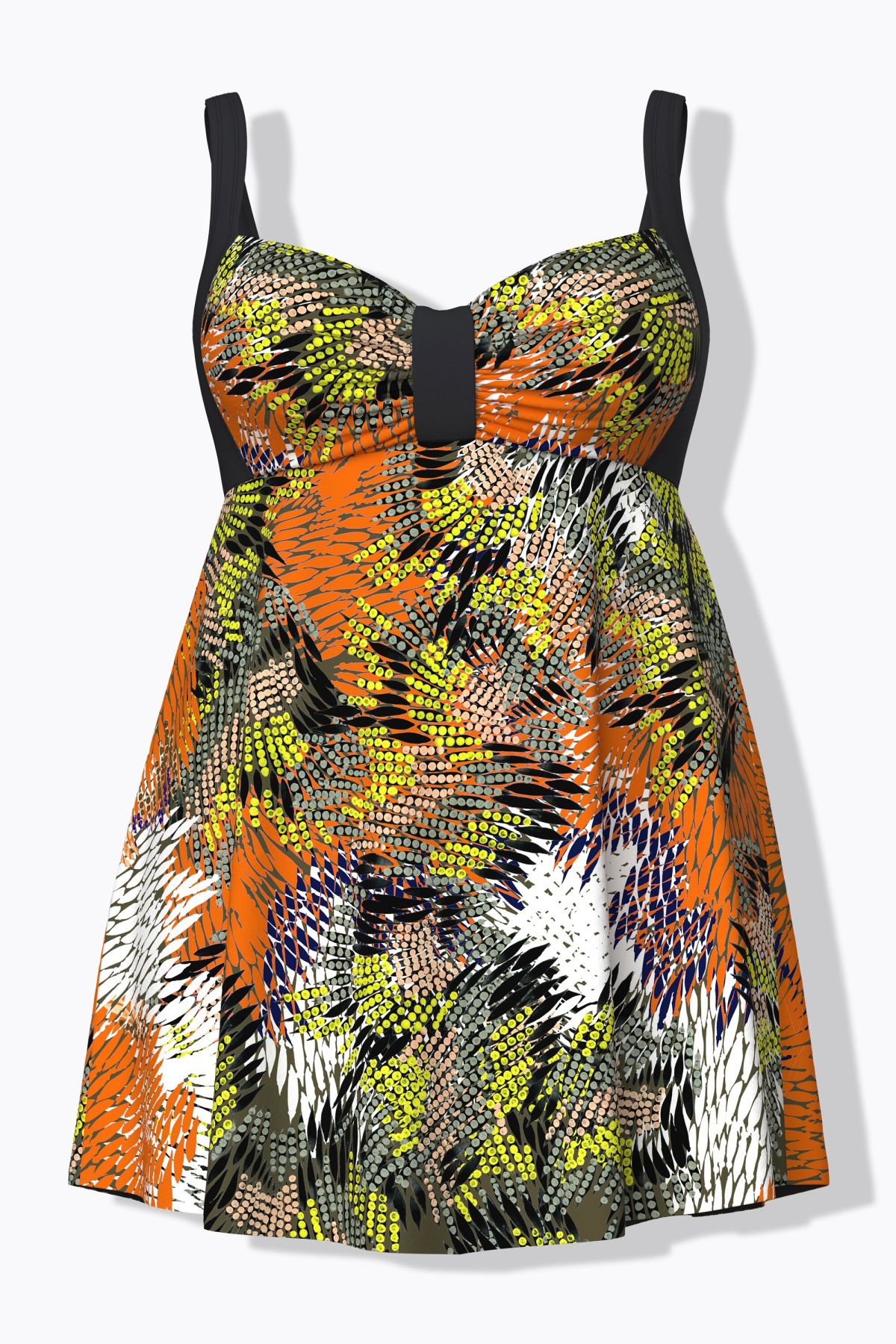 Бански тип рокля с принт на джунгла. С V - образно деколте, регулиращи се презрамки, оформени чашки, еластична лента под бюста за поддържане и мрежеста подплата.