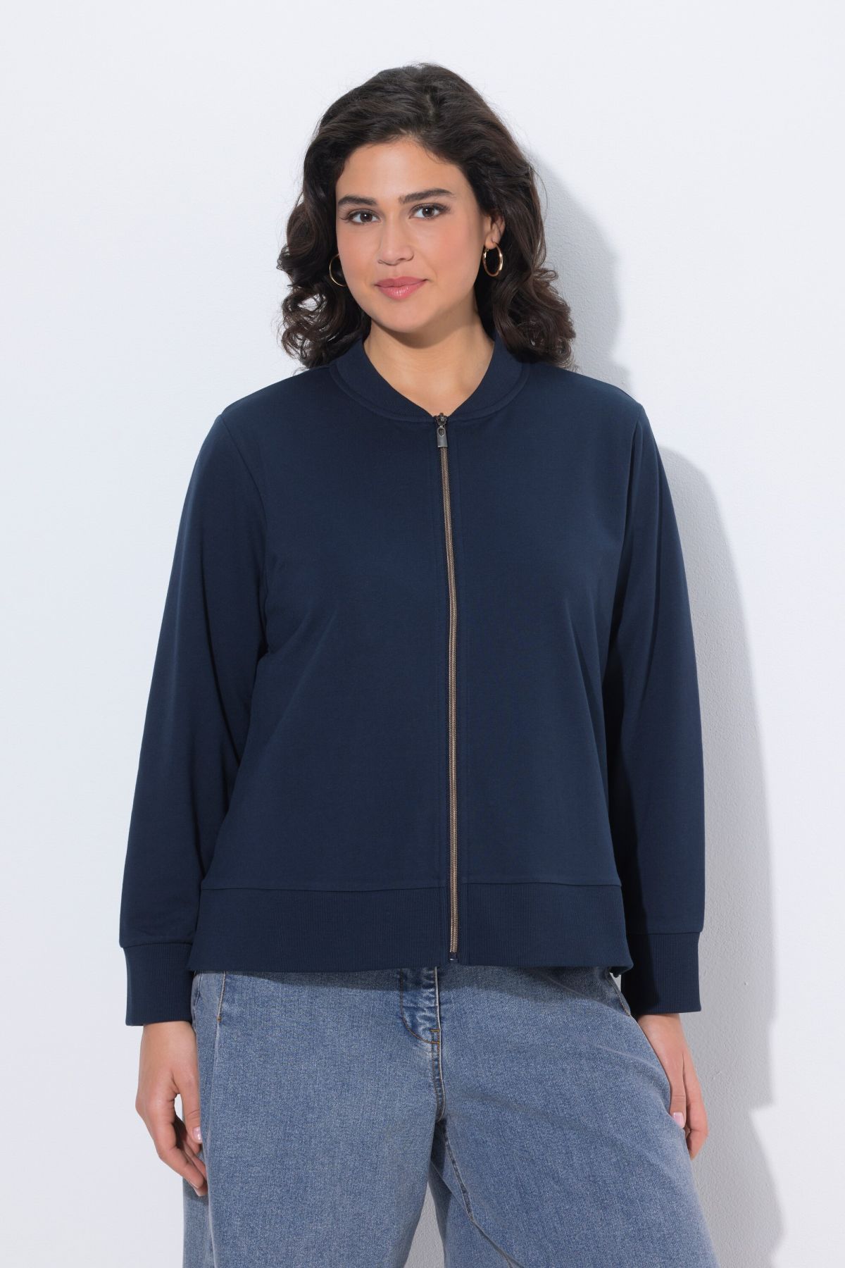 Суитчър с къса, свободна кройка. С колежанска яка, цип отпред и дълги ръкави. Рипсени маншети и странични цепки на подгъва за повече комфорт.