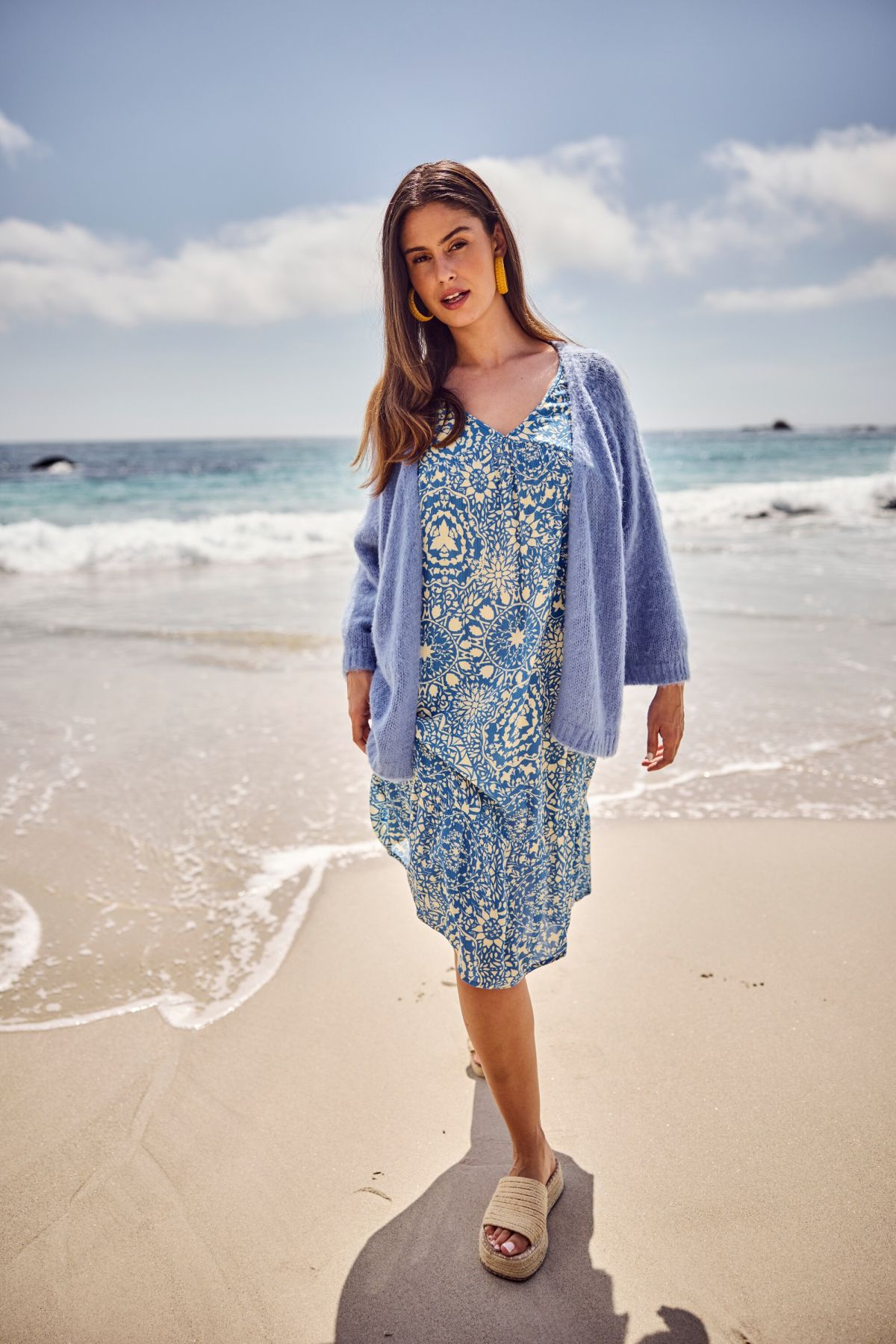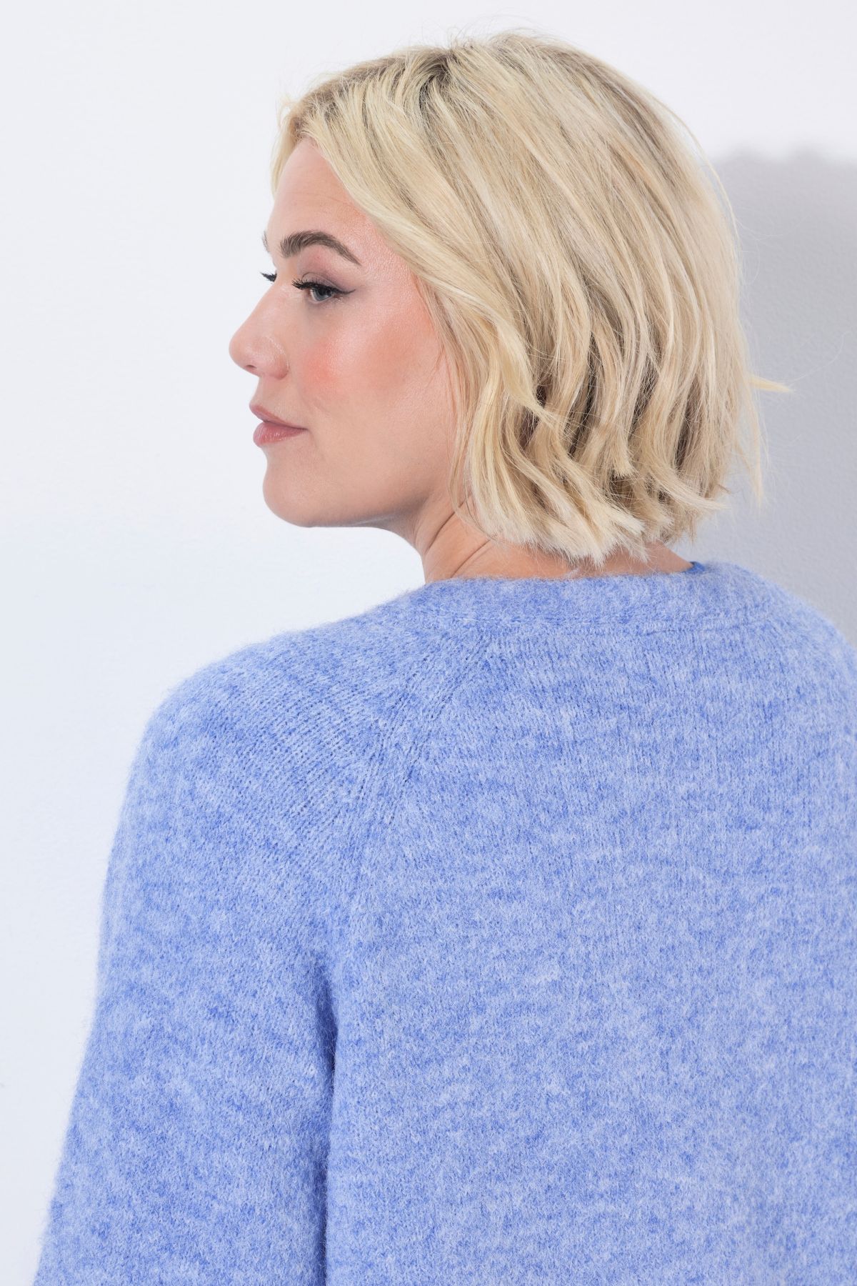 Жилетка с леко скъсена, свободна кройка, изработена от мека фина плетка. Модерен отворен модел с 3/4 реглан ръкави и рипсени маншети. Стил и комфорт в ежедневието