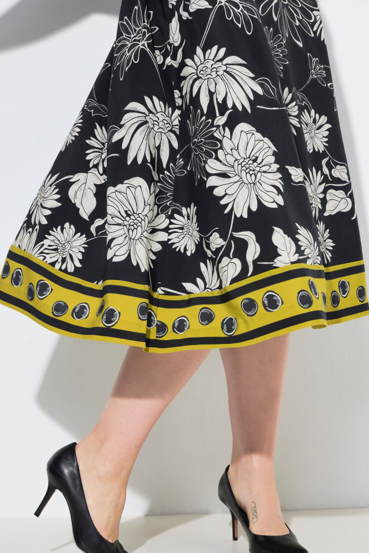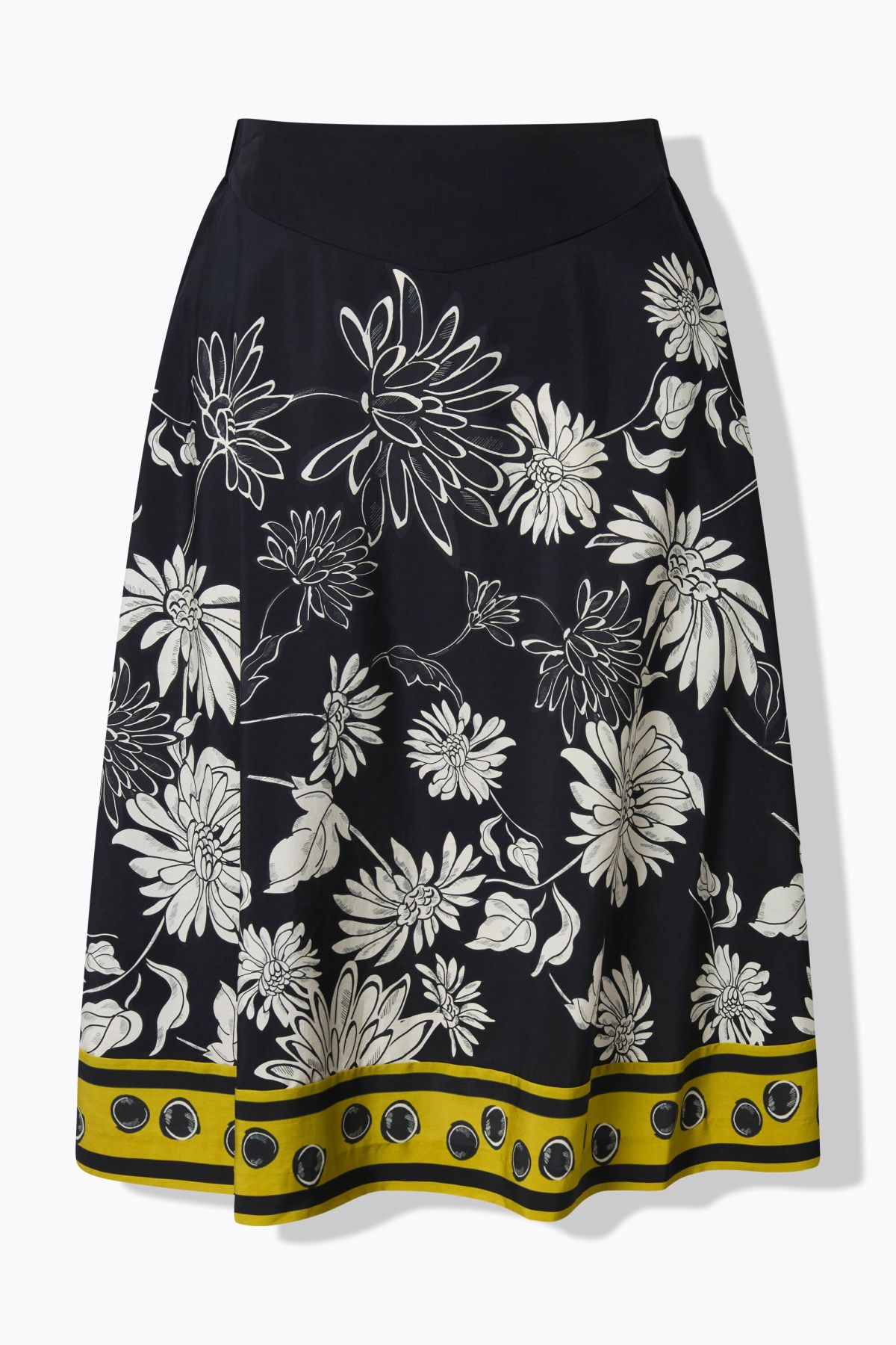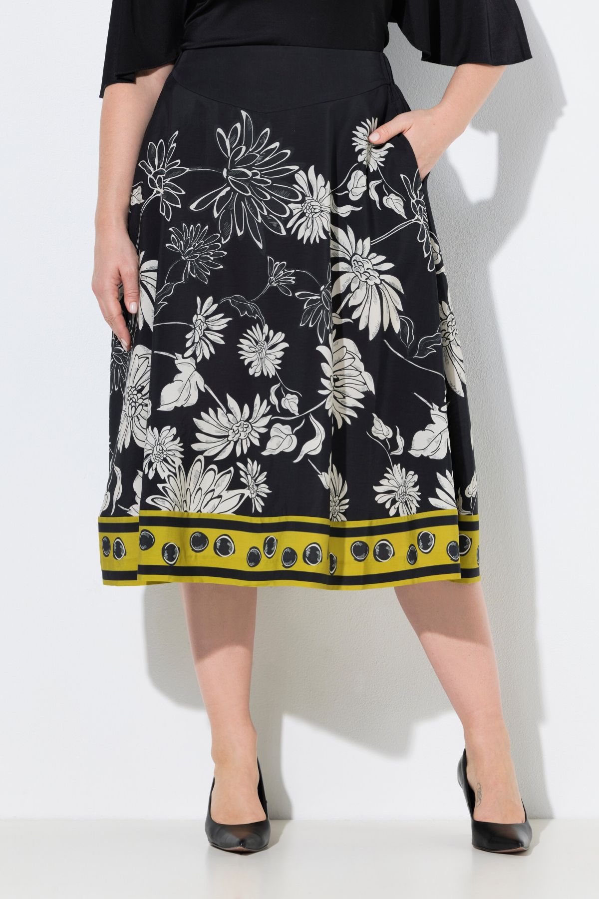 Пола с широка А-линия на силуета и комфортна ширина на подгъва, изработена от естествено мек лиосел с флорален десен и кант. Частично еластичен колан и странични джобове. Материята е гладка, с копринено усещане, охлажда при топло време и затопля при студено.