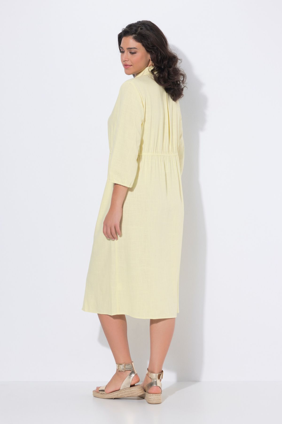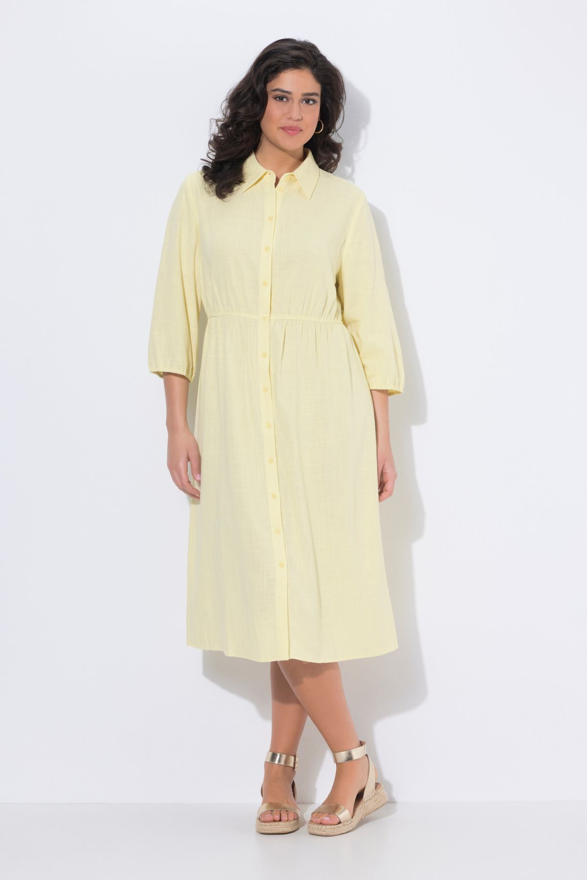 Рокля тип риза с А-линия от прохладна ленена смес. С яка, закопчаване с копчета по цялата дължина и еластичен шев в талията. 3/4 ръкави с ластични маншети.