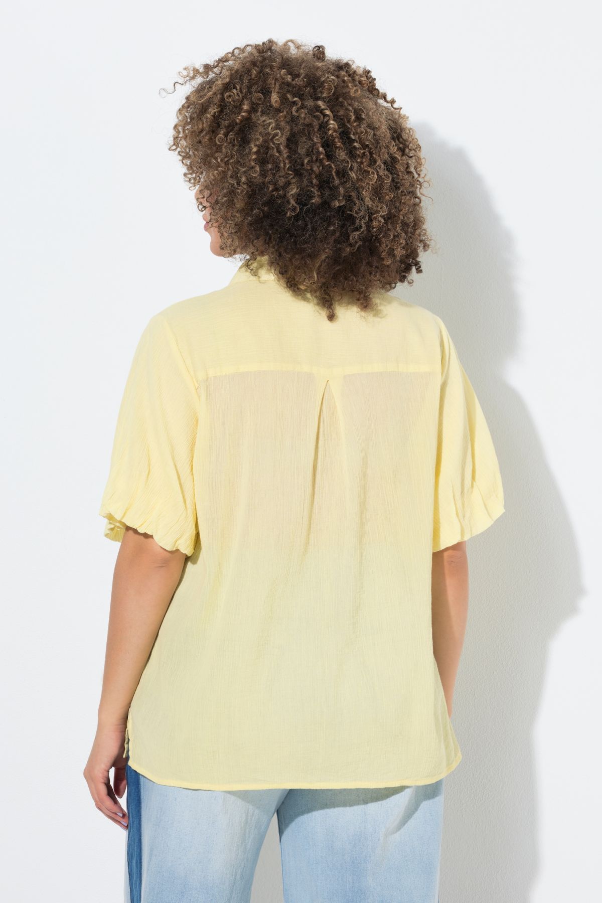 Риза с класическа кройка от прозрачна материя. С широки балон ръкави до лакътя, яка, копчета и странични цепки. Перфектният избор за горещите дни