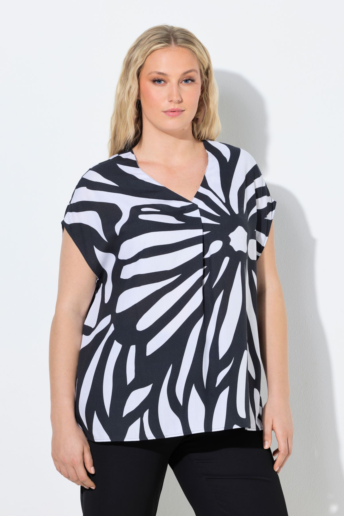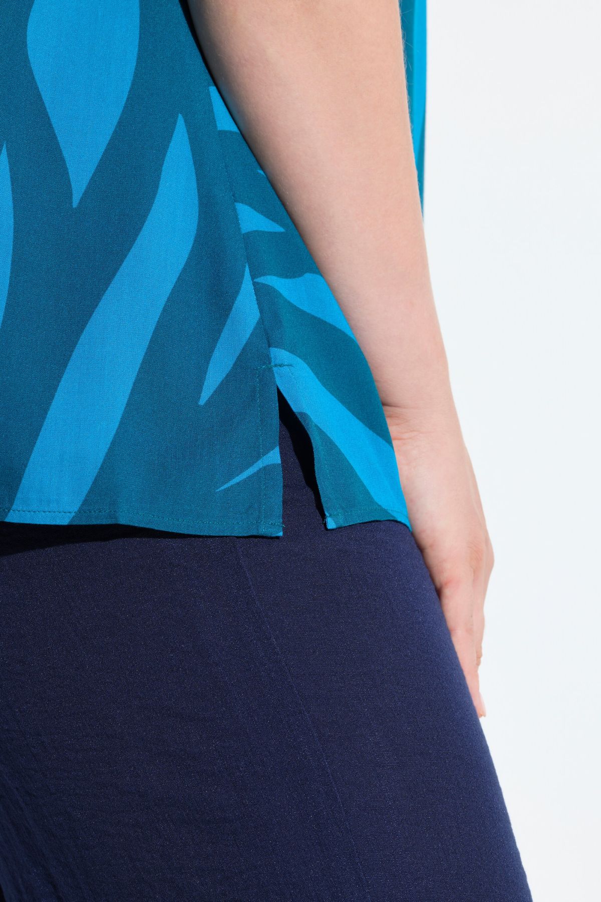 Блуза с разкроен силует с абстрактен принт. С V-образно деколте, паднали рамене и ръкави до лакътя. Странични цепки на подгъва за допълнителен комфорт.