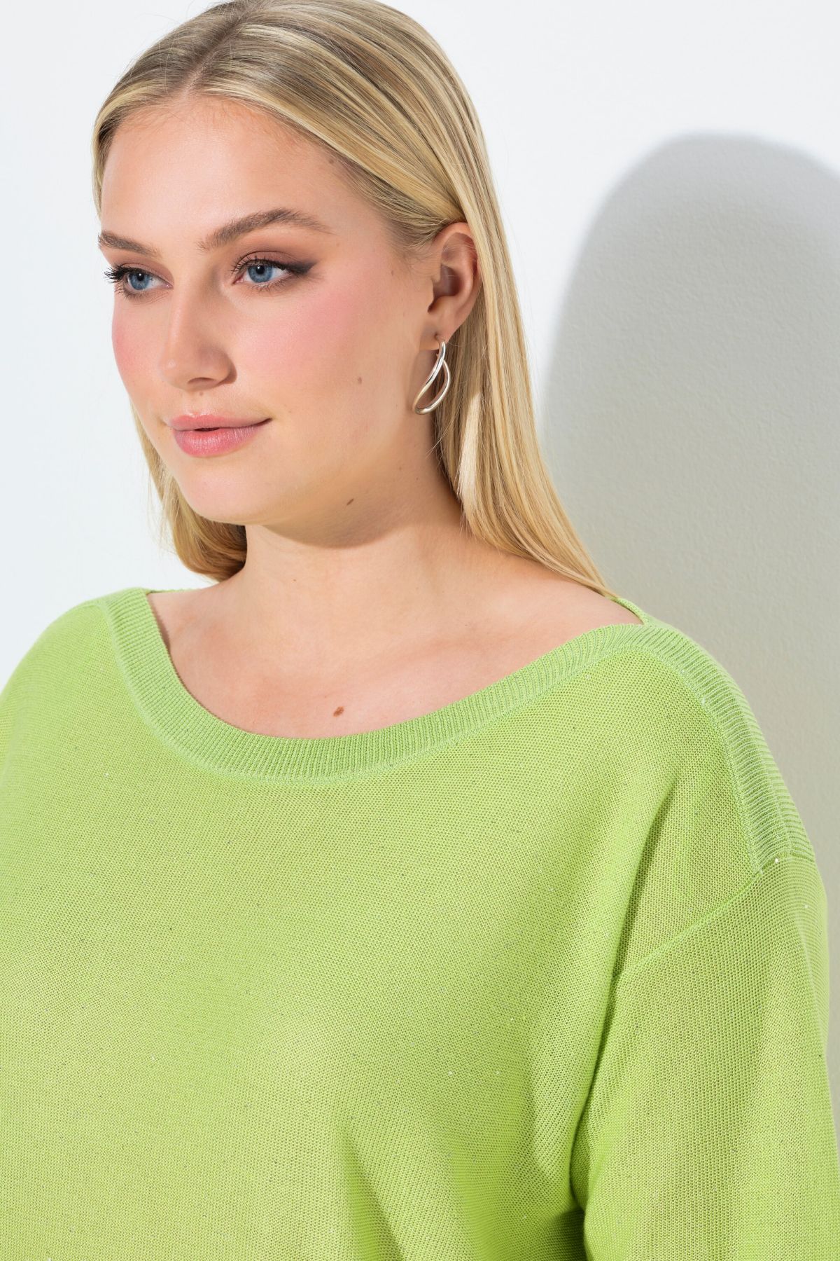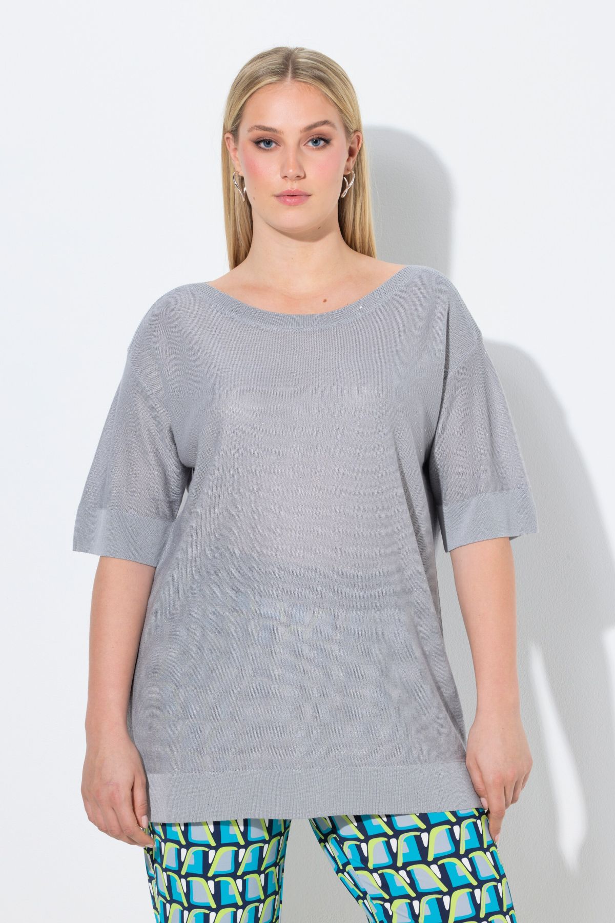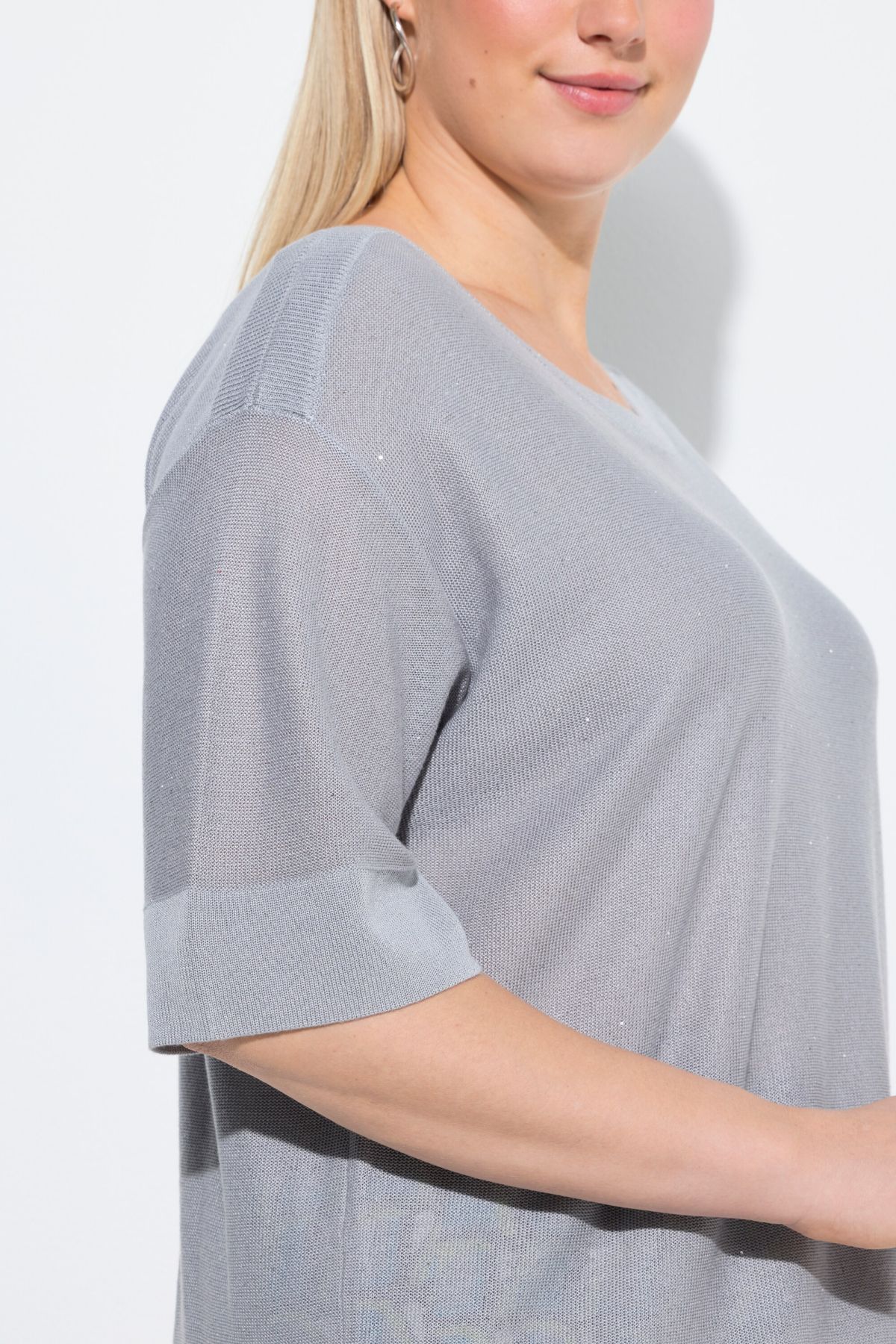 Пуловер с разкроен силует и акцент от пайети. От мека, фина плетка. С деколте тип лодка, паднали рамене и къси ръкави. С рипсени маншети и странични цепки.