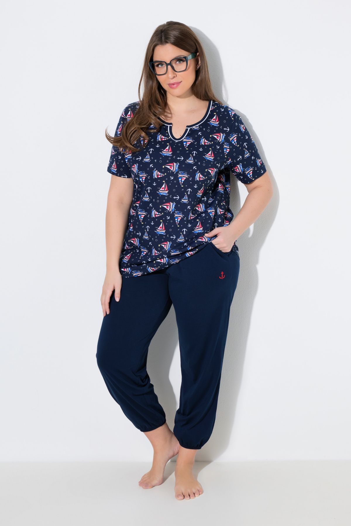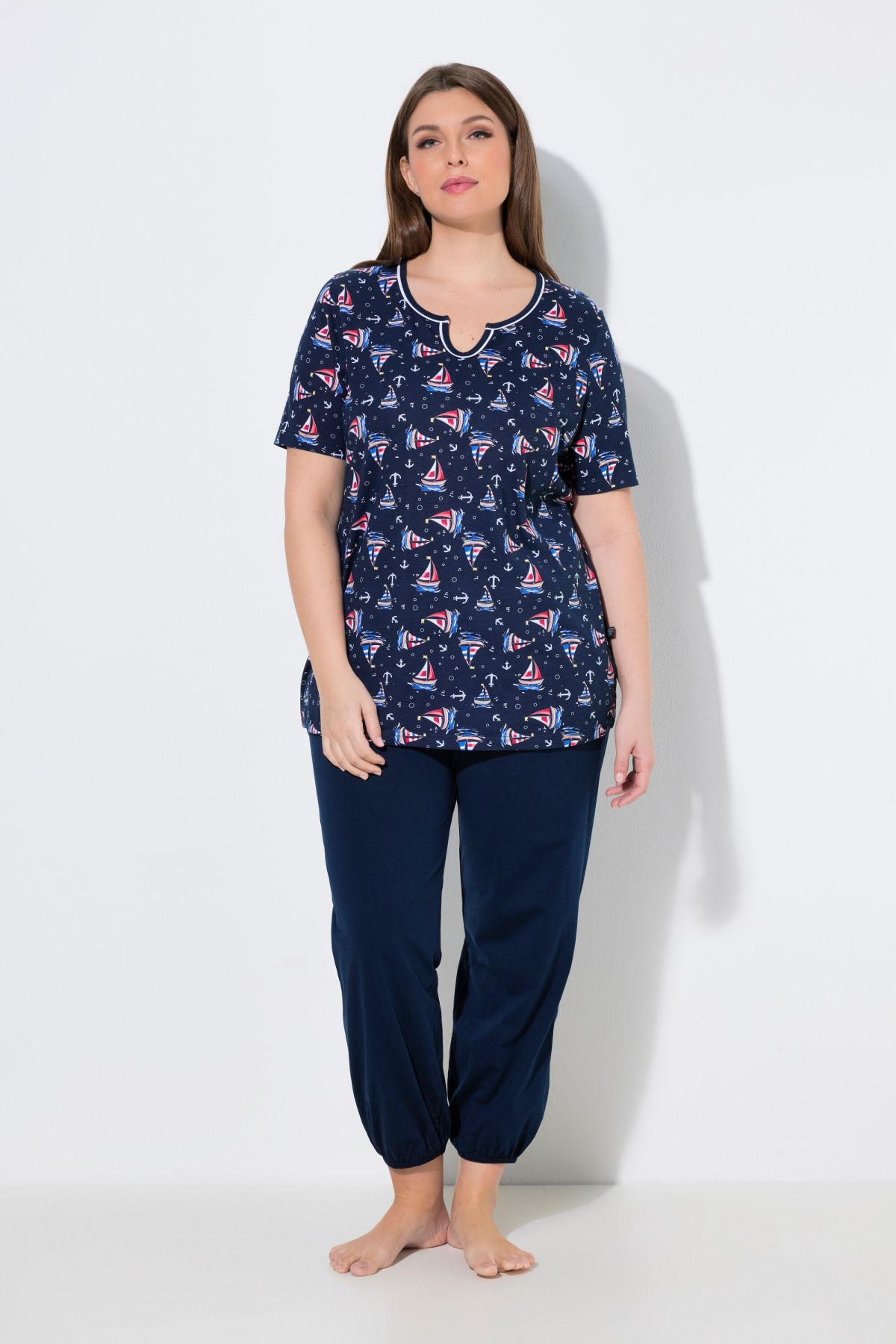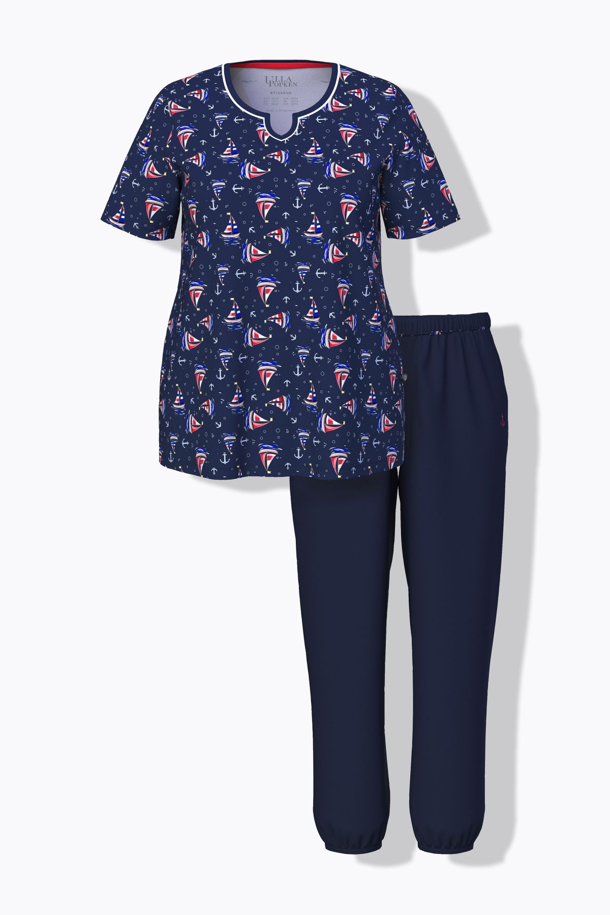 Пижама от 2 части. С горнище с принт на лодки, деколте тип туника и къси ръкави. С долнище с прави крачоли с еластични маншети, ластична талия и странични шевови джобове.