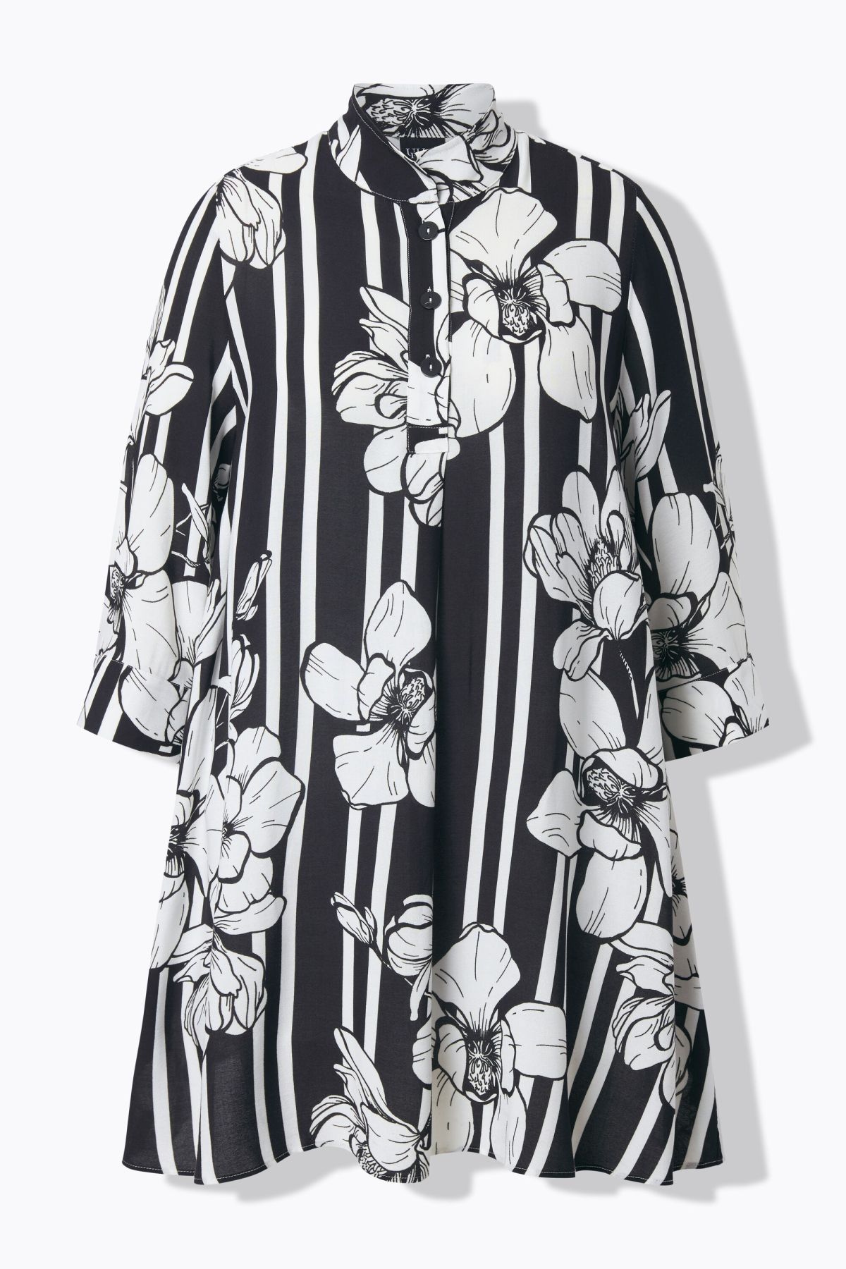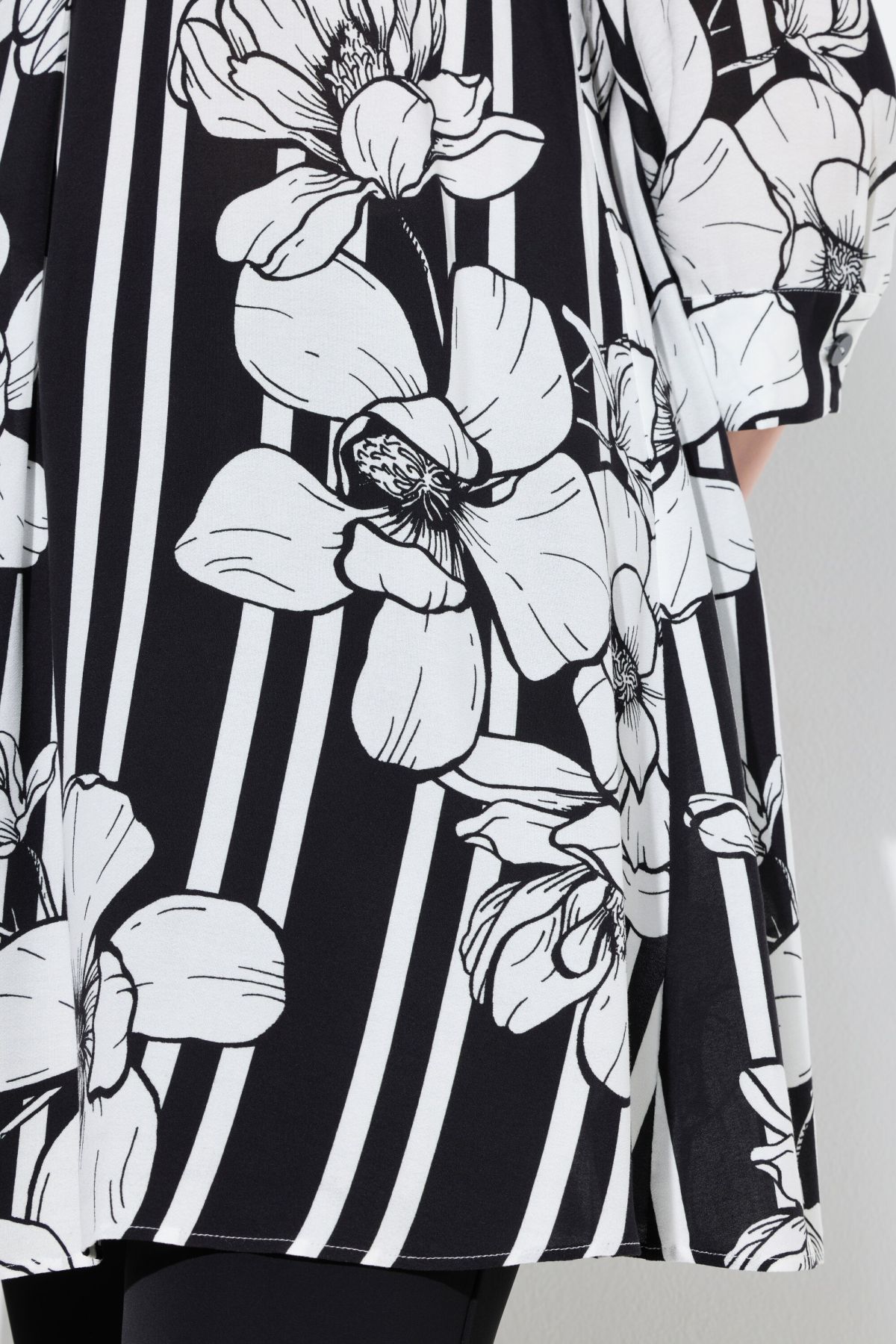 Туника с принт на райета и цветя. С изправена яка и декоративно плисе с копчета. С 3/4 ръкави с маншети.
