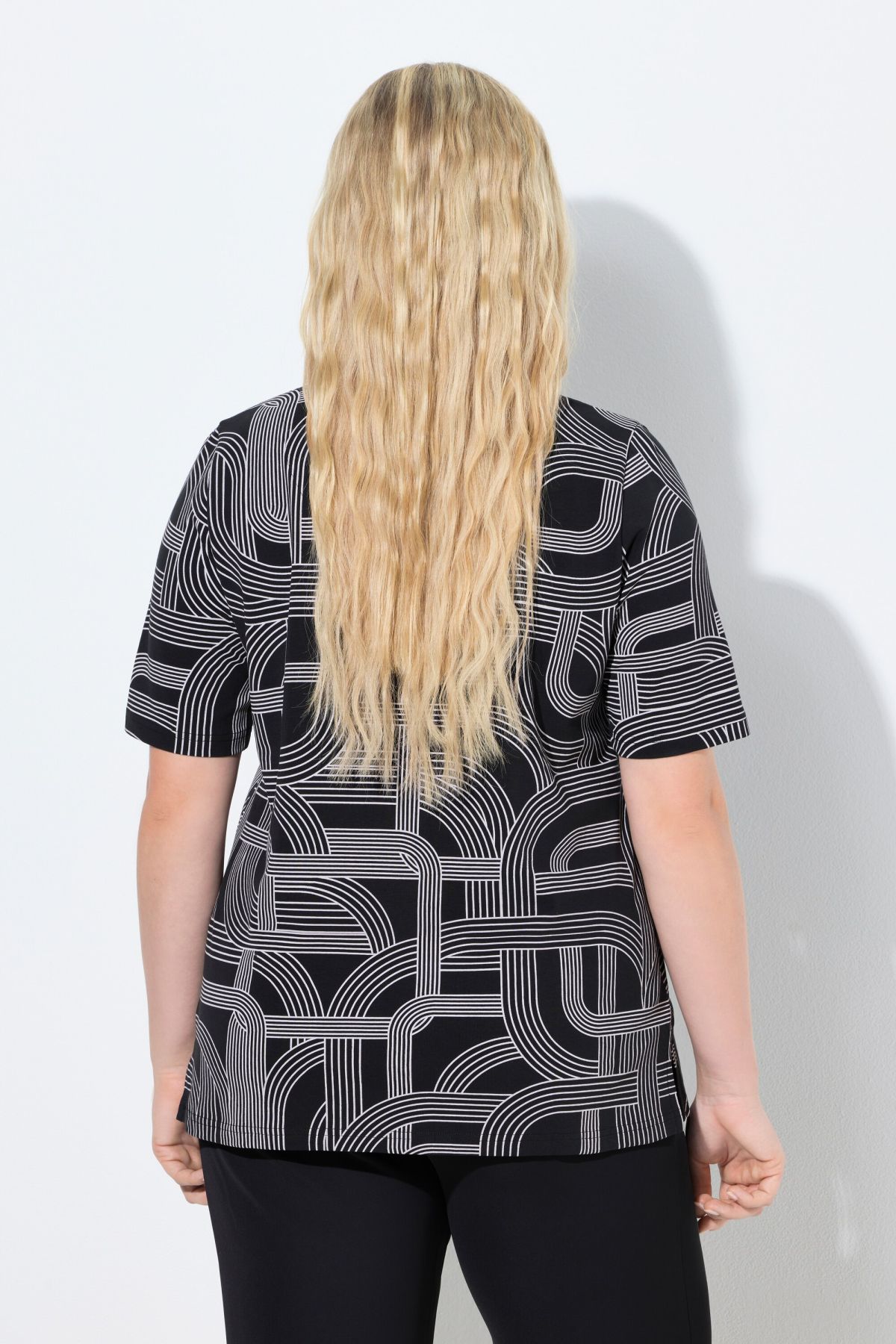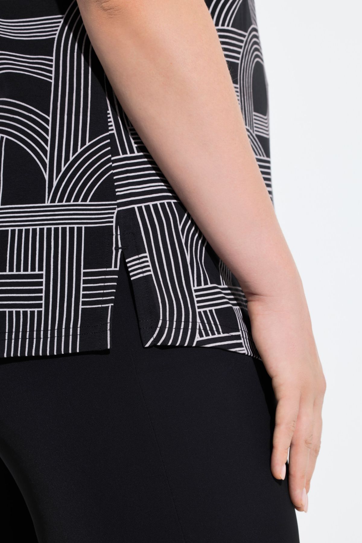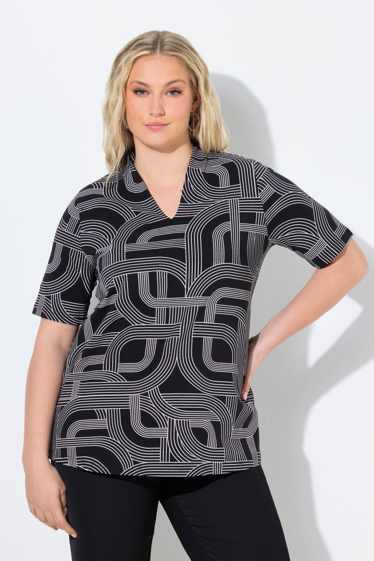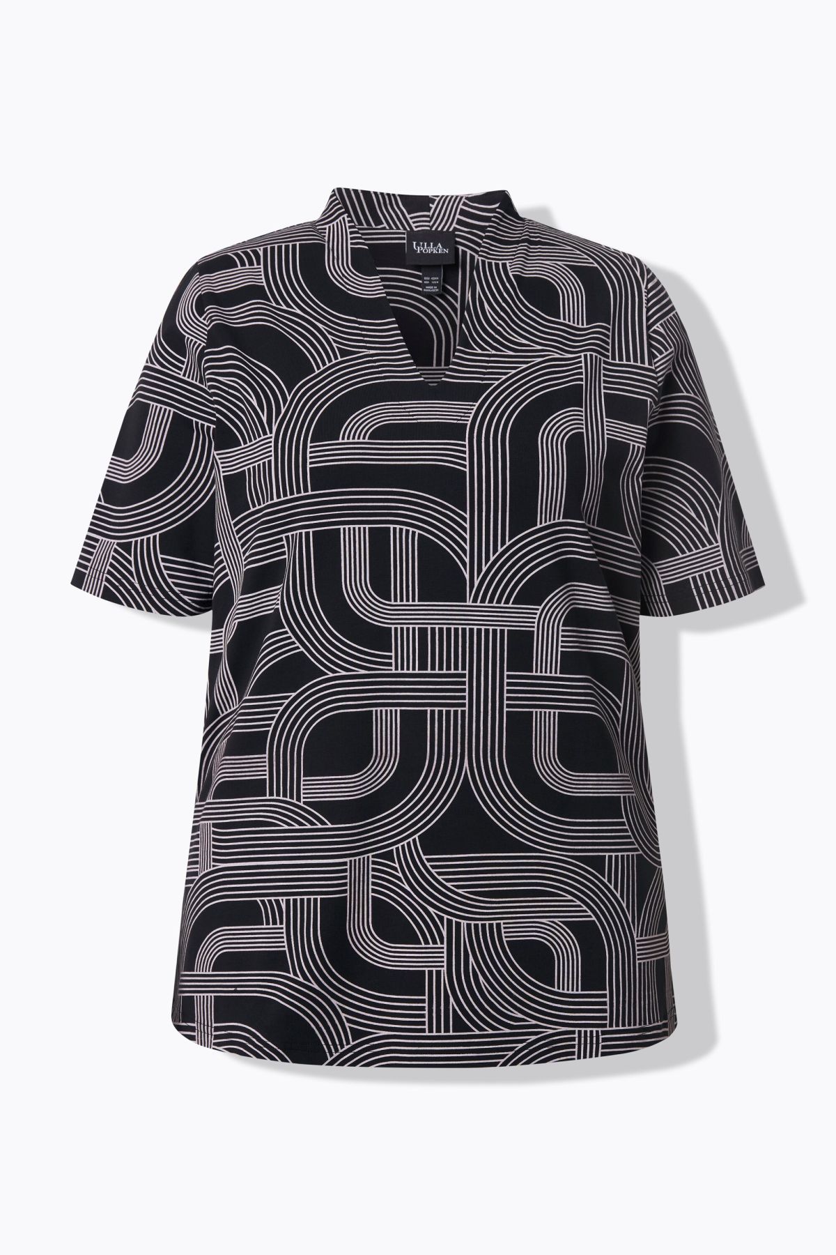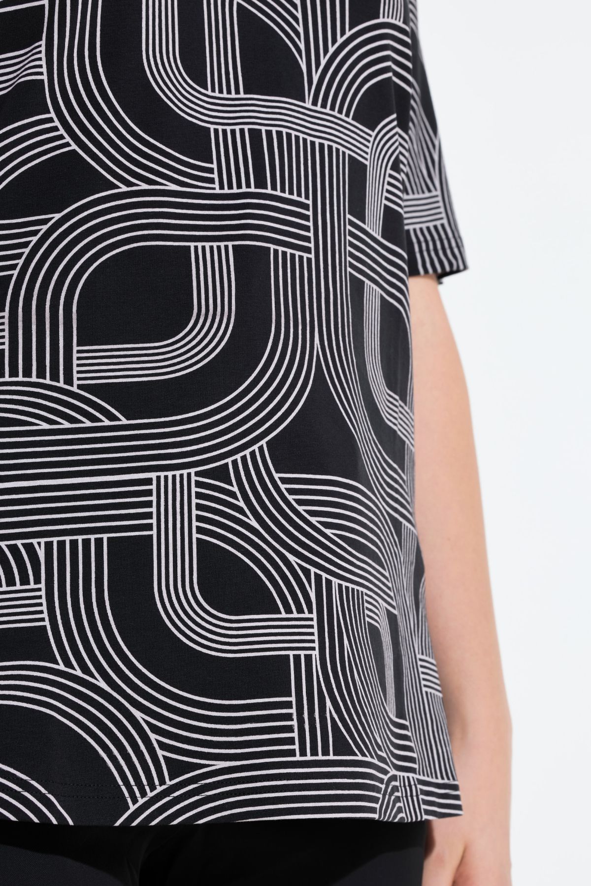 Тениска с геометрични мотиви с класическа кройка. С женствено V - образно деколте и къси ръкави. От меко, еластично трико
