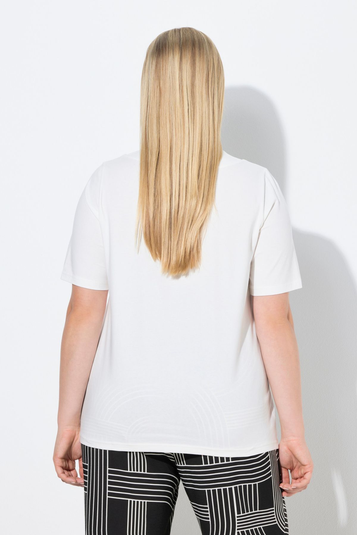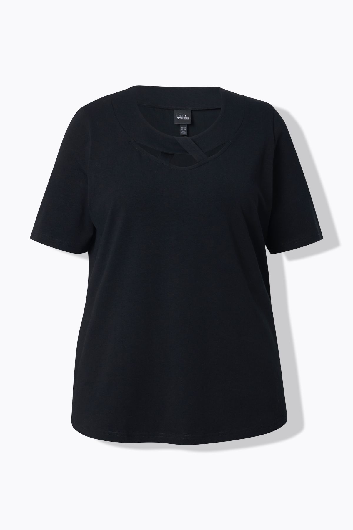 Тениска с класическа кройка, изработено от комфортна трикотажна материя. С драпирани акценти на кръглото деколте с изрязани детайли. С къси ръкави.
