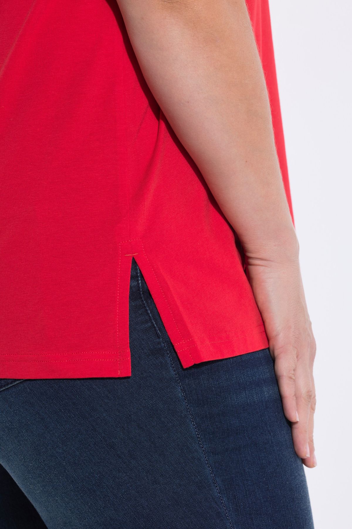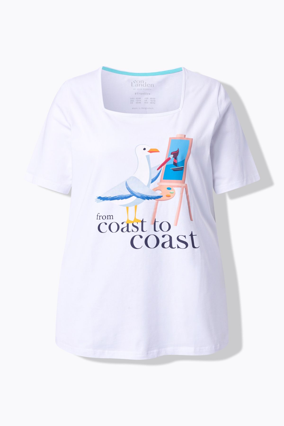 Тениска с принт на чайка и надписи. Квадратно деколте, къси ръкави с маншет, странични цепки на подгъва. Изработена от удобно еластично трико.