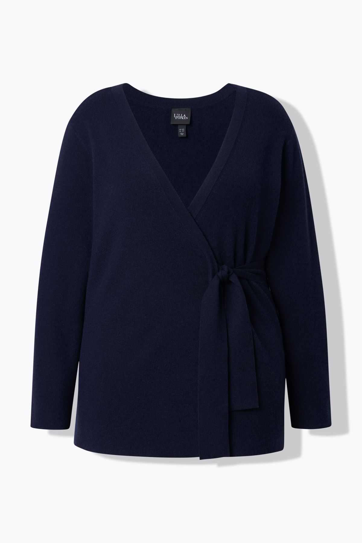 Жилетка стандартна кройка с декоративен акцент, от мека фина плетка. V-образно деколте, дълги ръкави с паднало рамо, странично завързване, гладки краища.