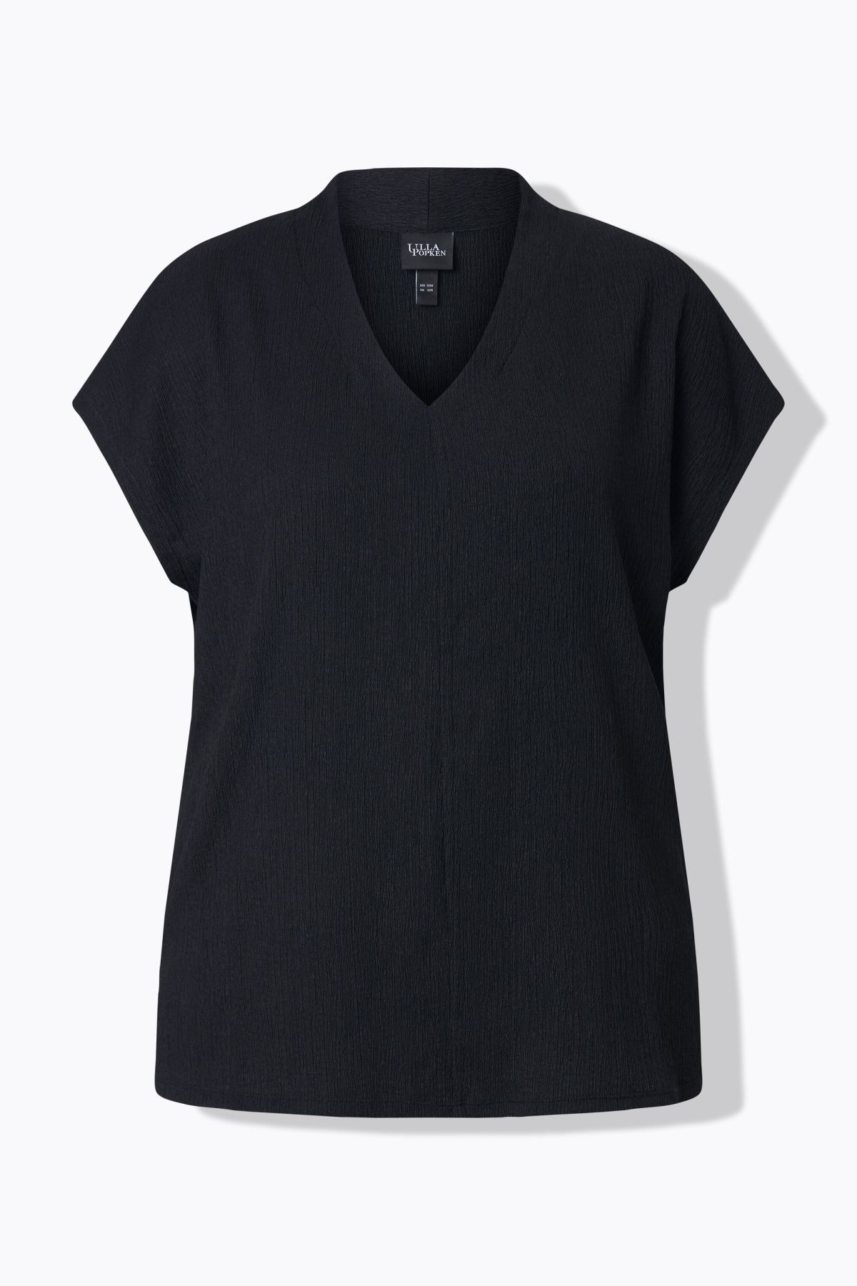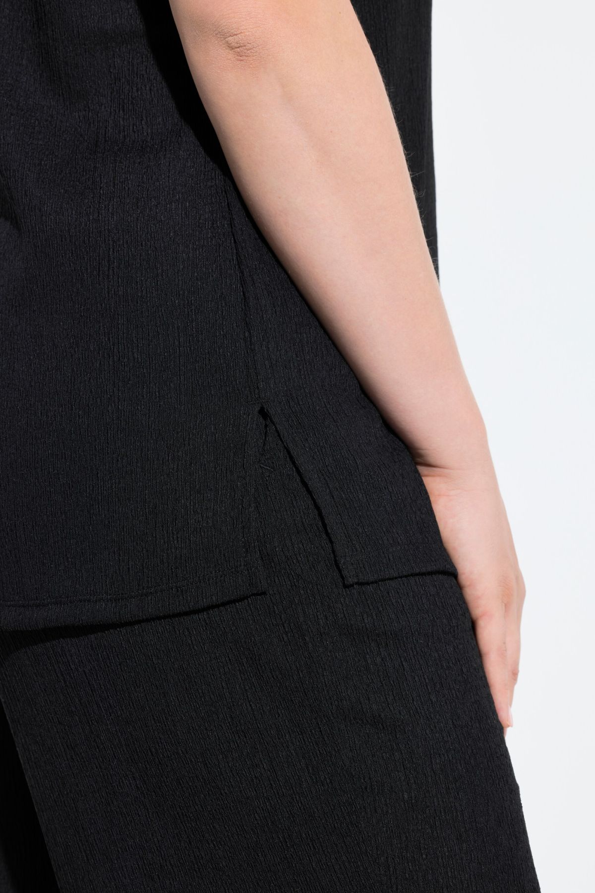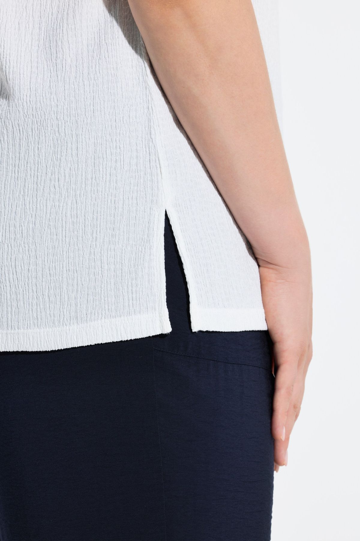 Тениска с изправена яка и овърсайз кройка. V-образно деколте, къси ръкави с паднало рамо, намачкана визия.