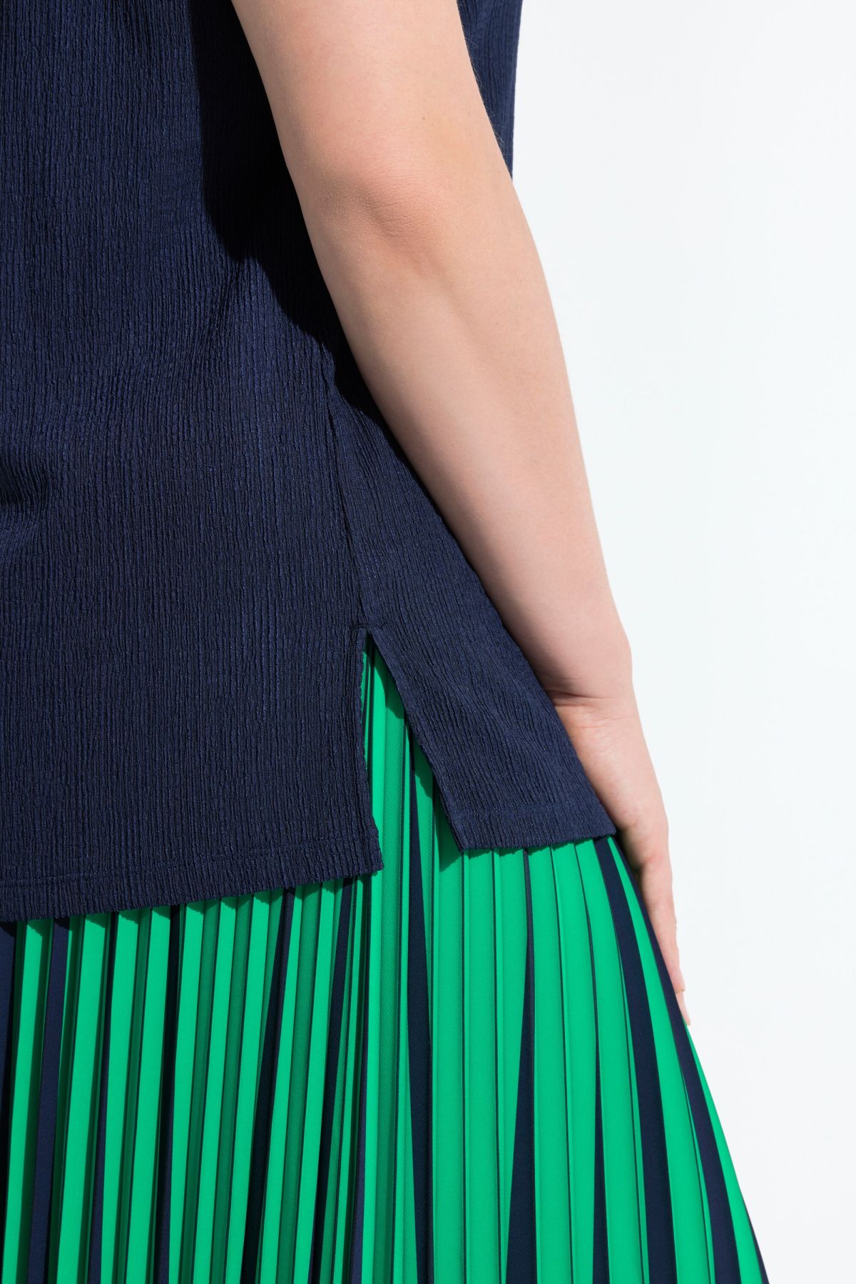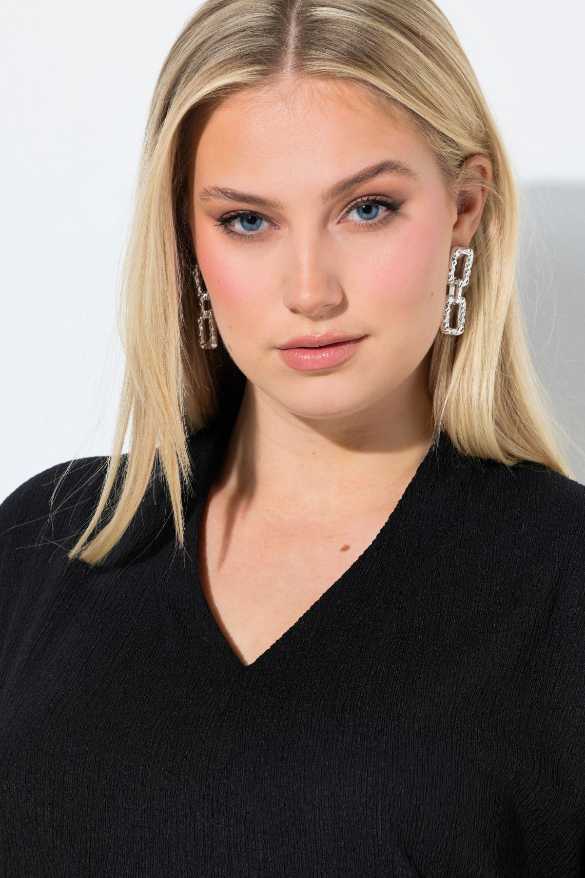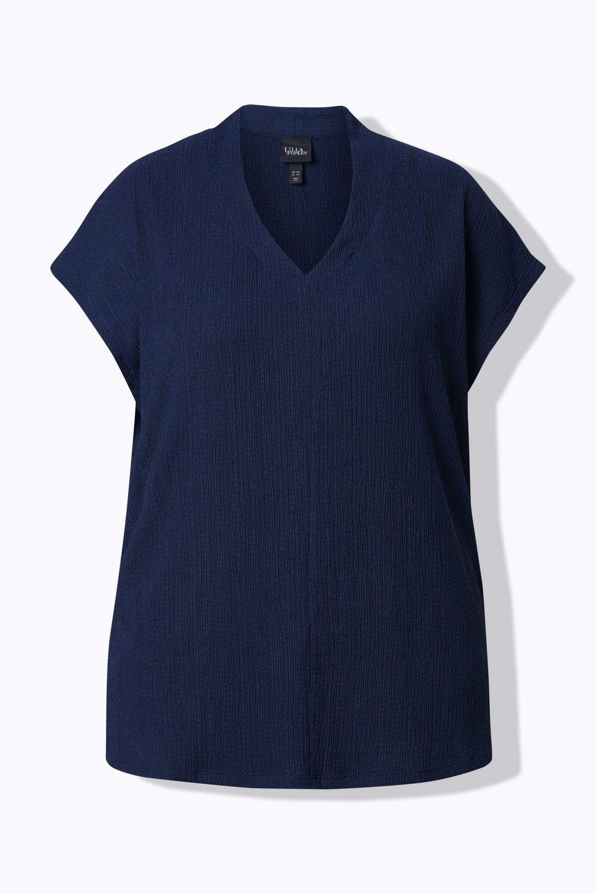 Тениска с изправена яка и овърсайз кройка. V-образно деколте, къси ръкави с паднало рамо, намачкана визия.