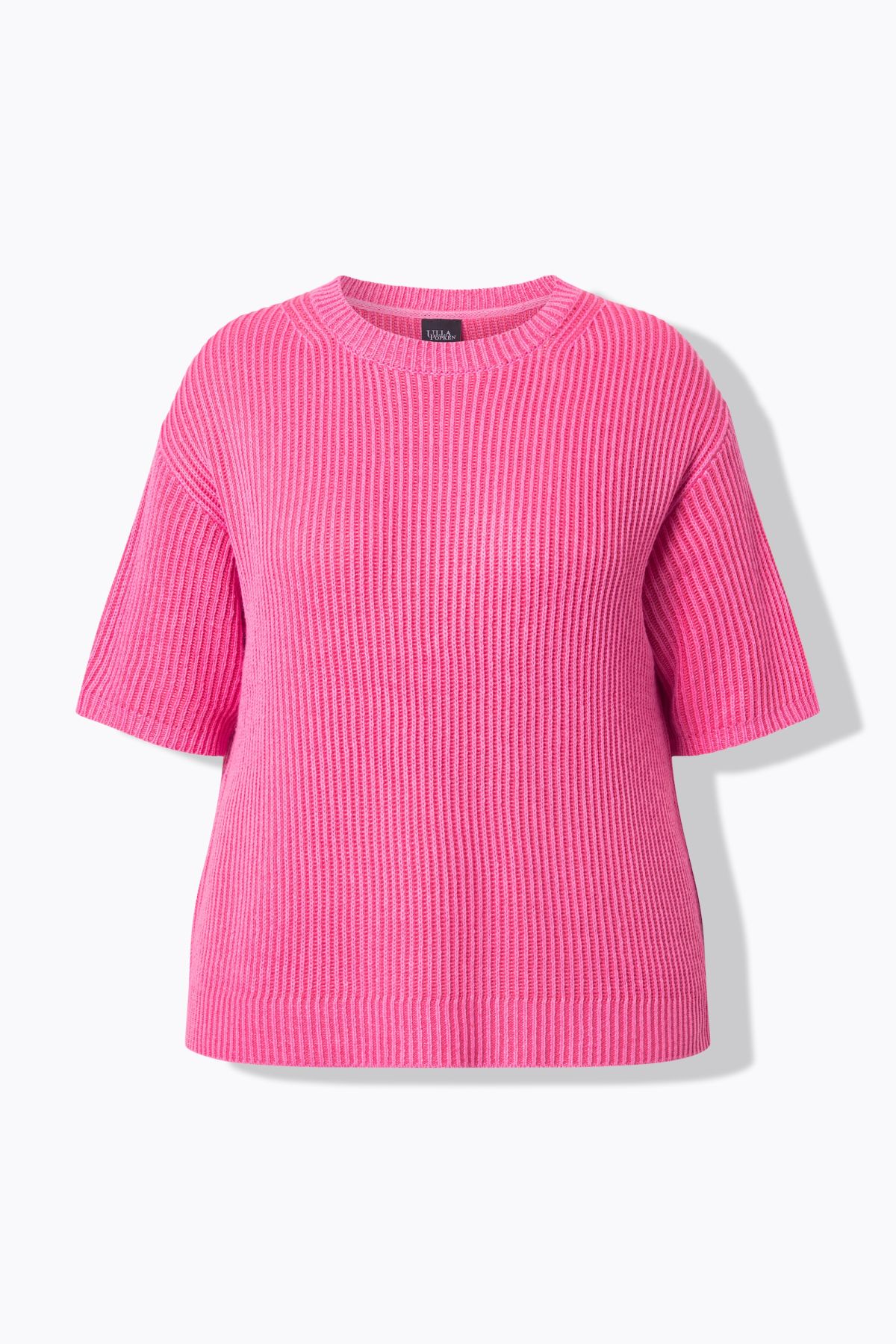 Пуловер с фина плетка с раирана рипсена материя. С кръгло деколте, паднали рамене и къси ръкави. Стил и удобство в ежедневието.