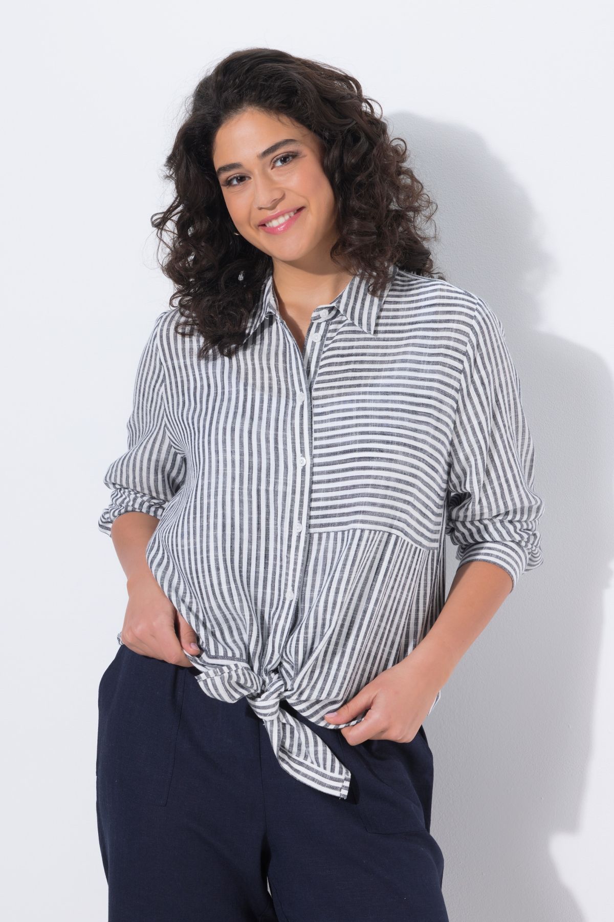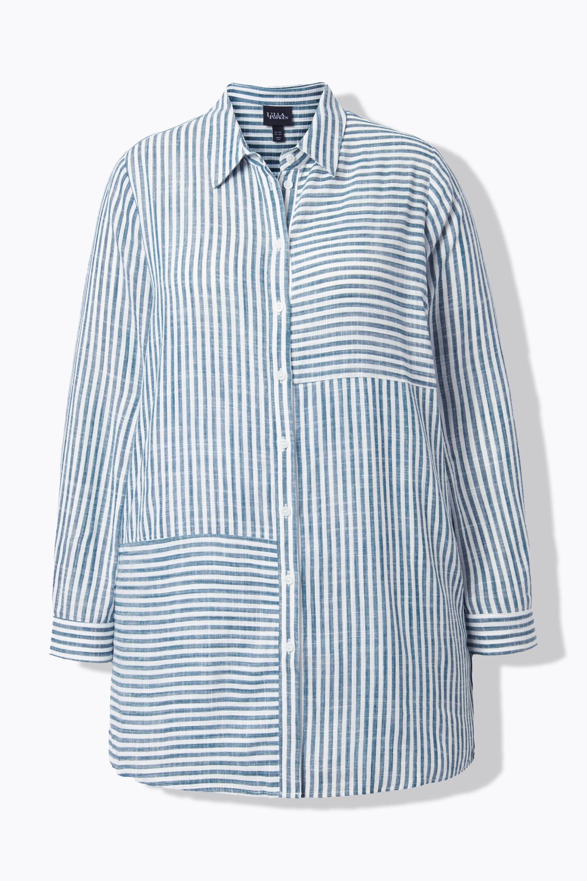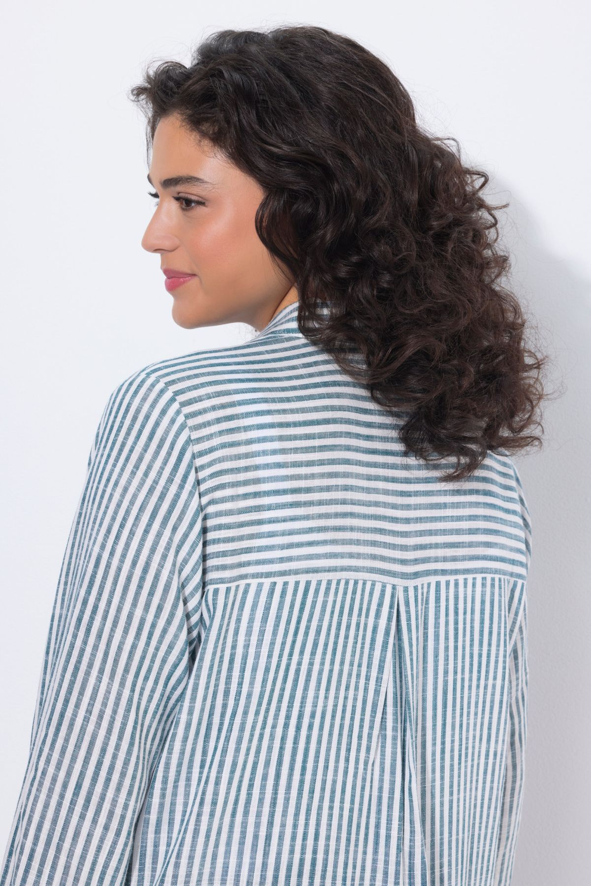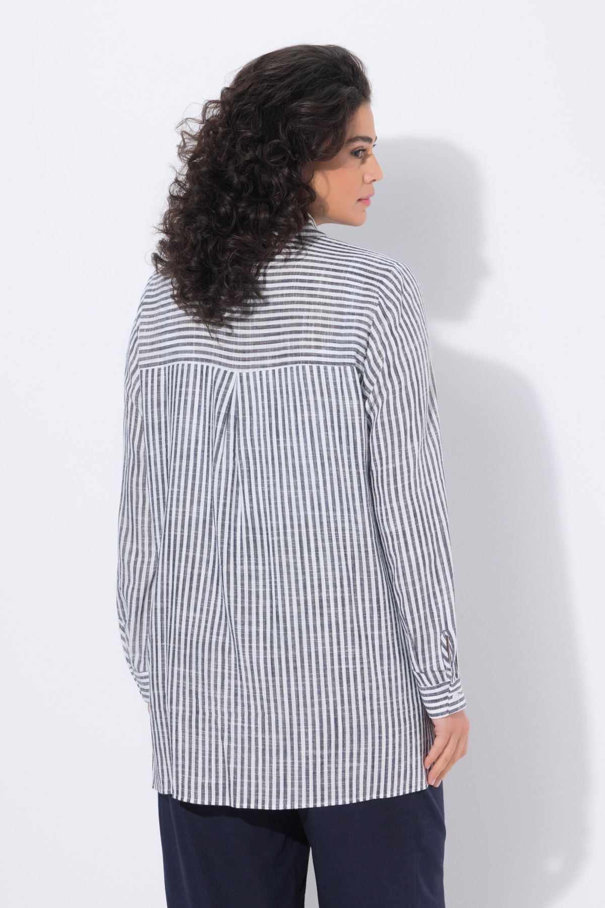 Ленена риза с микс от райета с класическа визия. С яка, копчета отпред, дълги ръкави с маншети. Със заоблен подгъв със странични цепки на подгъва.