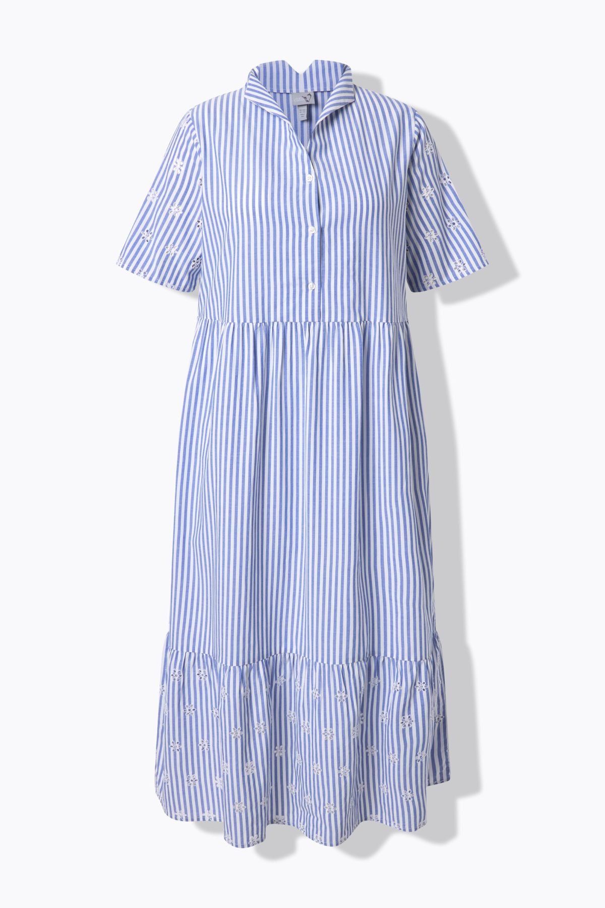 Рокля с вертикални райета и столче яка. Ефектна кройка с А-силует, къси ръкави с маншет, V-образно деколте, закопчаване с копчета на гърдите. Еластична талия, волан в долната част на полата с нежна бродерия на отвори. Ефирна смес от вискоза и памук.