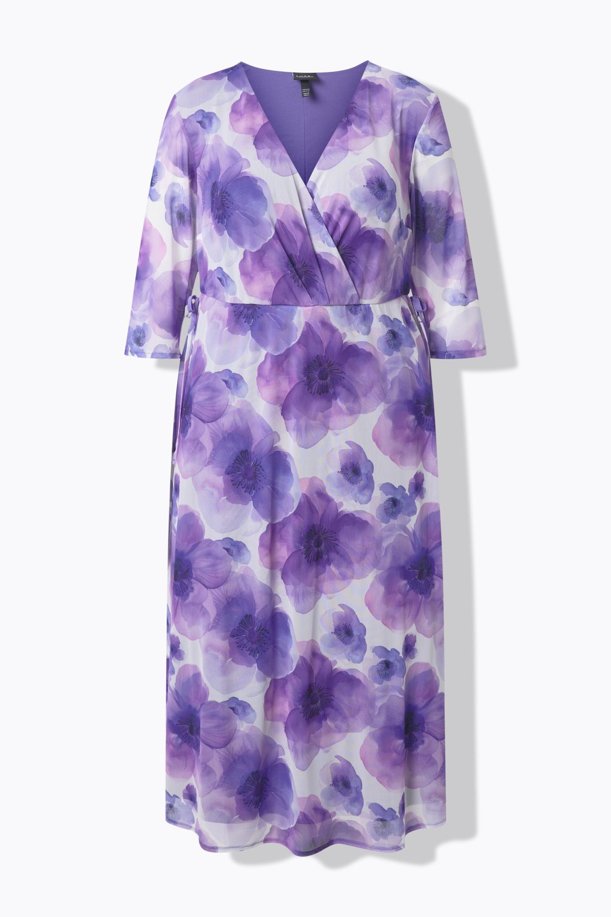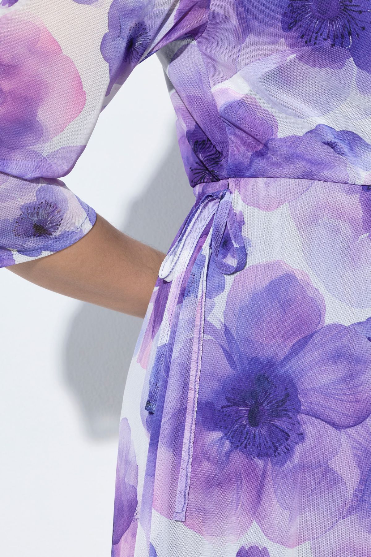 Рокля с визия тип прегърни ме с мрежеста горна част с виолетов принт на цветя и непрозрачна, трикотажна подплата. С V - образно деколте, шевов, еластичен акцент на талията и широки къси ръкави. Привлечете вниманието на всеки повод.