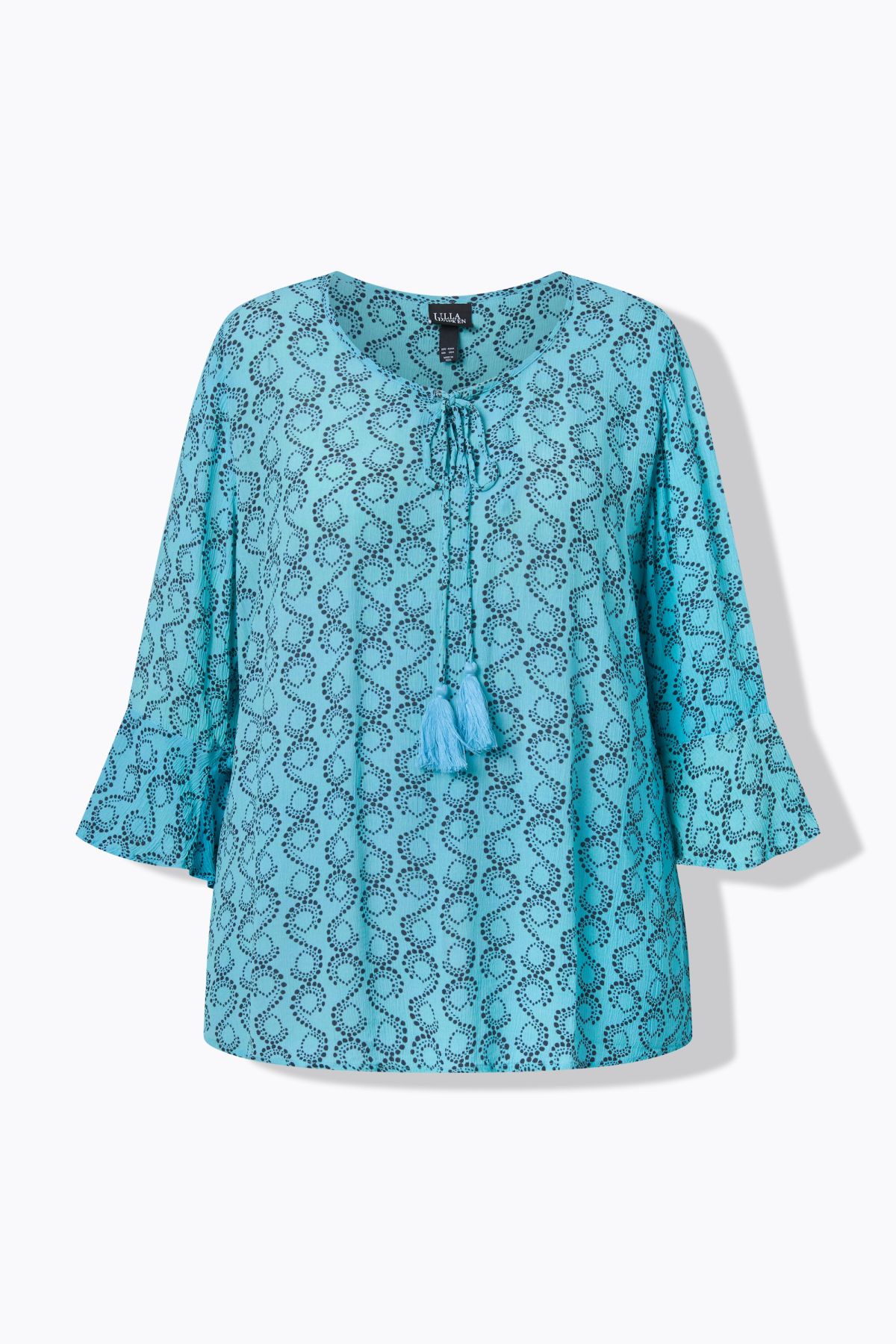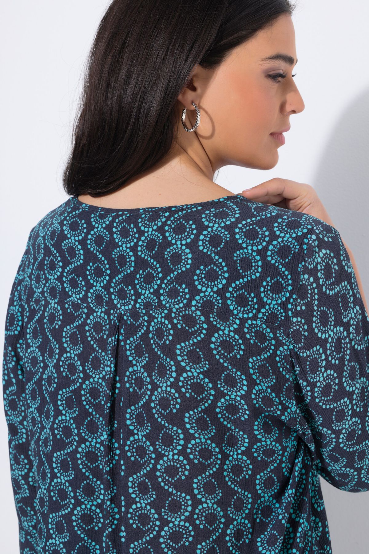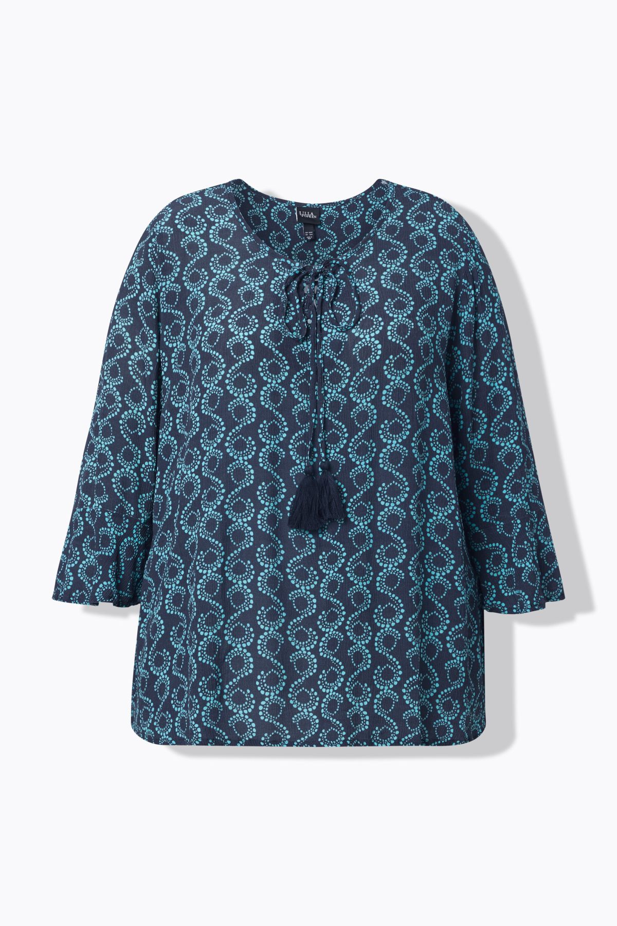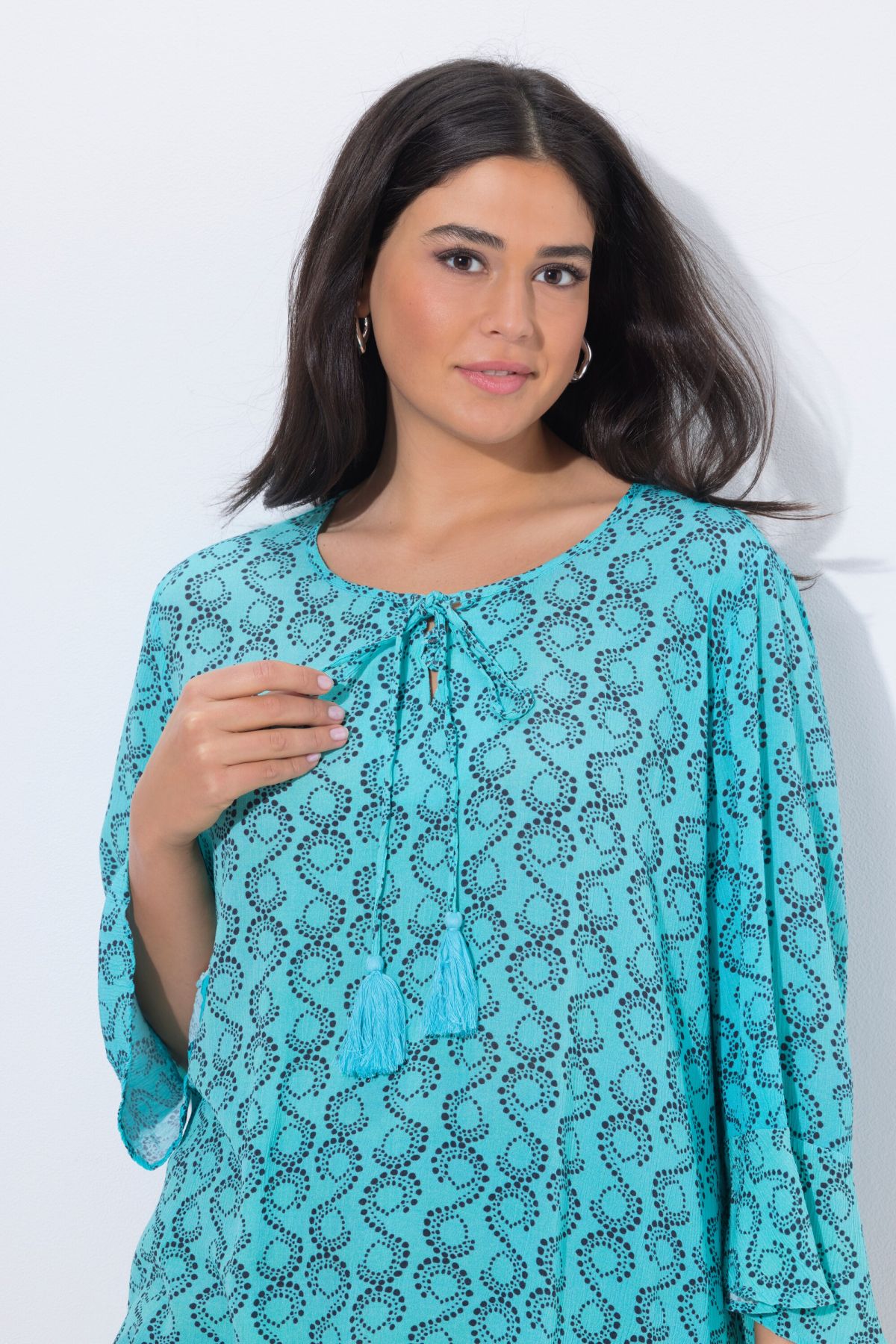 Мек креп с модерен принт, деколте тип туника с връзки, удобна А-силует с волан подгъв, 3/4 ръкави с волан, мека течаща вискоза, дължина, регулирана по размер, приблизително 68-76 см.