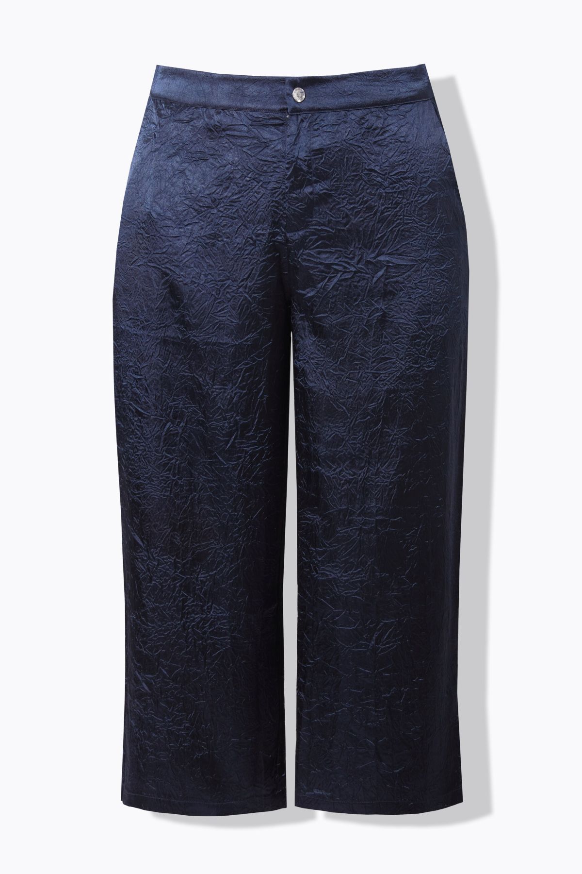 Сатениран панталон тип Mary със 7/8 дължина. С широки, прави крачоли и фина материя. С частично еластична талия с копче и цип отпред и странични шевови джобове.
