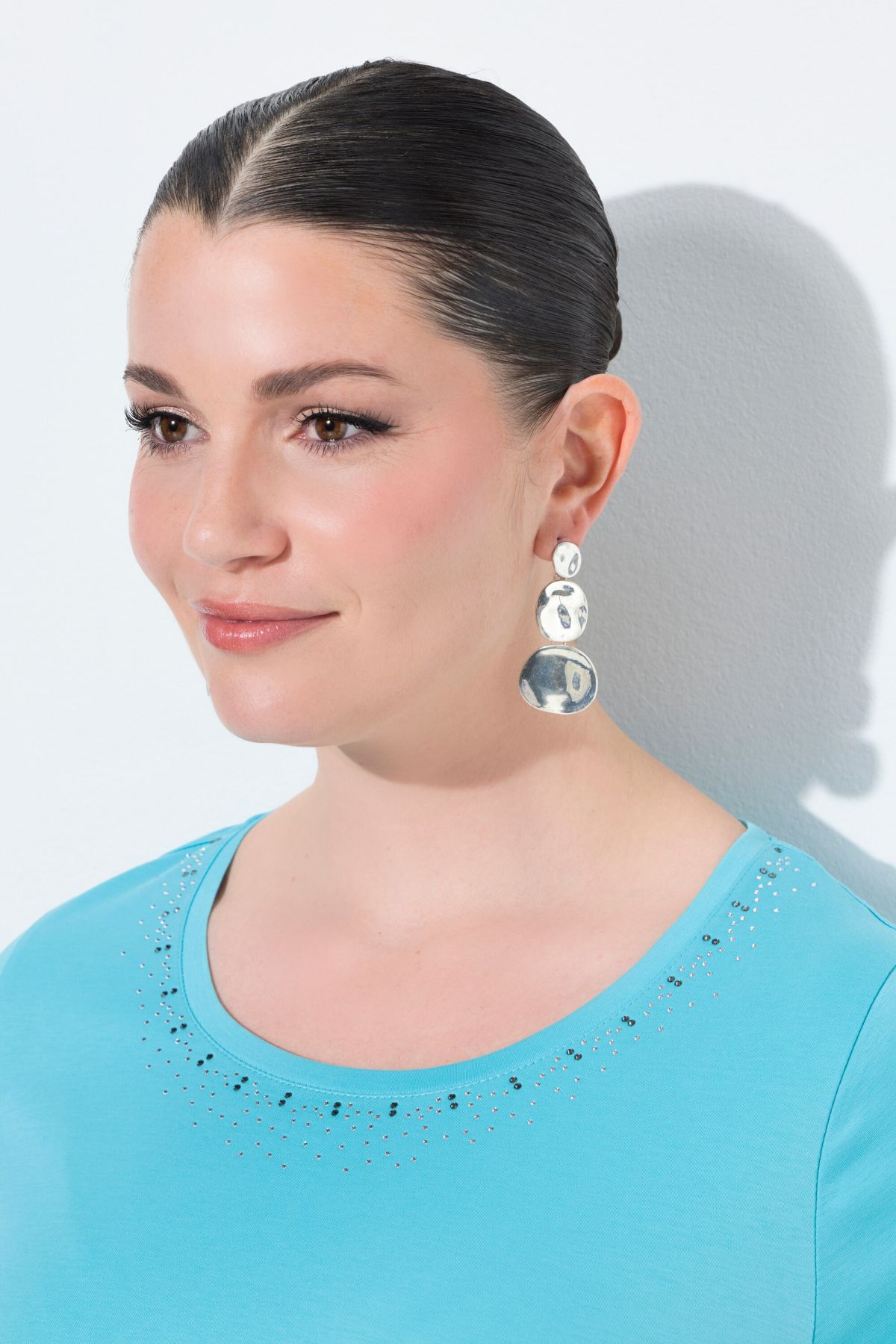 Блуза с декоративни камъчета на кръглото деколте. С къси ръкави и странични цепки на подгъва за допълнителен комфорт. От мека, памучна материя.