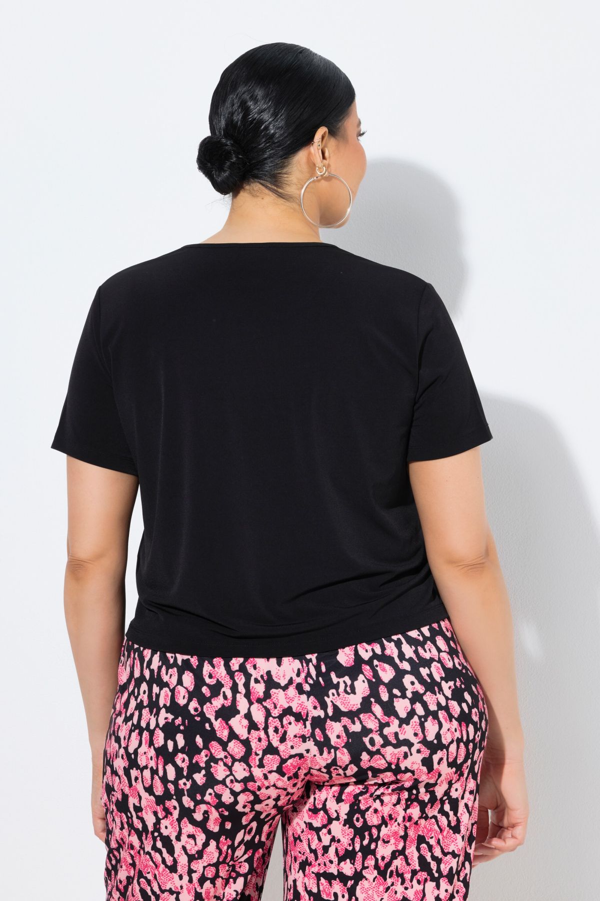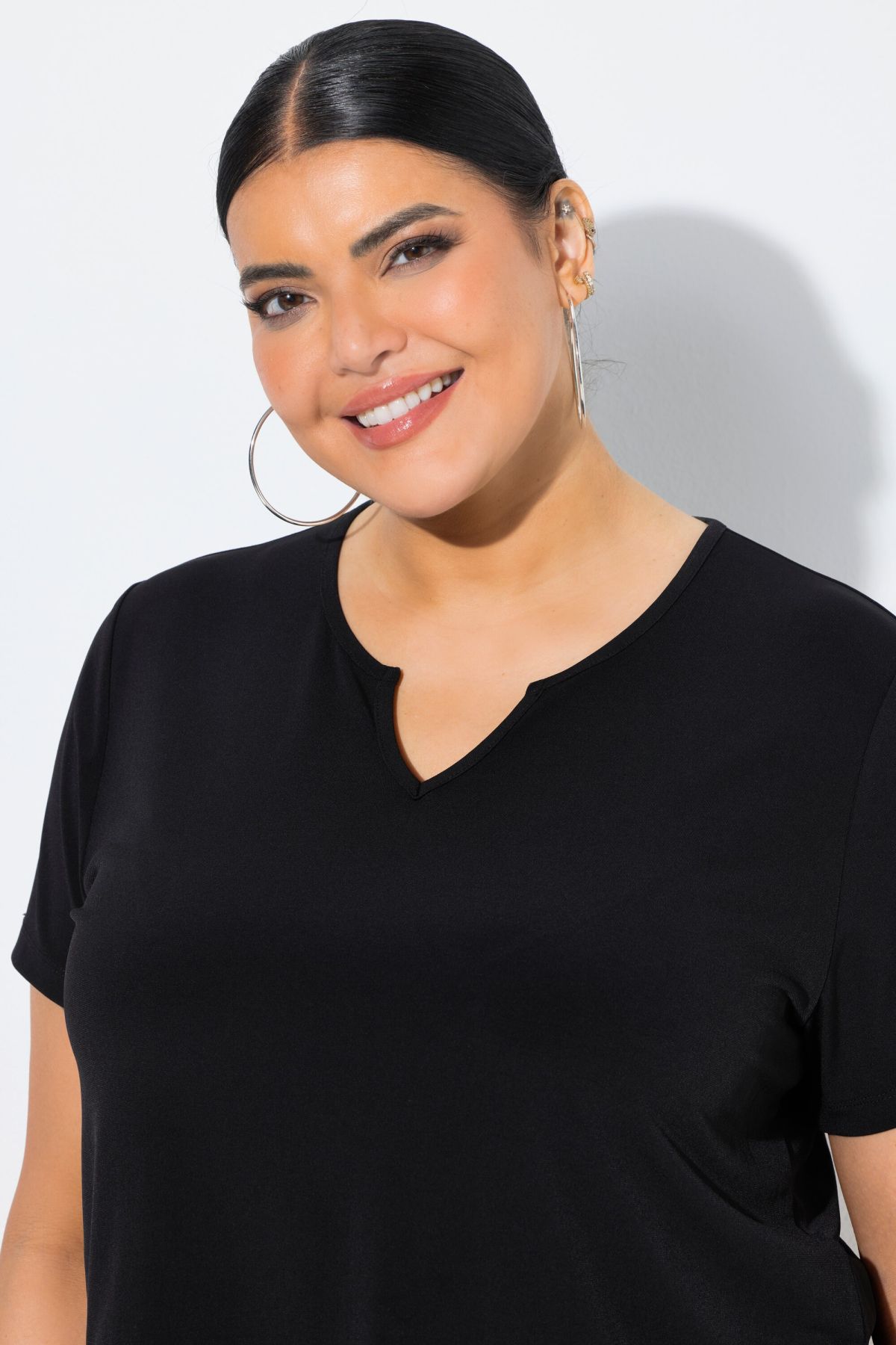 Тениска с модерна нова визия - по - къса кройка и меко трико. С кръгло деколте с цепка тип туника и къси ръкави. Готови ли сте за нещо ново в ежедневието си?