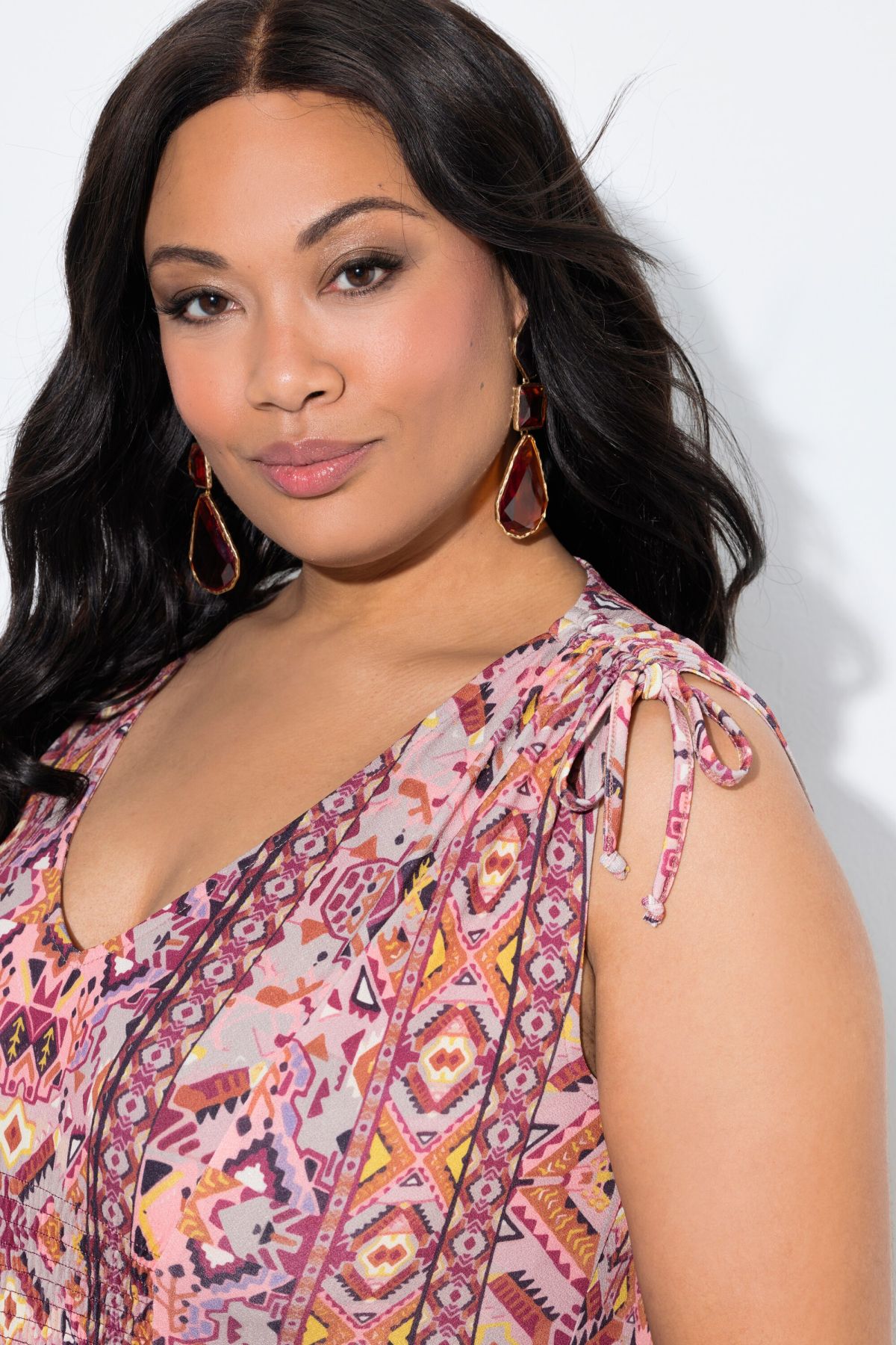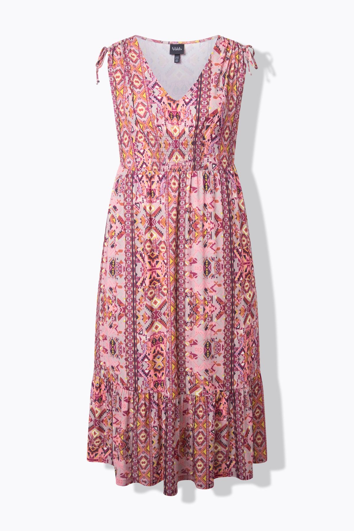 Рокля с бохо пач принт с паднали рамене с широки презрамки, без ръкави. С V - образно деколте с еластичен акцент. С хоризонтален шевов акцент на талията. С къдрав подгъв.