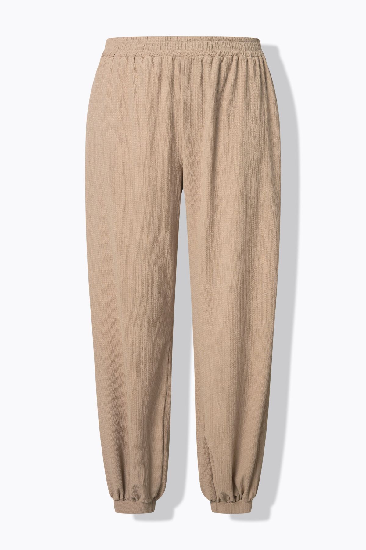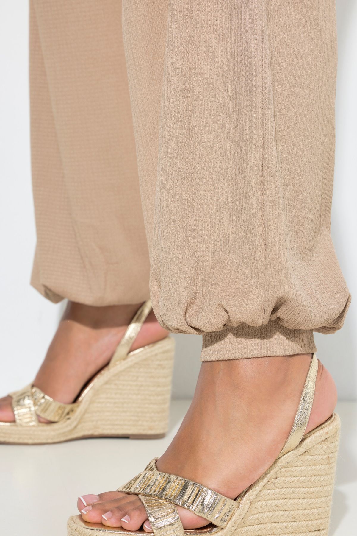 Панталон с широки крачоли от мека материя креп. С еластична талия и странични джобове. С еластичен подгъв.