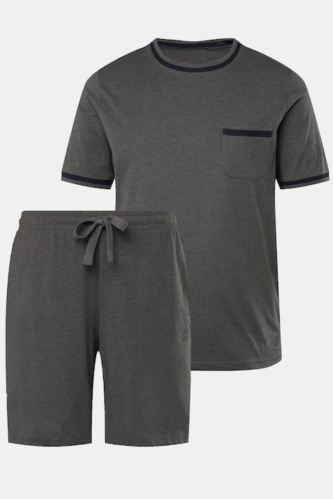 Пижама от 2 части от меланжирано трико. С горнище с кръгло деколте и дълги ръкави. С долнище тип шорти с еластична талия и странични джобове.