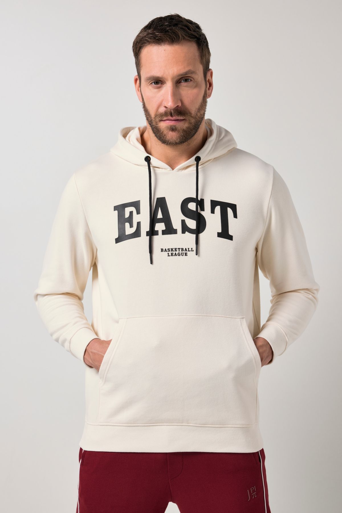 Суитчър спортен с голям надпис на гърдите. С качулка с контрастна връзка, джоб тип кенгуру и дълги ръкави с рипсен, еластичен маншет.