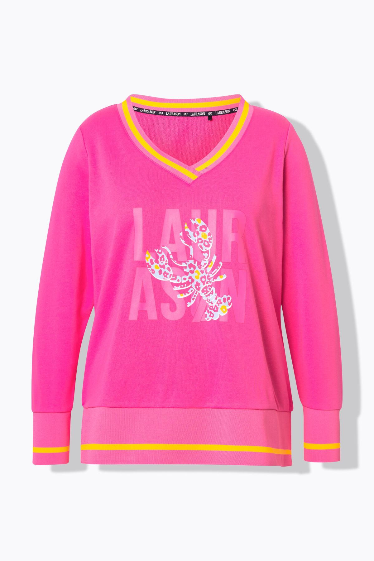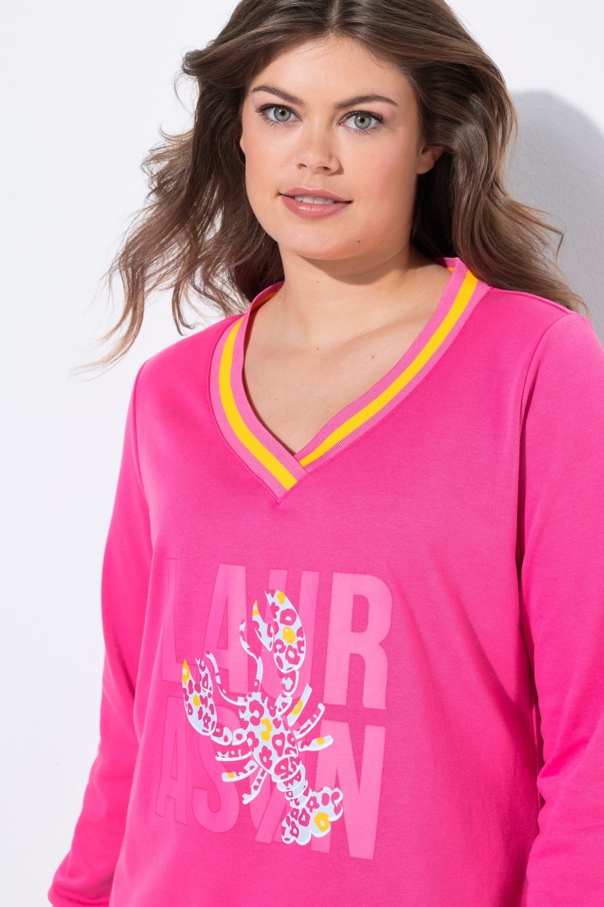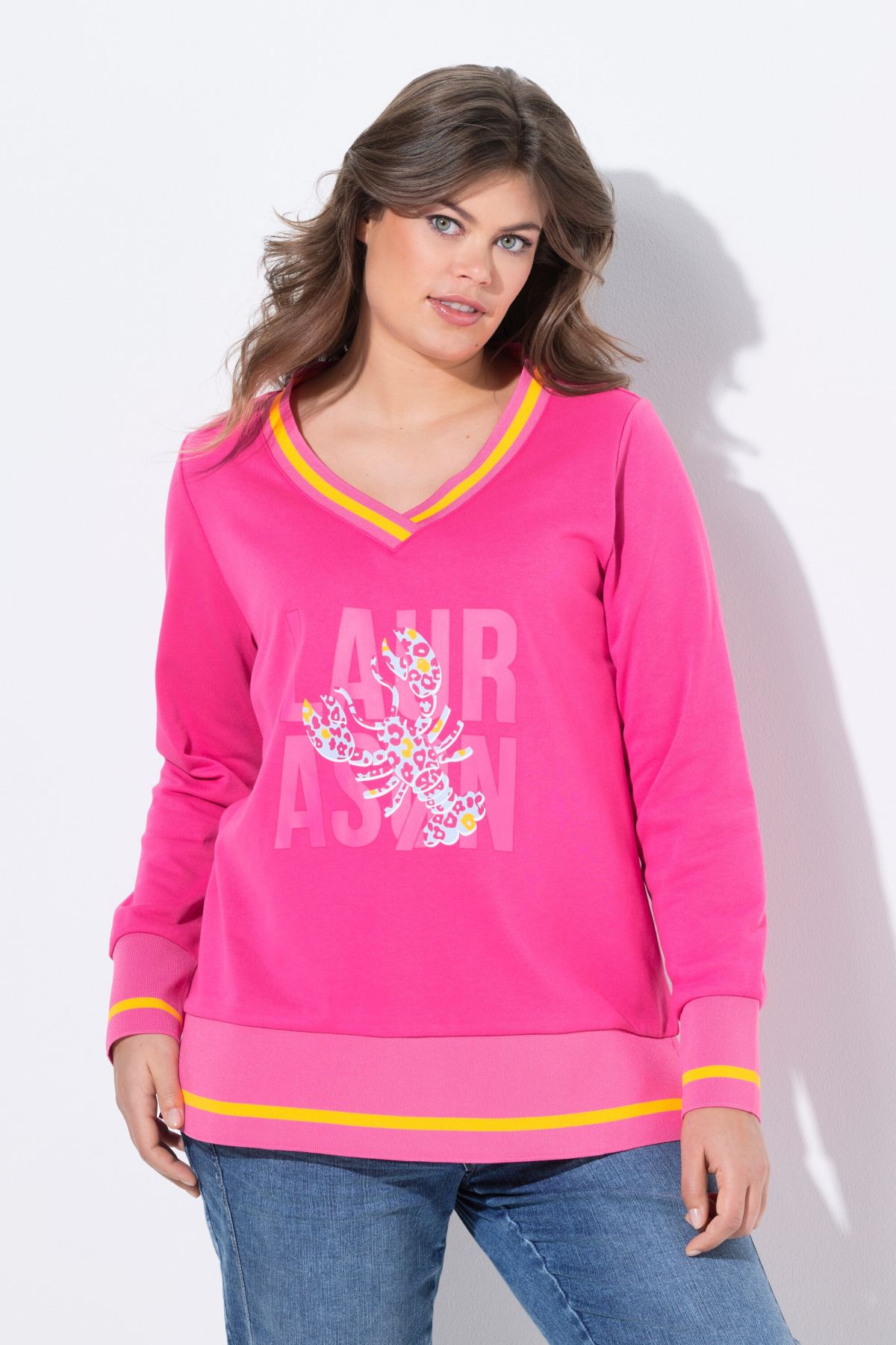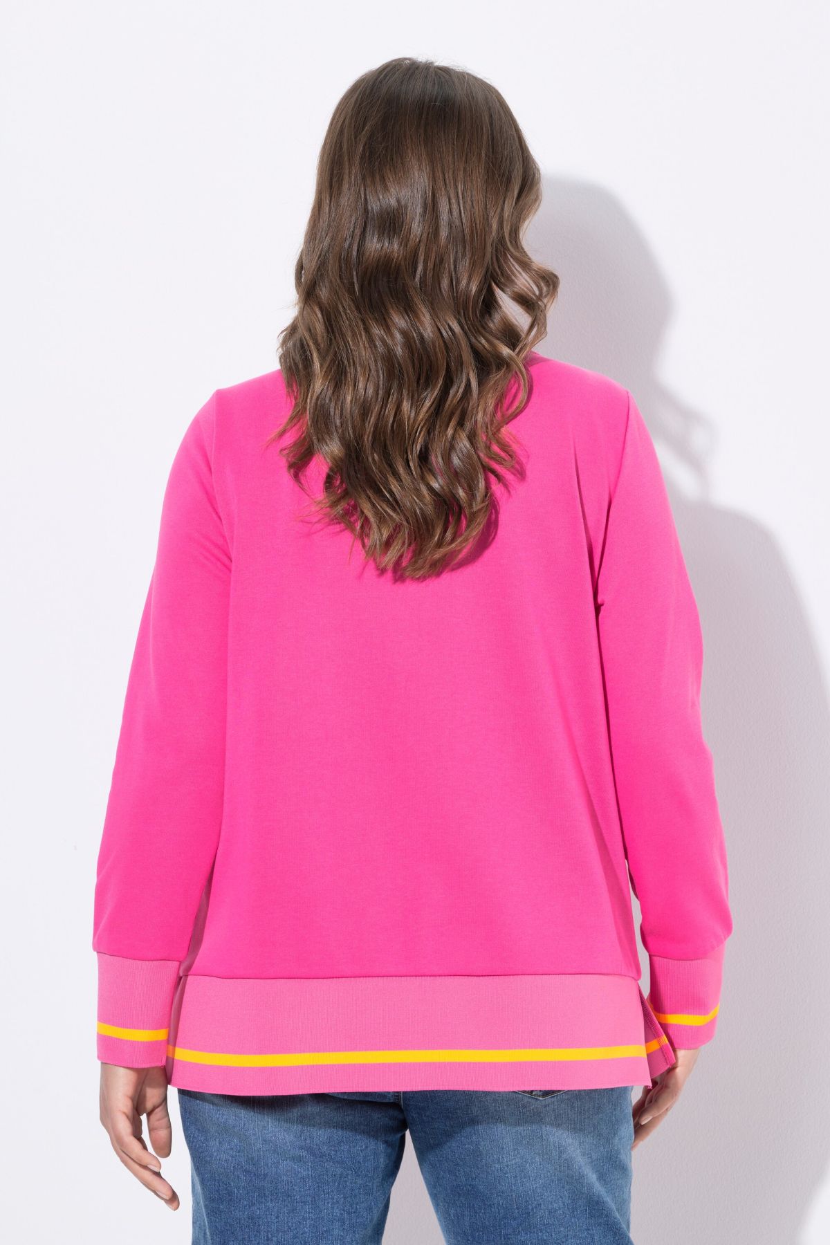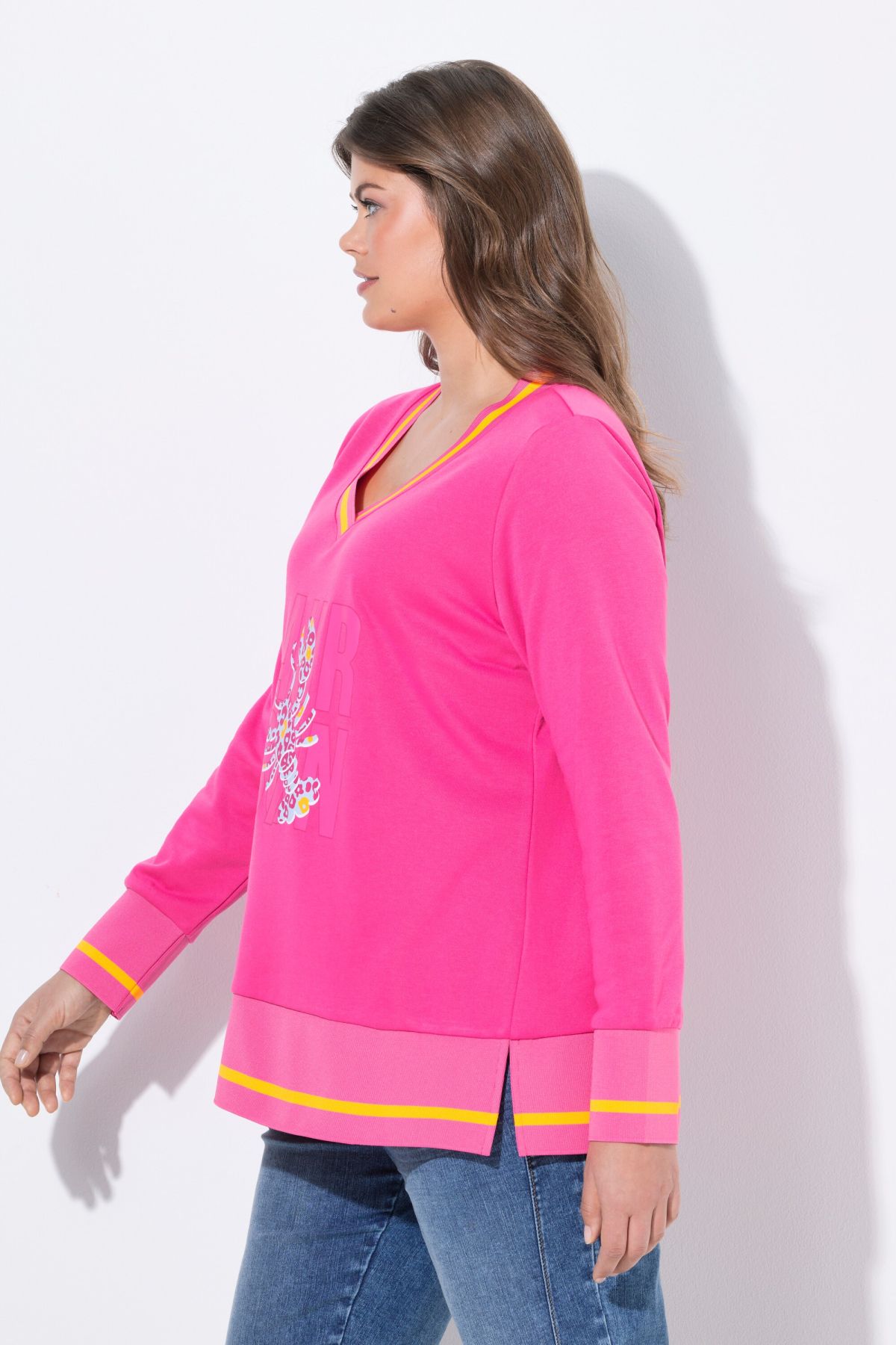 Суитчър с надпис отпред. С V - образно деколте и рипсен подгъв и маншети на дългите ръкави с контрастни райета. Мек и комфортен за ежедневието.