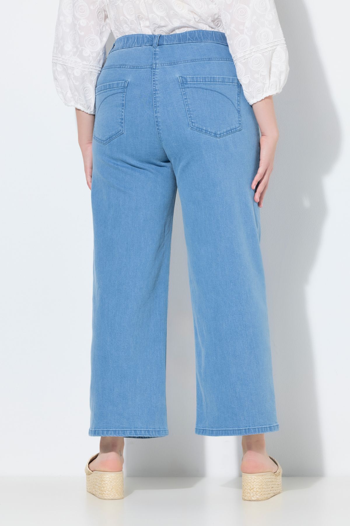 Дължина приблизително до коляното с широк крачол, модел с 5 джоба, еластична талия с гайки за колан, закопчаване с копчета и цип, устойчив органичен памук с еластан, вътрешен шев приблизително 72 см.