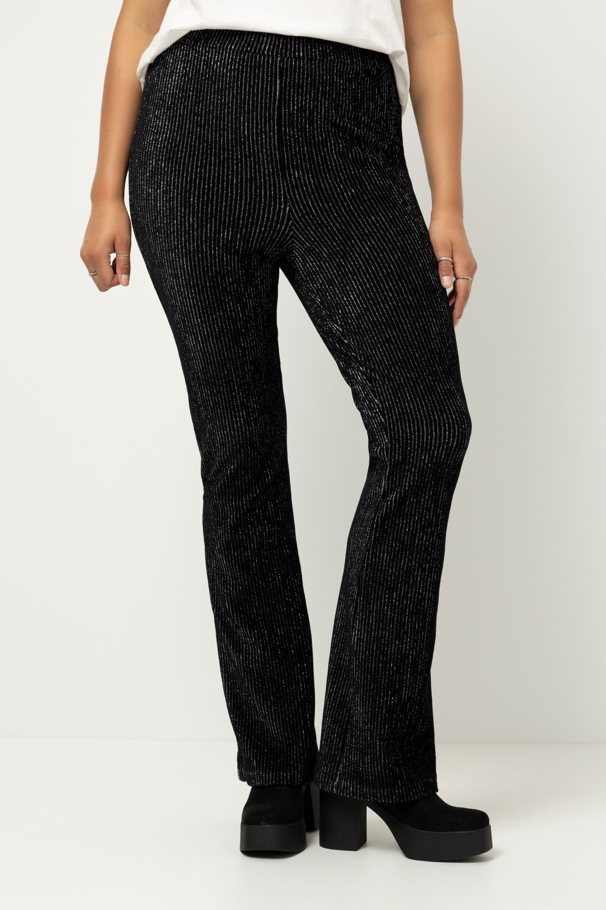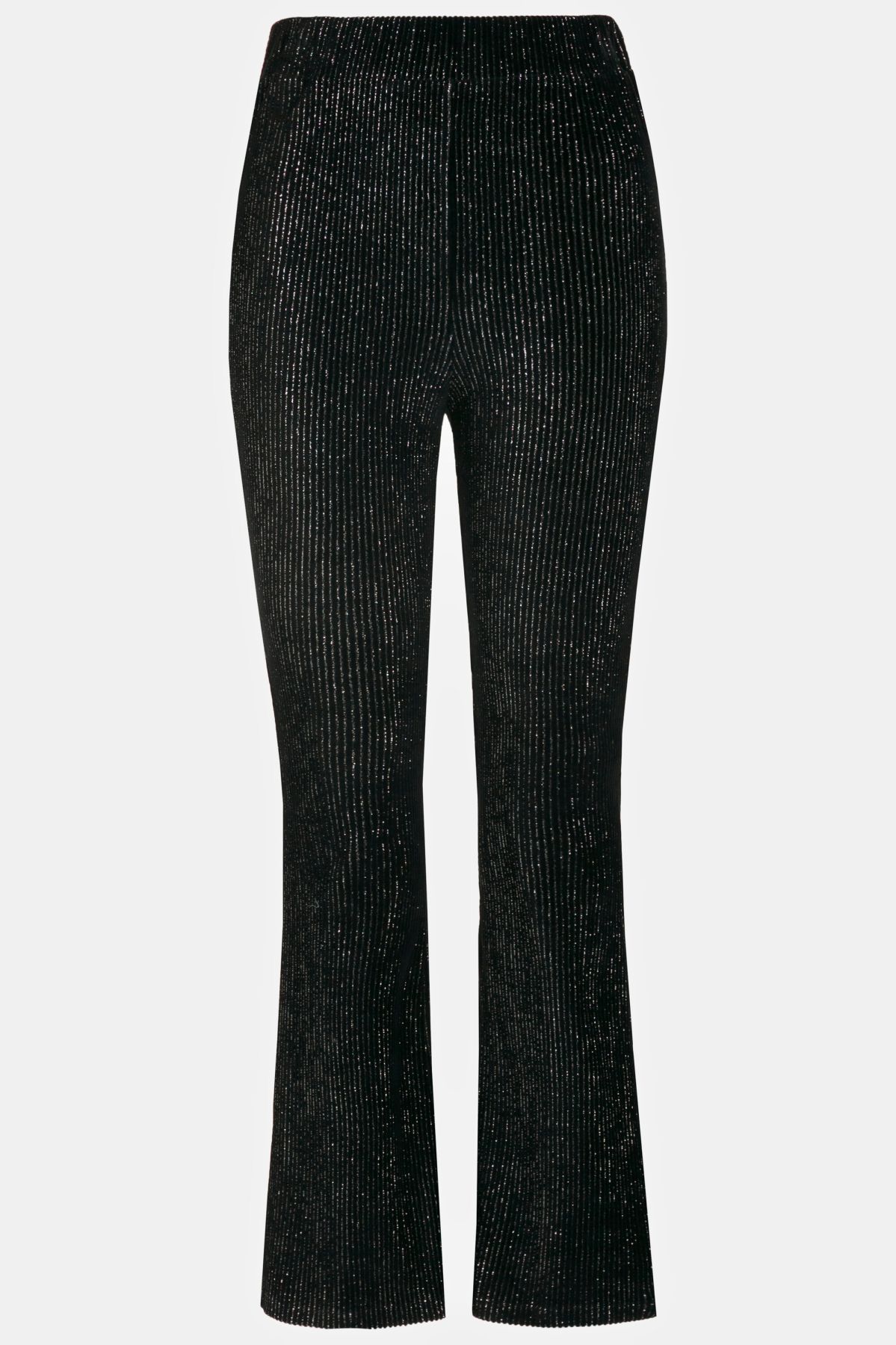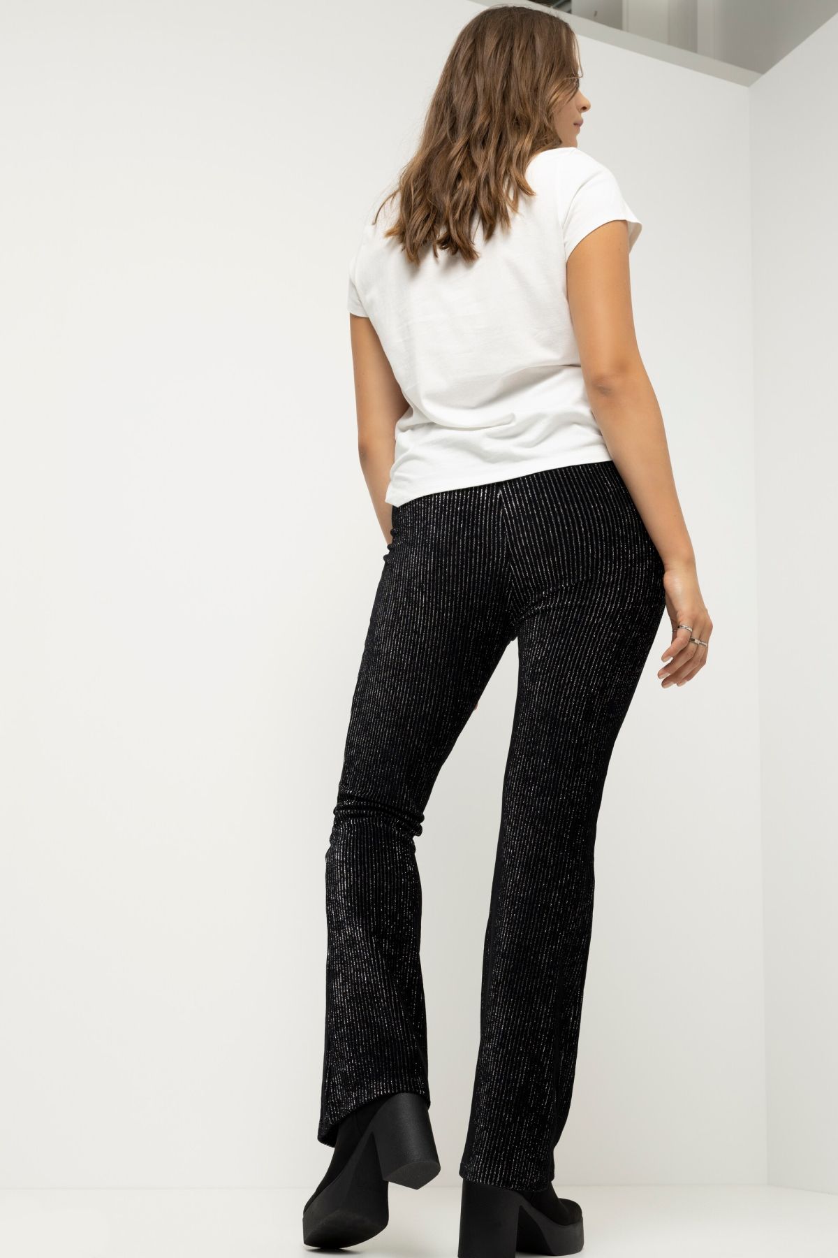 Панталон тип "чарлстон", изработен от меко кадифе с визия на рипсено кадифе и метален блясък. Тесен около крака, с модерен широк подгъв и еластична талия.