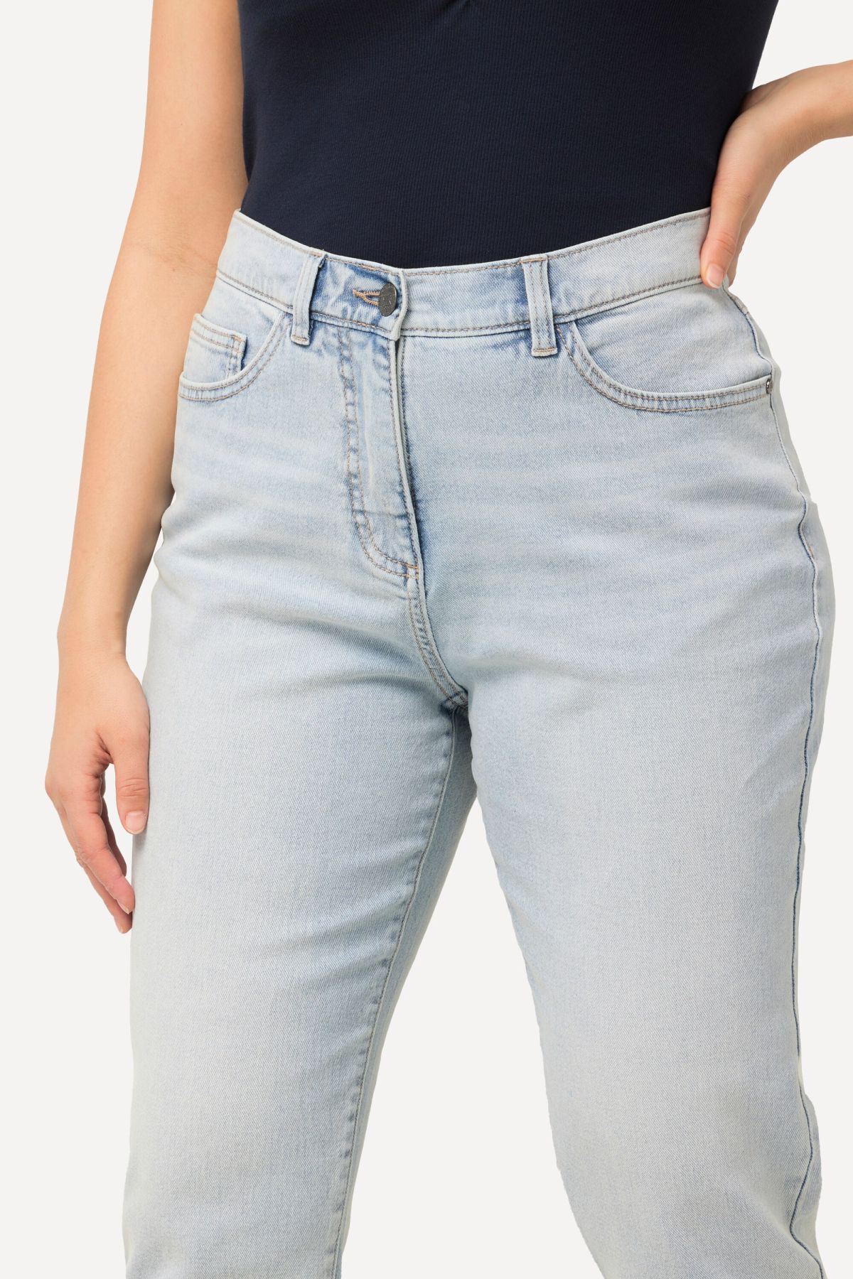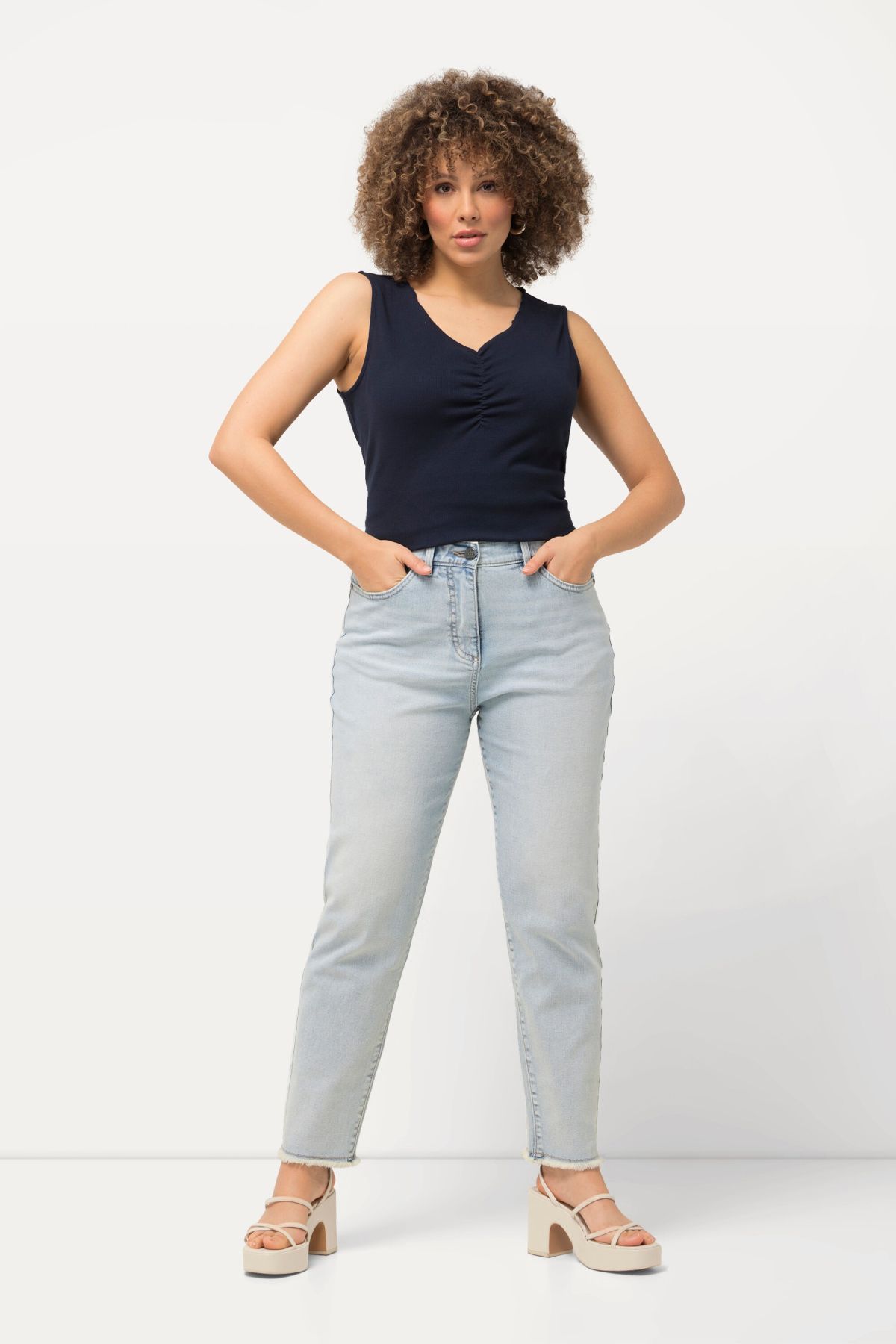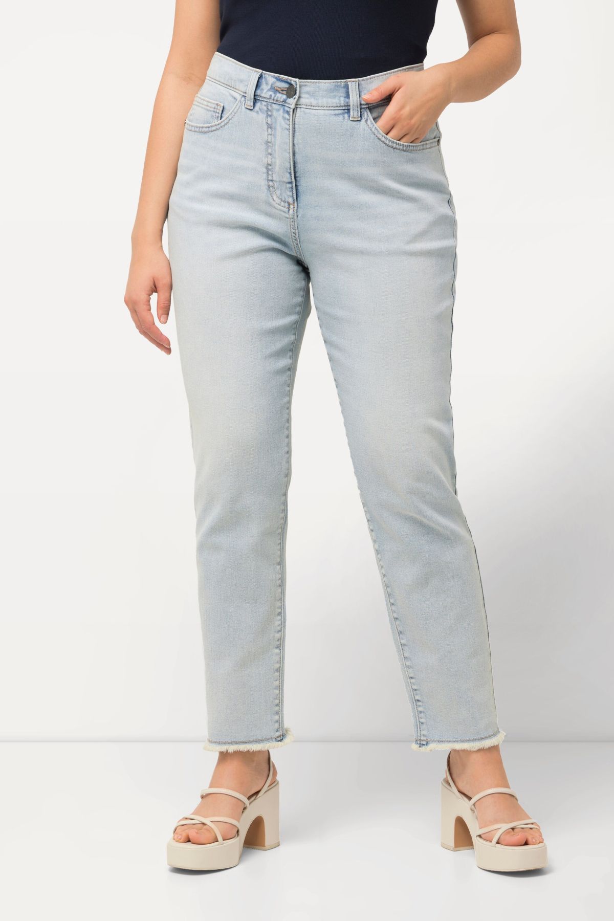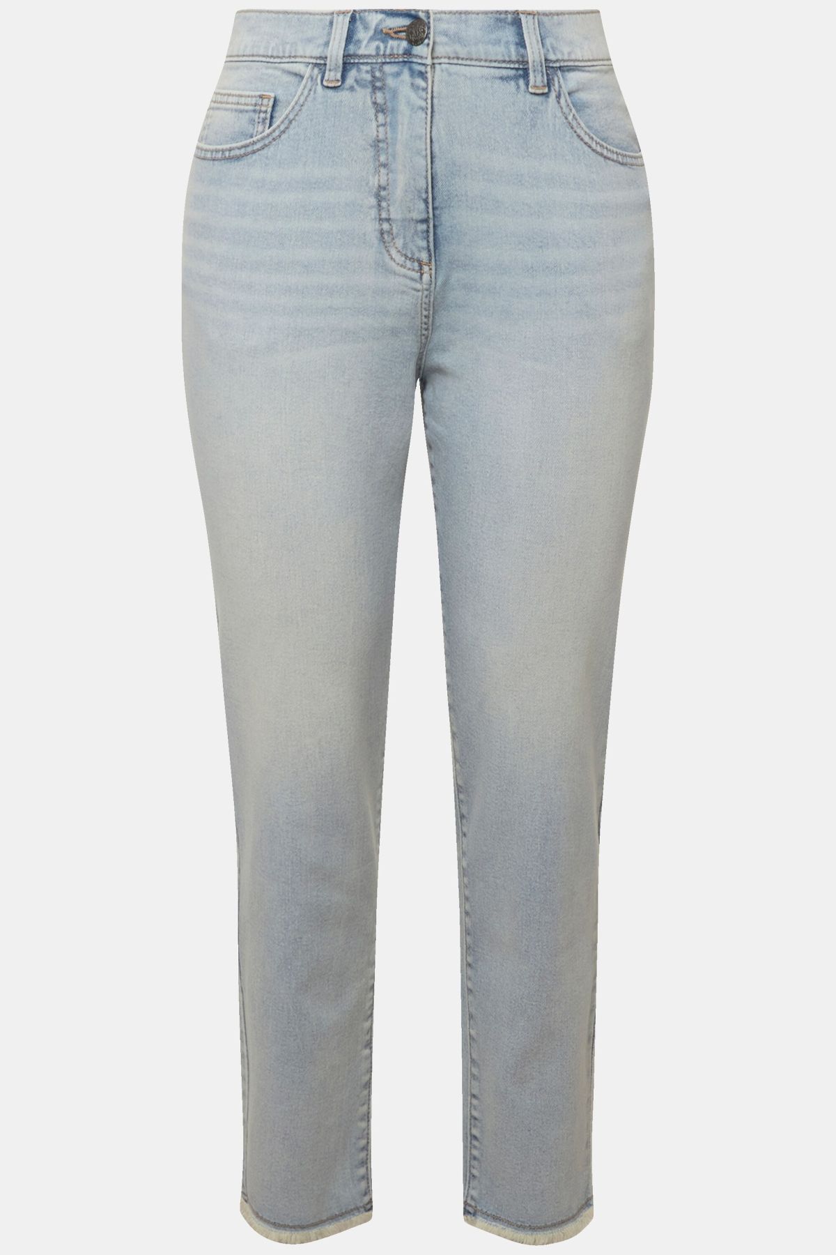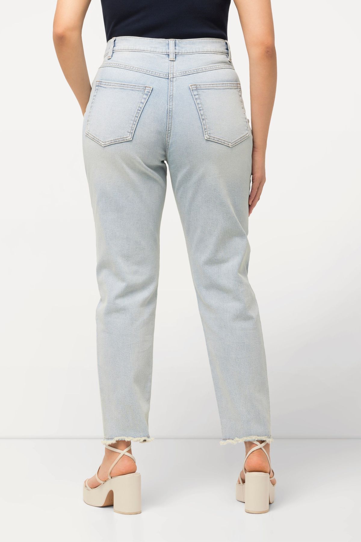 Еластични дънки тип Mom с модерни ресни на подгъва и светли цветове. Перфектни за лятната ваканция. С 5 джоба, гайки за колан на талията и копче и цип отпред.