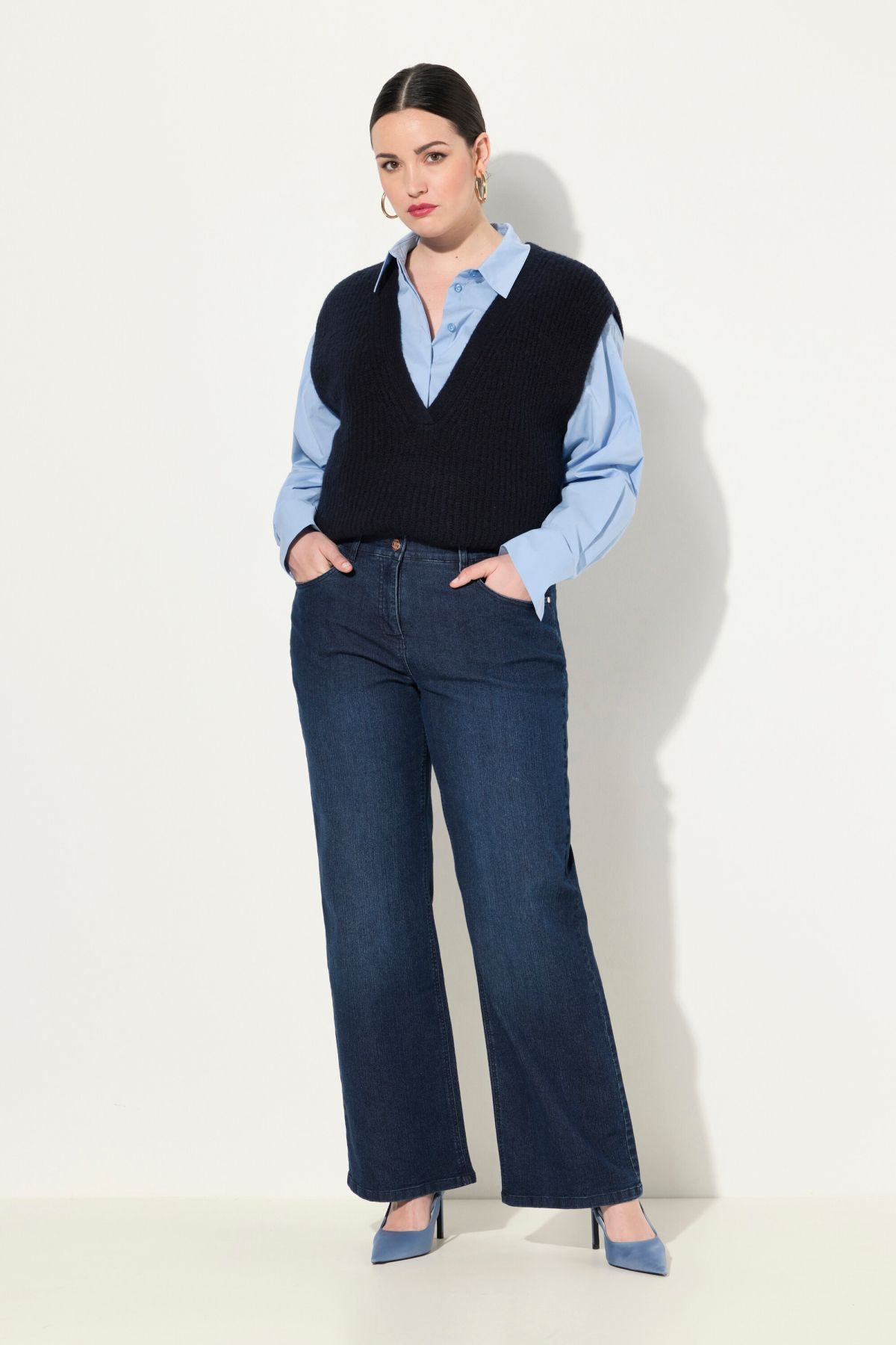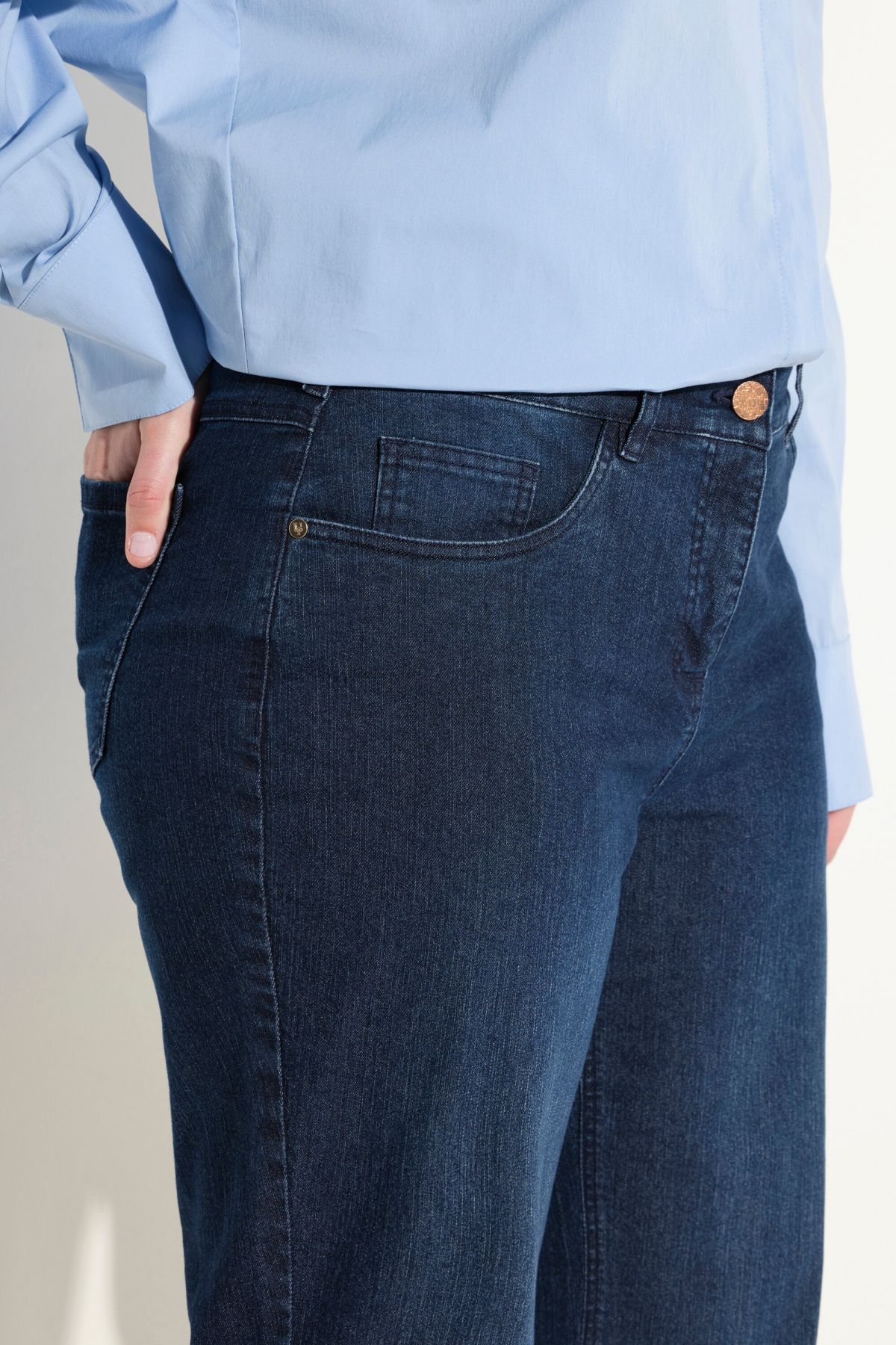 Приятно еластичен деним, широки крачоли, модна кройка с 5 джоба, колан с халки, закопчаване с копче и цип, вътрешен шев около 82 см.